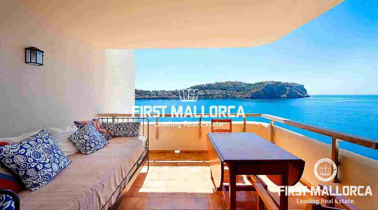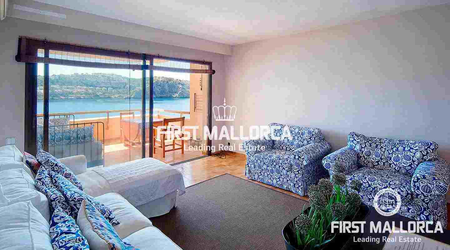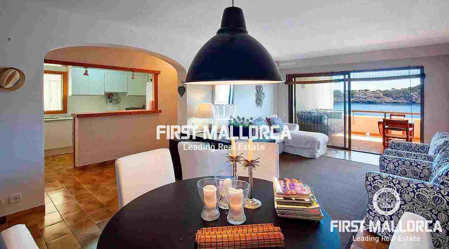 Dieses 2 Zimmer Meerblick-Apartment befindet sich in einer Anlage direkt am Meer gelegen in Puerto Andratx. Die Wohnung genießt eine sensationelle Aussicht auf das Meer und den Naturhafen. Die bebaute Fläche von 91 m2 beinhaltet eine überdachte 12 m2 Terrasse mit Meerblick. Die Aufteilung ist wie folgt: Eingangsbereich, Wohnzimmer, Essbereich und eine offene, komplett ausgestattete Küche, ein Hauptschlafzimmer mit Bad-suite, ein Schlafzimmer und ein separates Bad. Zu den weiteren Ausstattungsmerkmalen gehören: Klimaanlage kalt, Einbauschränke und ein Stauraum. Die Anlage verfügt über einen direkten Meerzugang, einen großzügigen Poolbereich mit Sonnenterrassen, ein Kinderbecken, Aufzug und Parkplätze.
