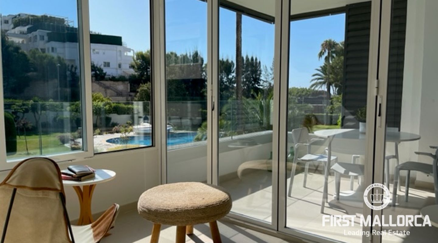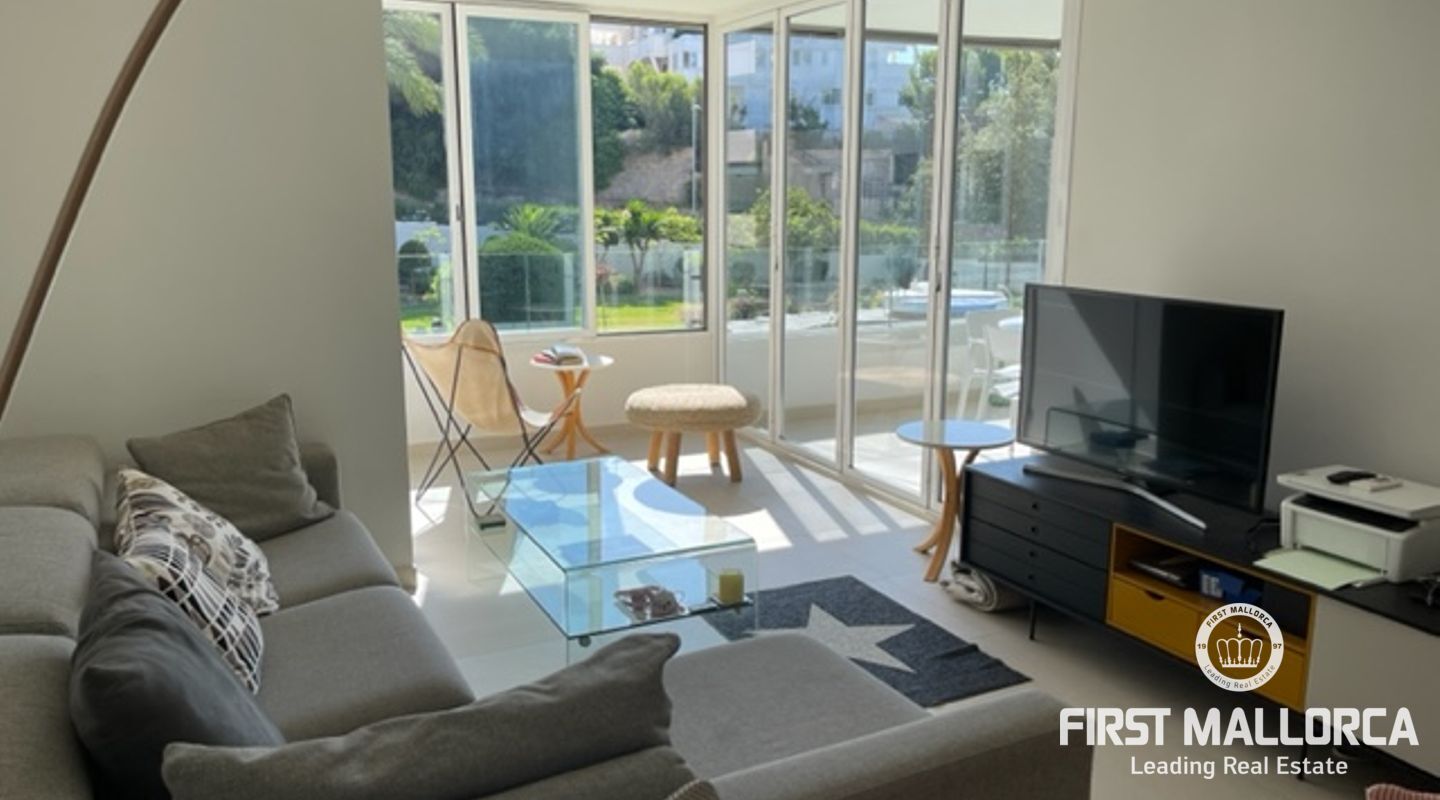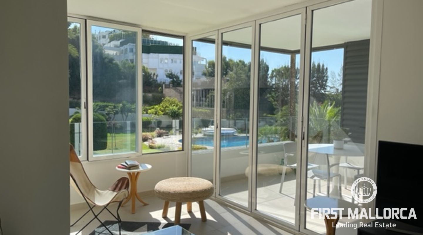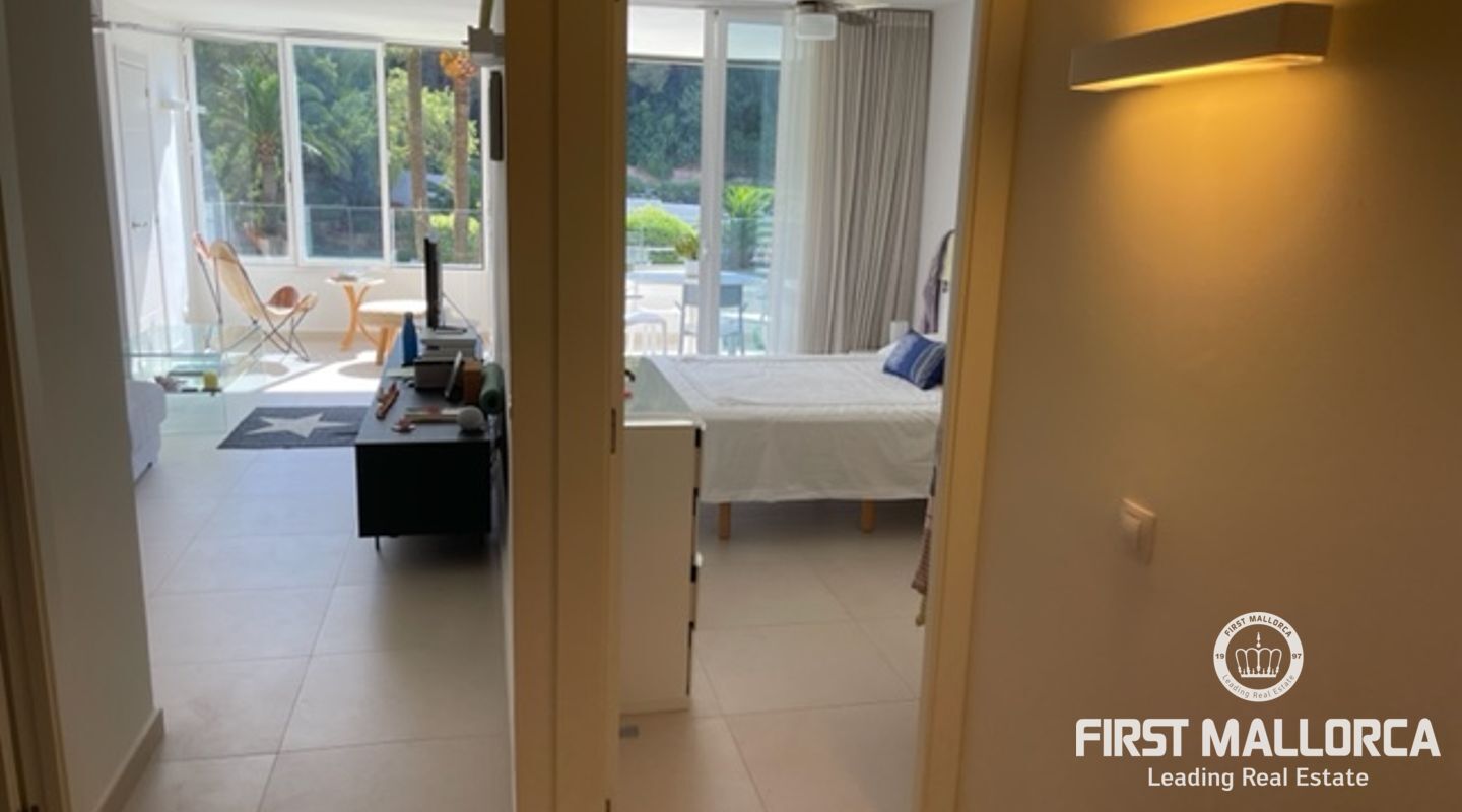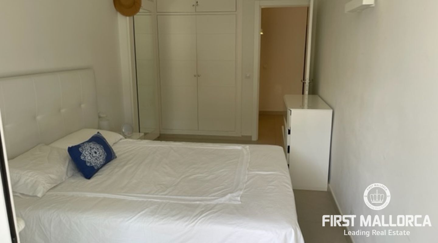 Diese helle und geschmackvoll renovierte Wohnung mit zwei Schlafzimmern befindet sich in einer erstklassigen Lage, nur wenige Gehminuten vom luxuriösen Yachthafen Puerto Portals entfernt. Die Wohnung bietet ein helles Wohnzimmer mit direktem Zugang zur Terrasse mit Blick auf den Gemeinschaftsgarten und den Gemeinschaftspool, eine voll ausgestattete moderne Küche und zwei Schlafzimmer mit ihren jeweiligen Bädern.