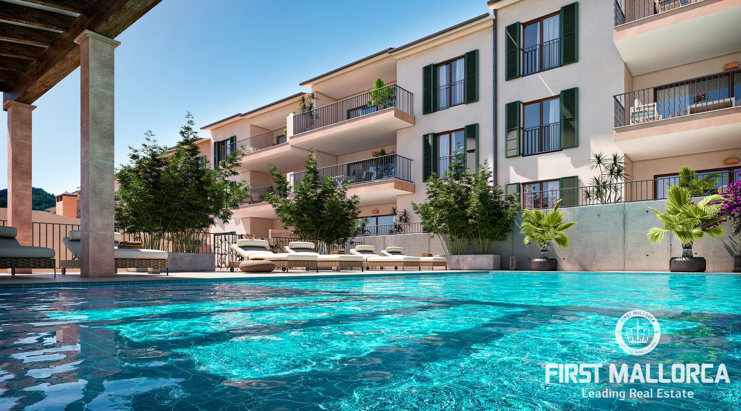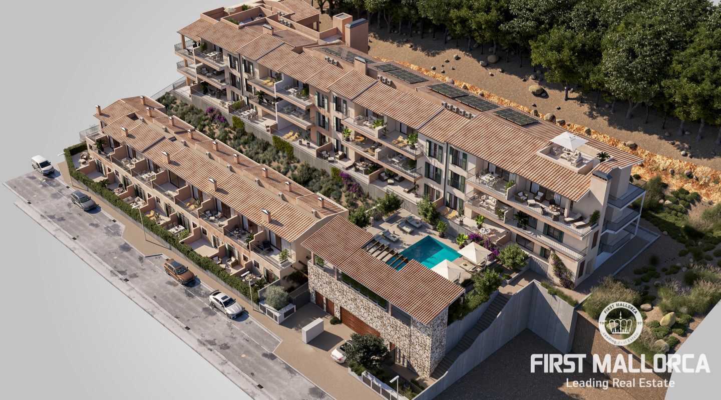 Modern und doch mallorquin gehalten werden am Stadtrand 23 Neubauwohnungen und neun Stadthäuser entstehen. Die Anlage wird über einen Gemeinschaftspool und einen Garten verfügen und bietet genug Parkplätze für alle.