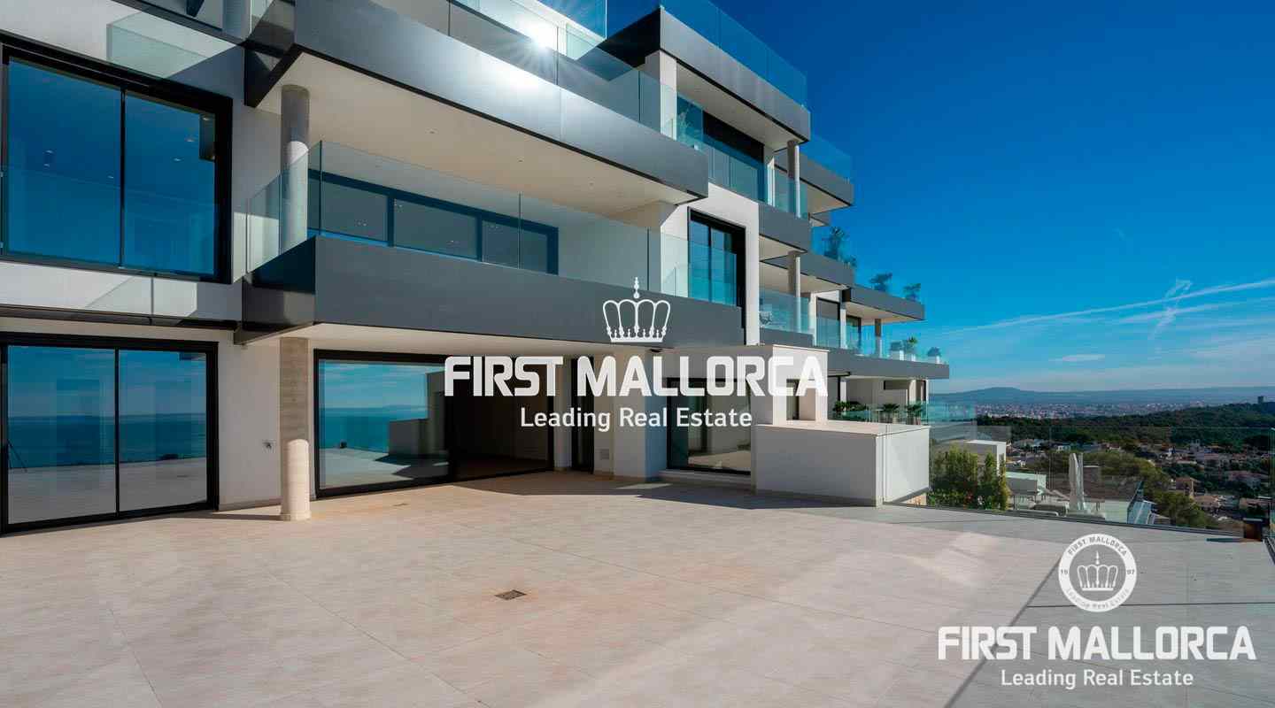 Dieses neue, exklusive Apartment genießt einen atemberaubenden Ausblick auf die Stadt und die Bucht von Palma de Mallorca im Südwesten der Insel.