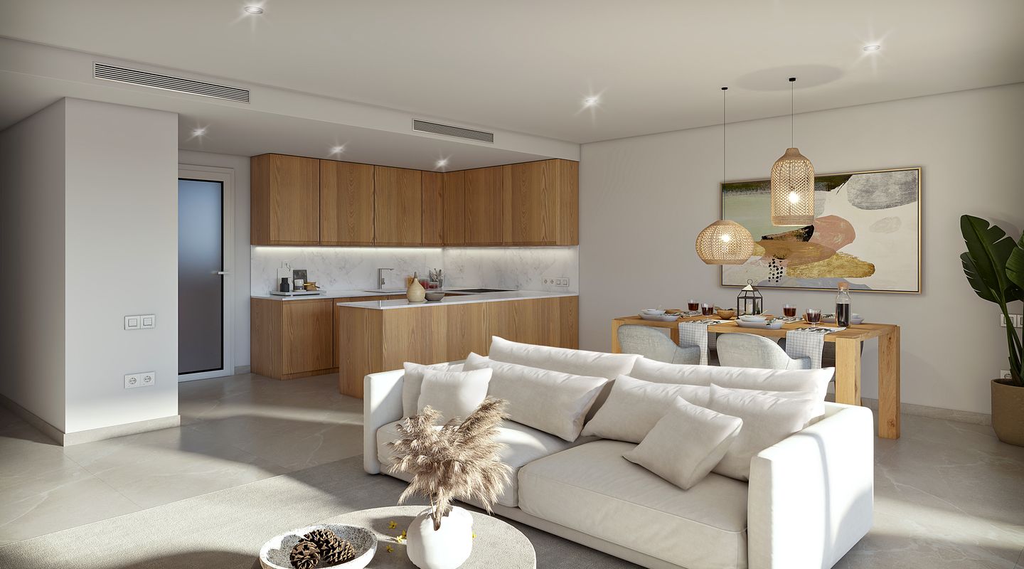 Modern und doch mallorquin gehalten werden am Stadtrand 23 Neubauwohnungen und neun Stadthäuser entstehen. Die Anlage wird über einen Gemeinschaftspool und einen Garten verfügen und bietet genug Parkplätze für alle.