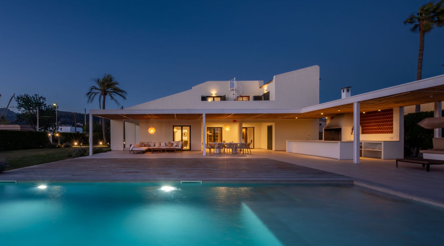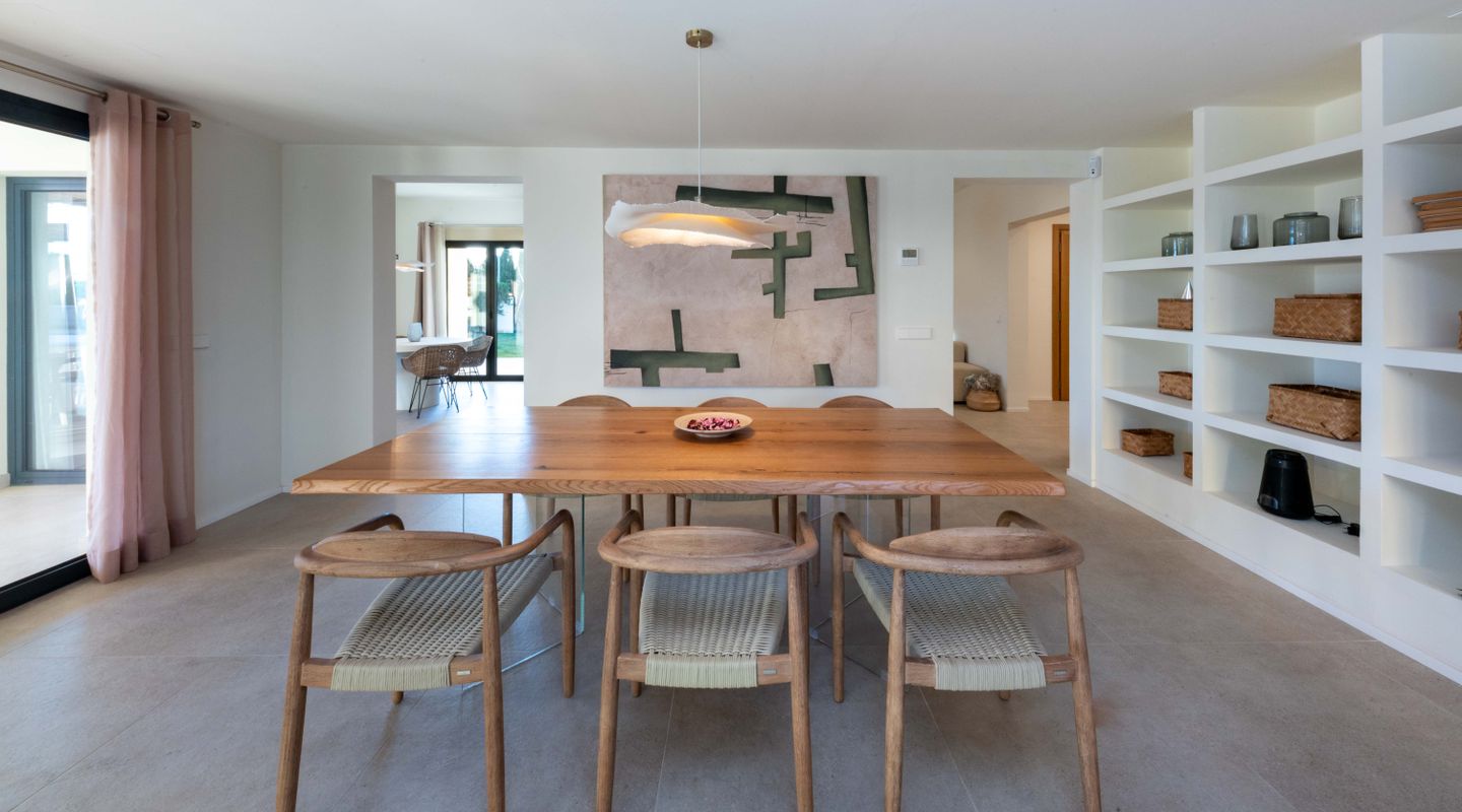 Das Haus ist überwiegend auf einer Ebene verteilt und wurde so gestaltet, dass es maximalen Komfort und Privatsphäre bietet. Es verfügt über großzügige und lichtdurchflutete Räume, ein elegantes Wohnzimmer, ein separates Esszimmer sowie eine moderne, voll ausgestattete Küche mit direktem Zugang zur Terrasse und zum Poolbereich.