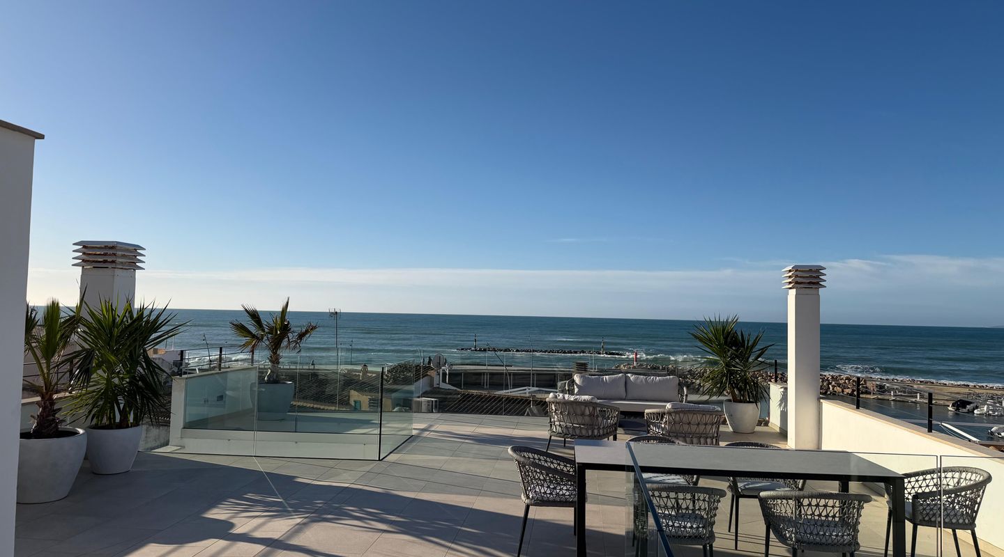 Im Obergeschoss befindet sich eine großzügige Sonnenterrasse von ca. 118 m², von der aus Sie atemberaubende Ausblicke auf das Meer und die reizvolle Umgebung genießen können. Ein interner Aufzug verbindet alle Etagen der Immobilie, und eine private Garage mit Ladestation für Elektrofahrzeuge erhöht den Komfort und die Exklusivität dieser besonderen Immobilie zusätzlich.