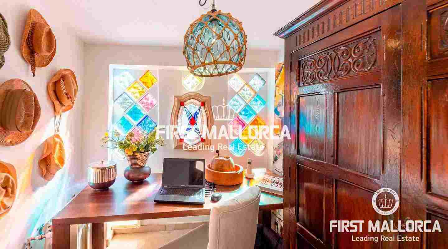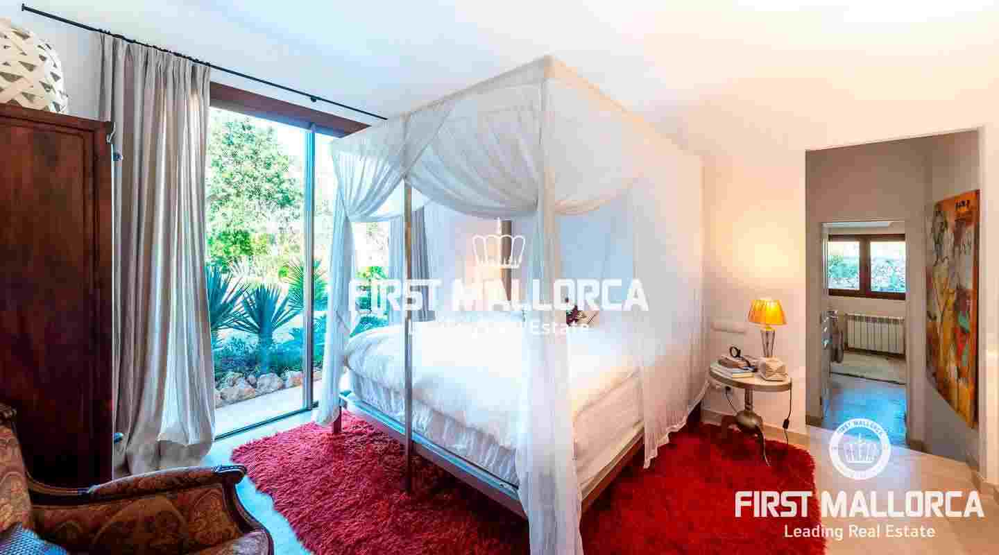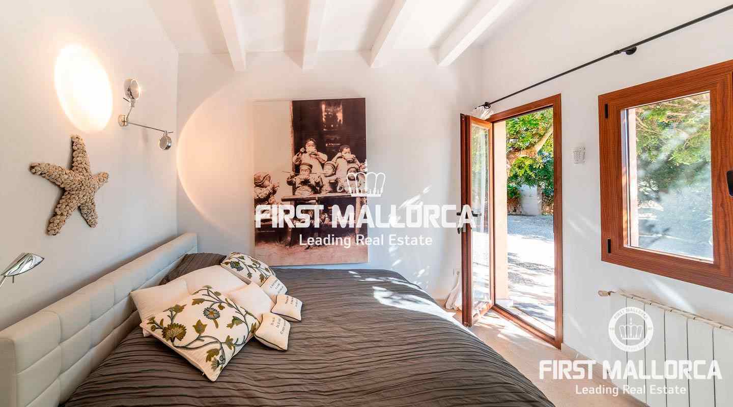 Das Erdgeschoss besteht aus dem offenen Wohnzimmer mit Kamin, einer exklusiven, voll ausgestatteten Birgitt Müller Küche, 2 Schlafzimmern, eines davon mit Bad en suite, und einem separaten Bad. Im Obergeschoss befindet sich das Gästeapartment, das derzeit als Büro genutzt wird und über einen eigenen Eingang, ein Bad en suite und einen atemberaubenden Blick auf die Insel Cabrera verfügt. Die Finca ist ausgestattet mit Öl-Zentralheizung, Klimaanlage, eigenem Brunnen, Zisterne und Bewässerungsanlage.