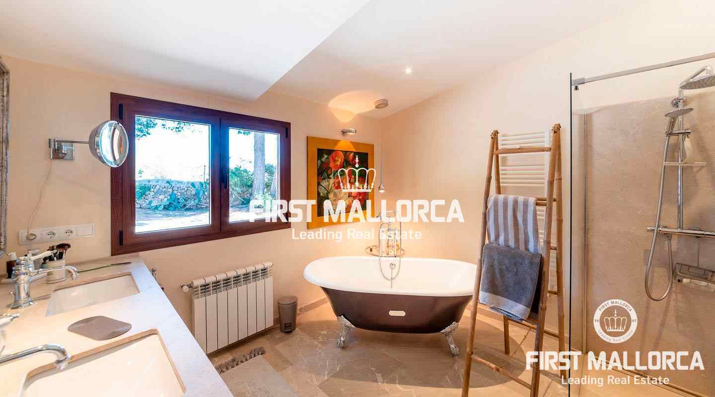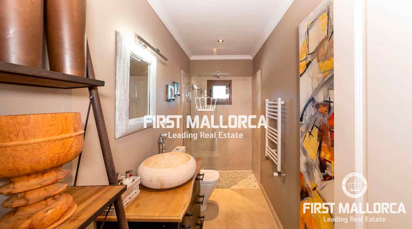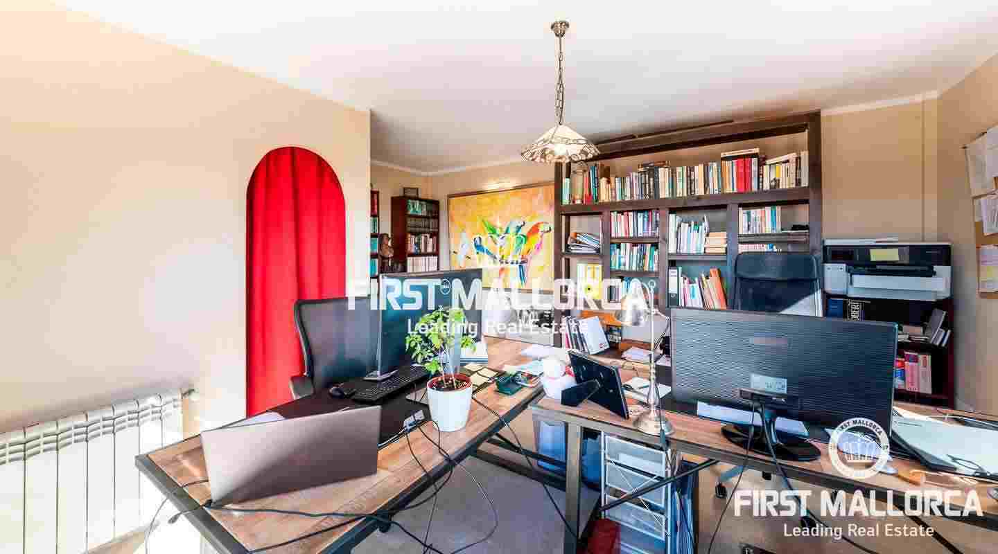 Das Erdgeschoss besteht aus dem offenen Wohnzimmer mit Kamin, einer exklusiven, voll ausgestatteten Birgitt Müller Küche, 2 Schlafzimmern, eines davon mit Bad en suite, und einem separaten Bad. Im Obergeschoss befindet sich das Gästeapartment, das derzeit als Büro genutzt wird und über einen eigenen Eingang, ein Bad en suite und einen atemberaubenden Blick auf die Insel Cabrera verfügt. Die Finca ist ausgestattet mit Öl-Zentralheizung, Klimaanlage, eigenem Brunnen, Zisterne und Bewässerungsanlage.