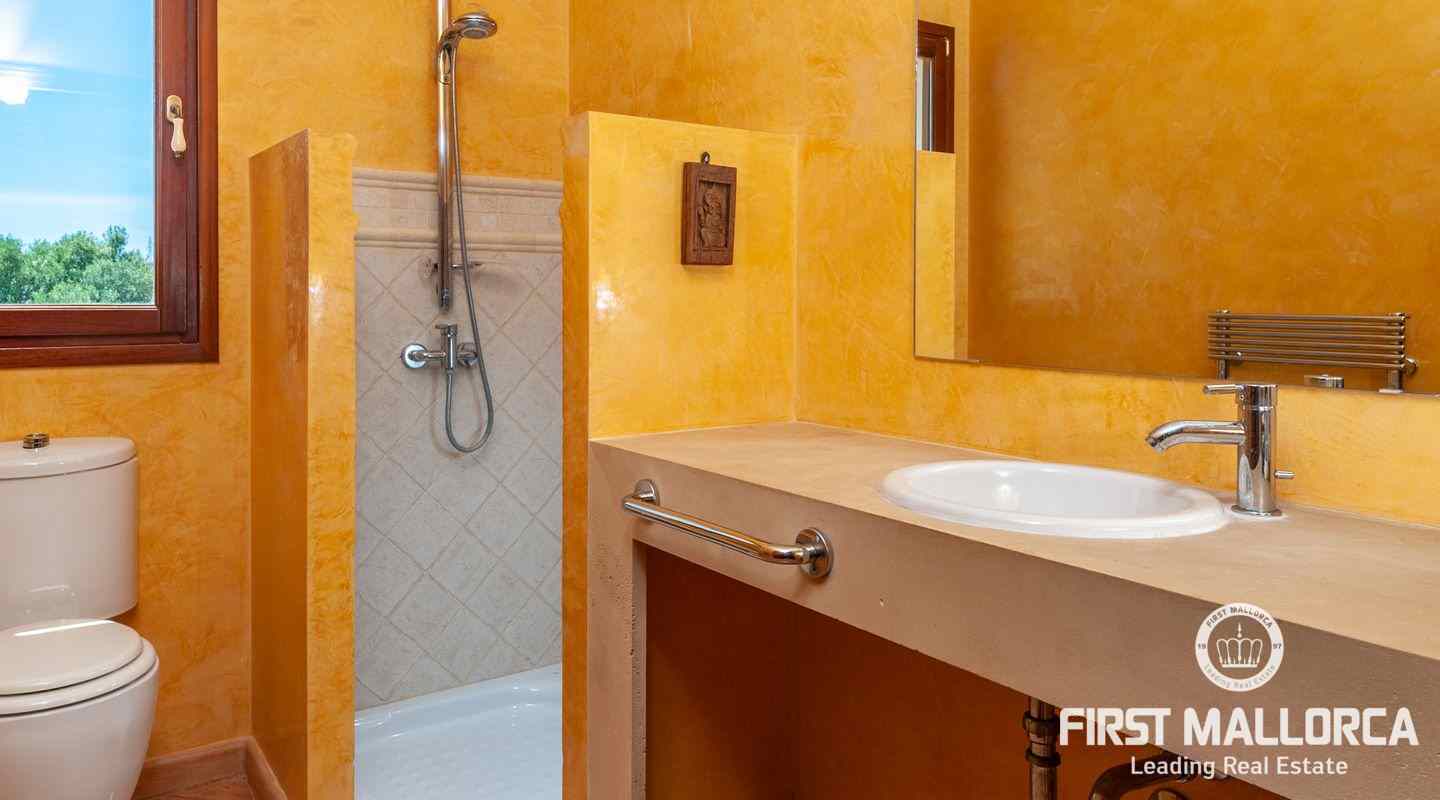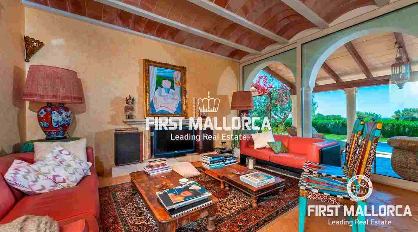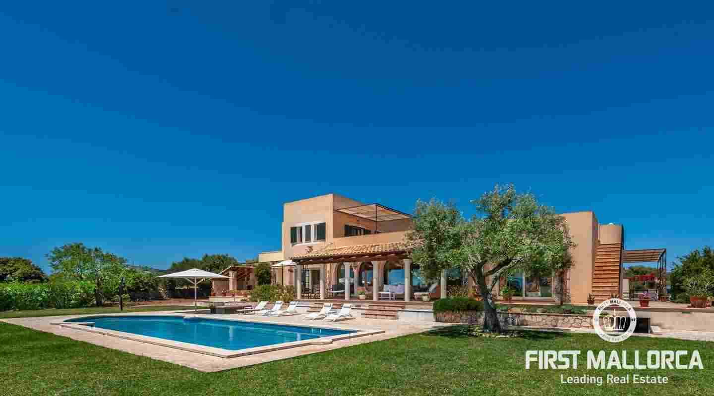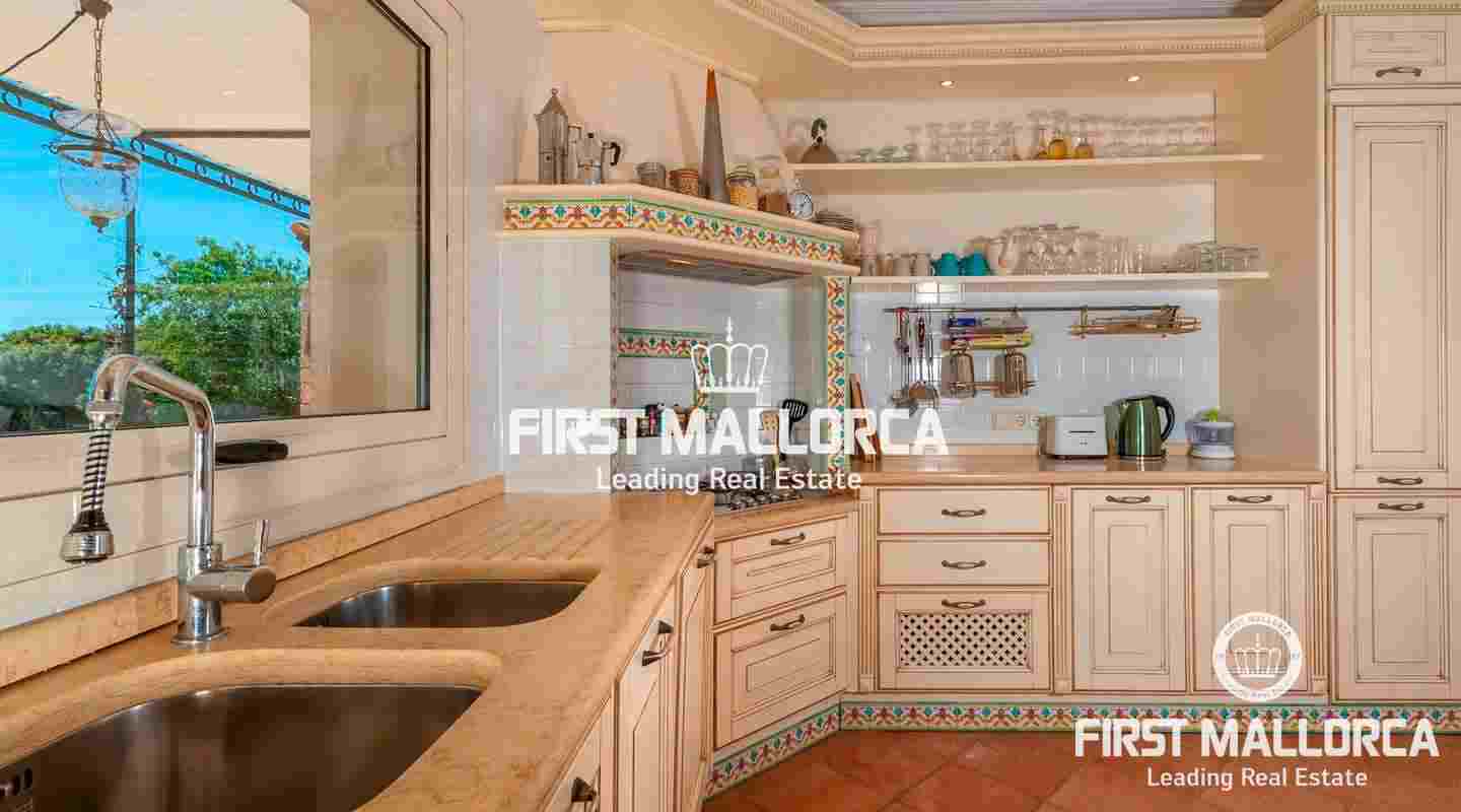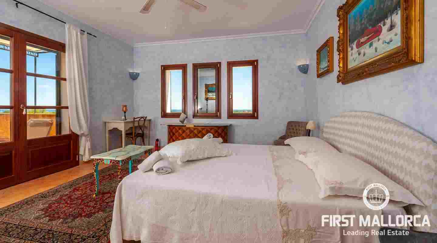 Die Finca verfügt über ein großzügiges Wohn-/ Esszimmer mit Kamin, großen Glasfronten sowie Zugang zu einer überdachten Terrasse, welche einen Blick auf den Pool und das Meer bietet. Ebenfalls ebenerdig befinden sich eine voll ausgestattete Einbauküche mit angrenzender Waschküche, 2 Abstellräume, ein Gästebad und 2 Schlafzimmer mit Bad en suite. Im Obergeschoss gibt es 3 weitere Schlafzimmer, jeweils mit Bad en Suite und eigener Terrasse.