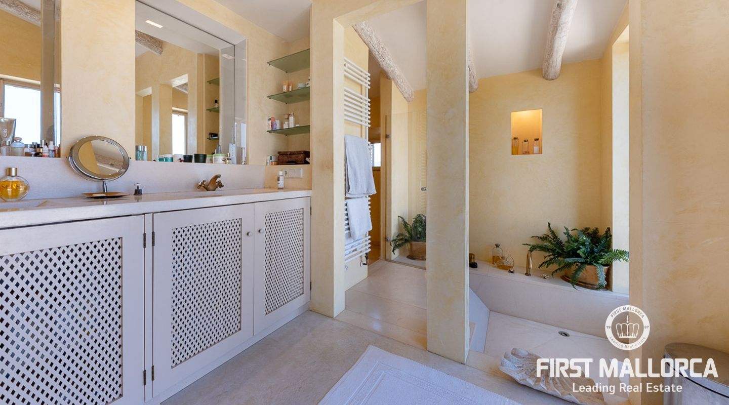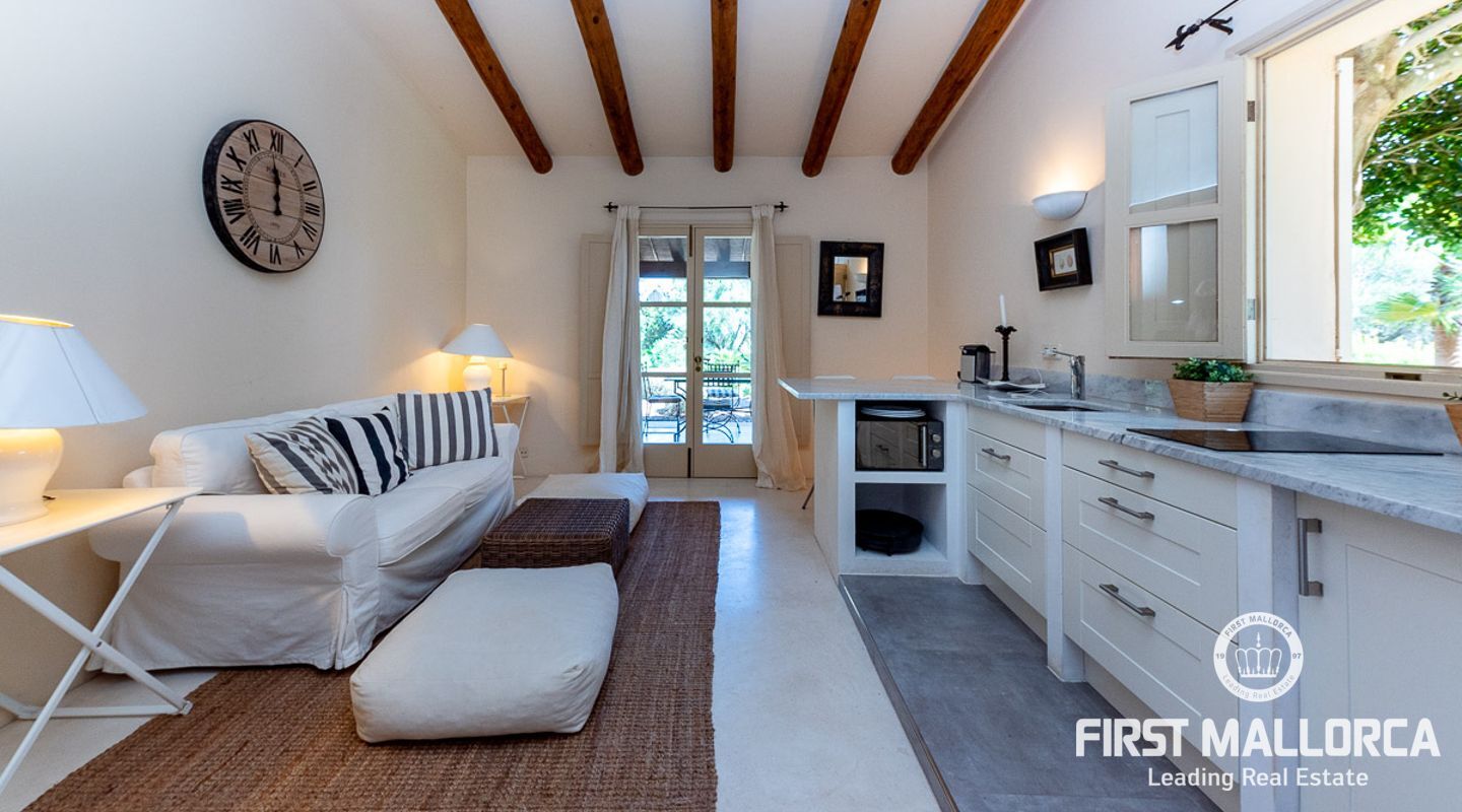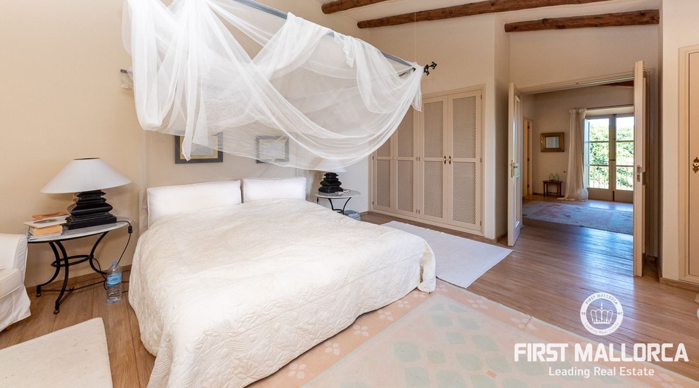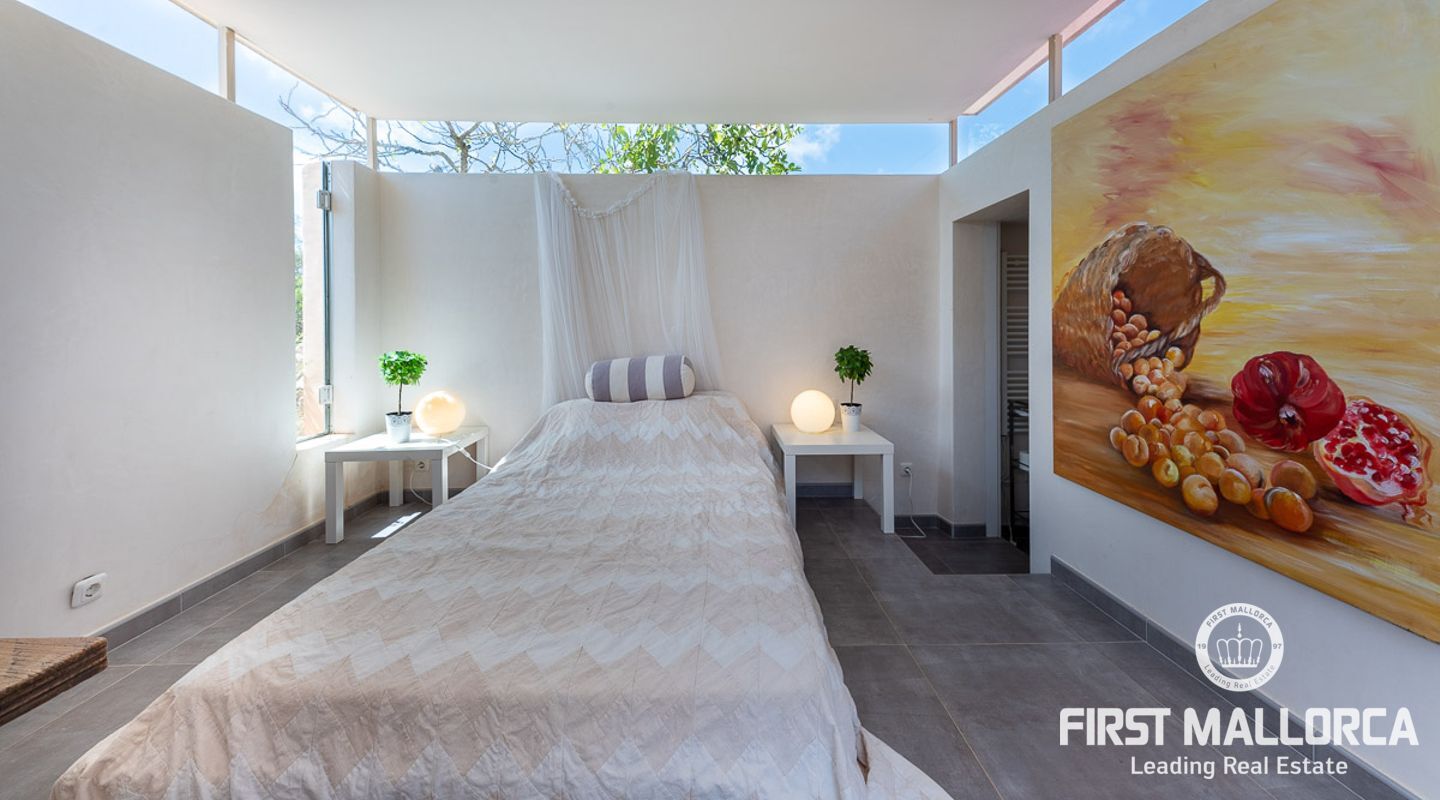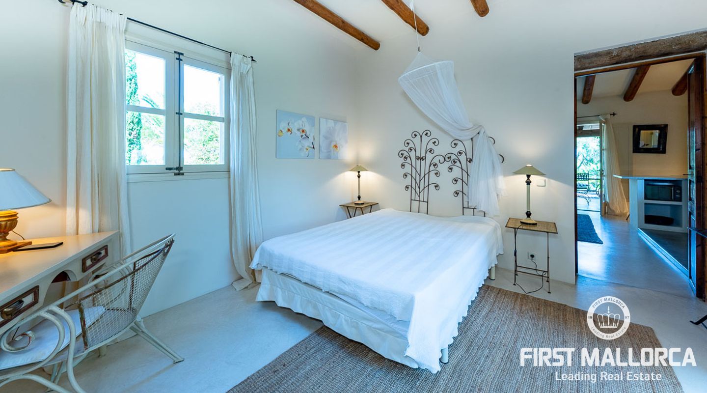 Es wurde im Landhausstil gebaut und bietet viele offene Strukturen und Freiräume. Das Haupthaus bietet Ihnen drei vollwertige Schlafzimmer. Im Erdgeschoss finden Sie die Küche, das Esszimmer, den Wohnraum und ein Kaminzimmer. Des Weiteren befinden sich im Erdgeschoss zwei Gästeschlafzimmer mit eigenem Wohnraum, so dass diese durch einen separaten Eingang auch unabhängig genutzt werden können. Das Obergeschoss beherbergt das Master Schlafzimmer mit privater Terrasse mit Meerblick. Von außen zugänglich gibt es zudem ein weiteres Gästeapartment.