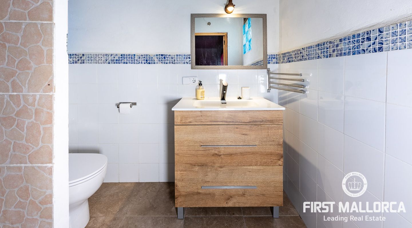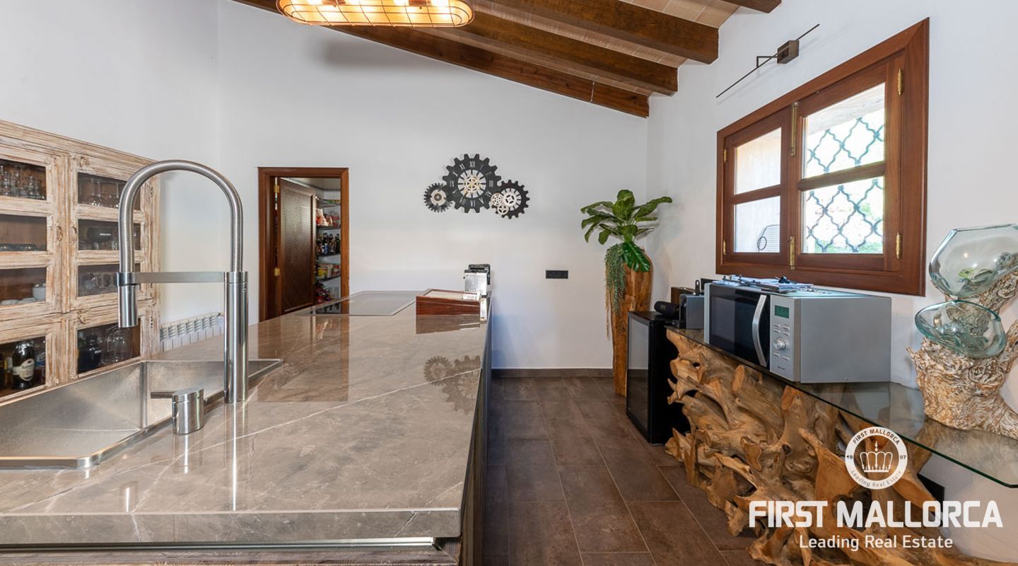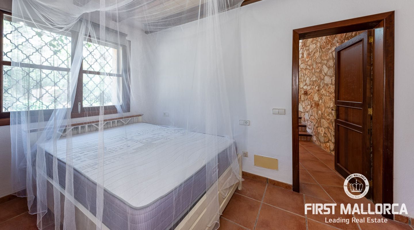 Im Erdgeschoss der Finca befindet sich ein großer Raum mit elegantem Mikrozementboden und gemütlichem Kamin, der derzeit als Lagerraum für Wassersportausrüstung und Motorräder genutzt wird, aber vielseitig nutzbar ist. Eine zusätzliche Abstellkammer und ein Badezimmer mit Dusche sind praktisch für Gartenpartys oder die Poolnutzung. Eine bezaubernde Einliegerwohnung mit eigenem Eingang verfügt über einen kombinierten Schlaf- und Wohnbereich, ein eigenes Badezimmer und einen großzügigen Ankleidebereich. Ein separater Bereich bietet Platz für eine Küchenzeile.