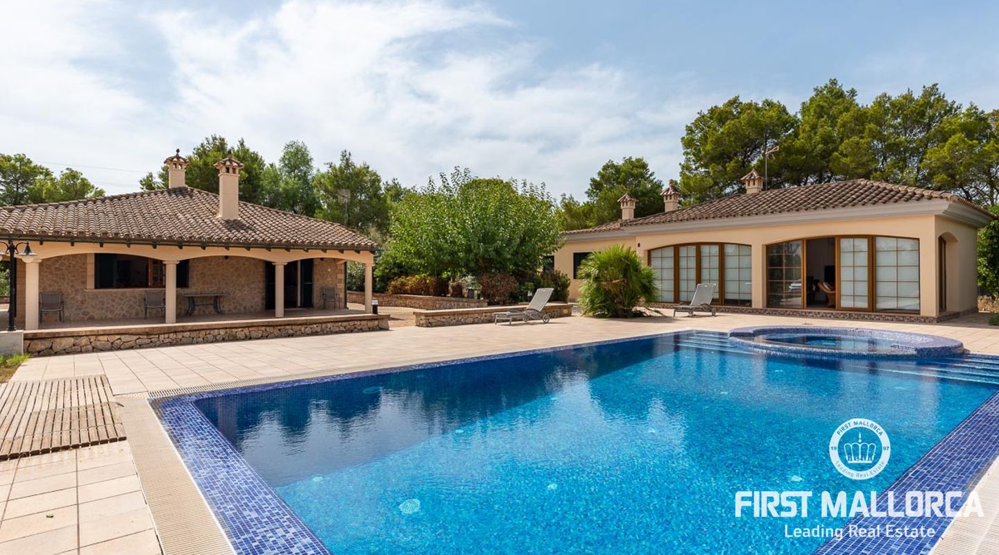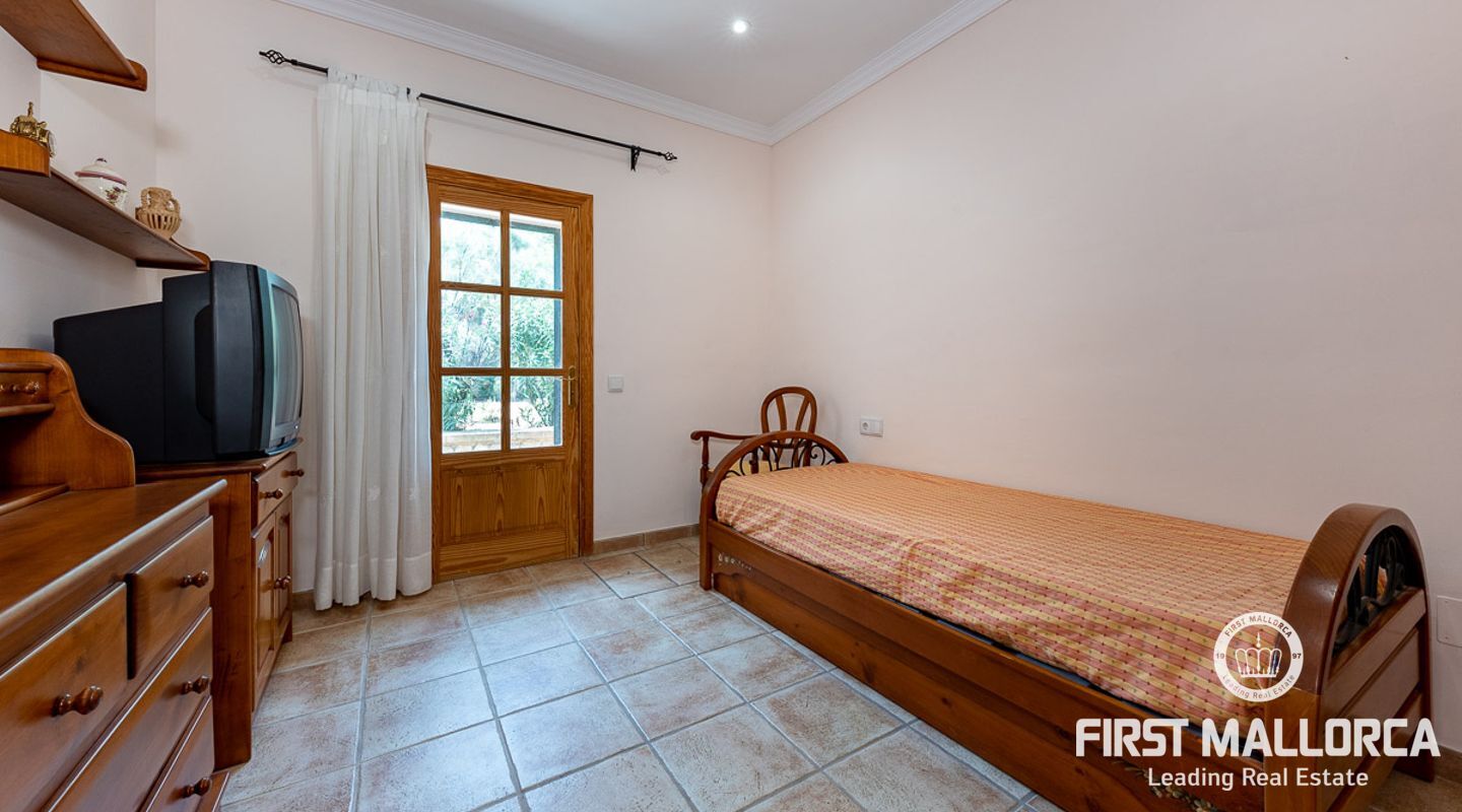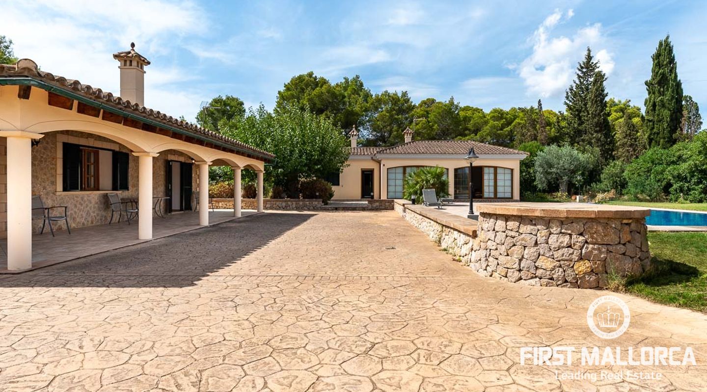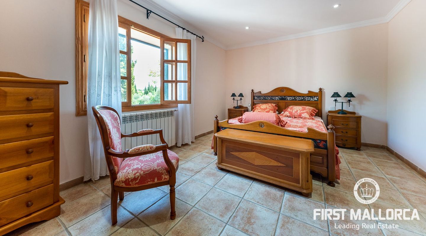 Dieses schöne Landgut ist auf einem Grundstück von 15000m2 mit einem großen gepflegten Garten, einem Ruhebereich mit Schwimmbad und Jacuzzi, einem Haupthaus und einem Gästehaus gebaut. Die Gesamtfläche des Grundstücks ist etwa 300m2. Das Haupthaus ist im mediterranen Stil erbaut und besteht aus einem geräumigen Wohn-Esszimmer mit Zugang zur überdachten Terrasse und zum Poolbereich, einer separaten voll ausgestatteten Küche, 3 Schlafzimmern und einem Badezimmer. Es gibt auch einen Keller, der als Weinkeller und/oder Lagerraum genutzt werden könnte. Das Gästehaus besteht aus einem Wohnzimmer mit Panoramafenstern, einer offenen Küche, einem Schlafzimmer und einem Bad mit Dusche. Der Außenbereich verfügt über einen gesalzenen Swimmingpool mit Selbstreinigungssystem und Jacuzzi, einen überdachten Parkplatz für zwei Autos und einen großen Obstgarten mit automatischem Bewässerungssystem. Das Haupthaus und das Gästehaus sind mit einer Öl-Zentralheizung und Klimaanlagen in allen Räumen ausgestattet. Es gibt Sonnenkollektoren, einen Brunnen und automatische Eingangstore. Das Haus befindet sich in einer ruhigen Wohngegend und bietet maximale Privatsphäre und eine privilegierte Nachbarschaft. Die internationale Schule "The Academy International School" befindet sich in der Nähe. Die Stadt Palma und die wichtigsten Einkaufs- und Freizeitzentren sind in 15 Minuten mit dem Auto zu erreichen.