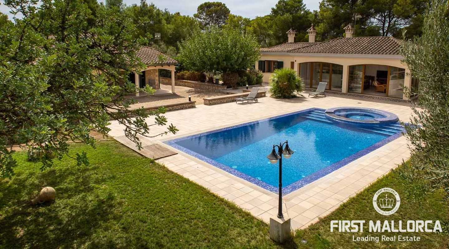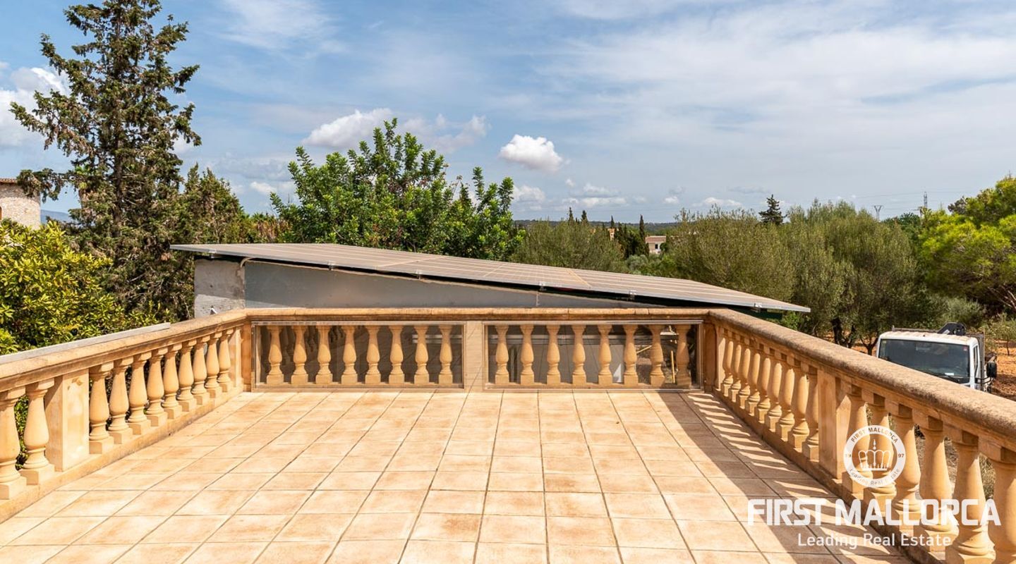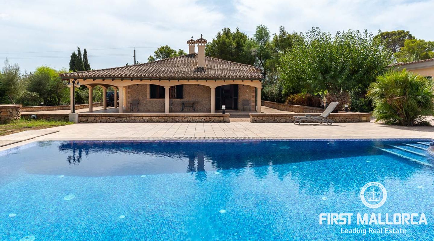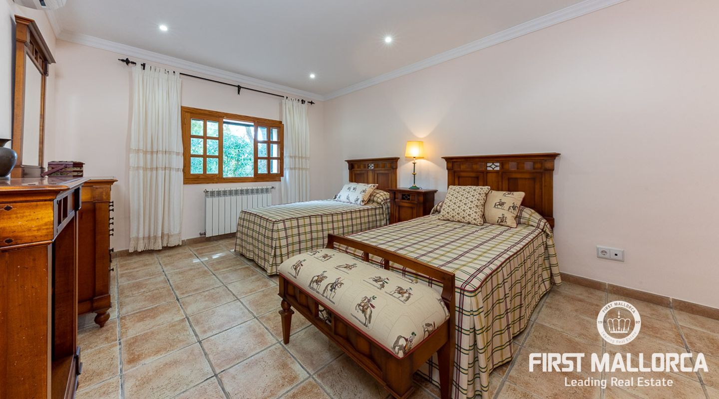 Dieses schöne Landgut ist auf einem Grundstück von 15000m2 mit einem großen gepflegten Garten, einem Ruhebereich mit Schwimmbad und Jacuzzi, einem Haupthaus und einem Gästehaus gebaut. Die Gesamtfläche des Grundstücks ist etwa 300m2. Das Haupthaus ist im mediterranen Stil erbaut und besteht aus einem geräumigen Wohn-Esszimmer mit Zugang zur überdachten Terrasse und zum Poolbereich, einer separaten voll ausgestatteten Küche, 3 Schlafzimmern und einem Badezimmer. Es gibt auch einen Keller, der als Weinkeller und/oder Lagerraum genutzt werden könnte. Das Gästehaus besteht aus einem Wohnzimmer mit Panoramafenstern, einer offenen Küche, einem Schlafzimmer und einem Bad mit Dusche. Der Außenbereich verfügt über einen gesalzenen Swimmingpool mit Selbstreinigungssystem und Jacuzzi, einen überdachten Parkplatz für zwei Autos und einen großen Obstgarten mit automatischem Bewässerungssystem. Das Haupthaus und das Gästehaus sind mit einer Öl-Zentralheizung und Klimaanlagen in allen Räumen ausgestattet. Es gibt Sonnenkollektoren, einen Brunnen und automatische Eingangstore. Das Haus befindet sich in einer ruhigen Wohngegend und bietet maximale Privatsphäre und eine privilegierte Nachbarschaft. Die internationale Schule "The Academy International School" befindet sich in der Nähe. Die Stadt Palma und die wichtigsten Einkaufs- und Freizeitzentren sind in 15 Minuten mit dem Auto zu erreichen.
