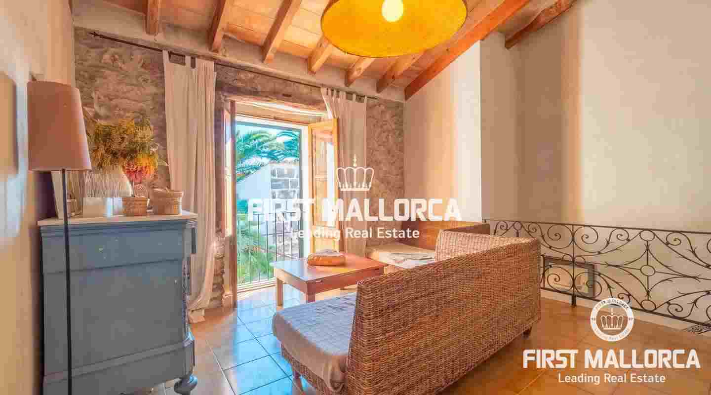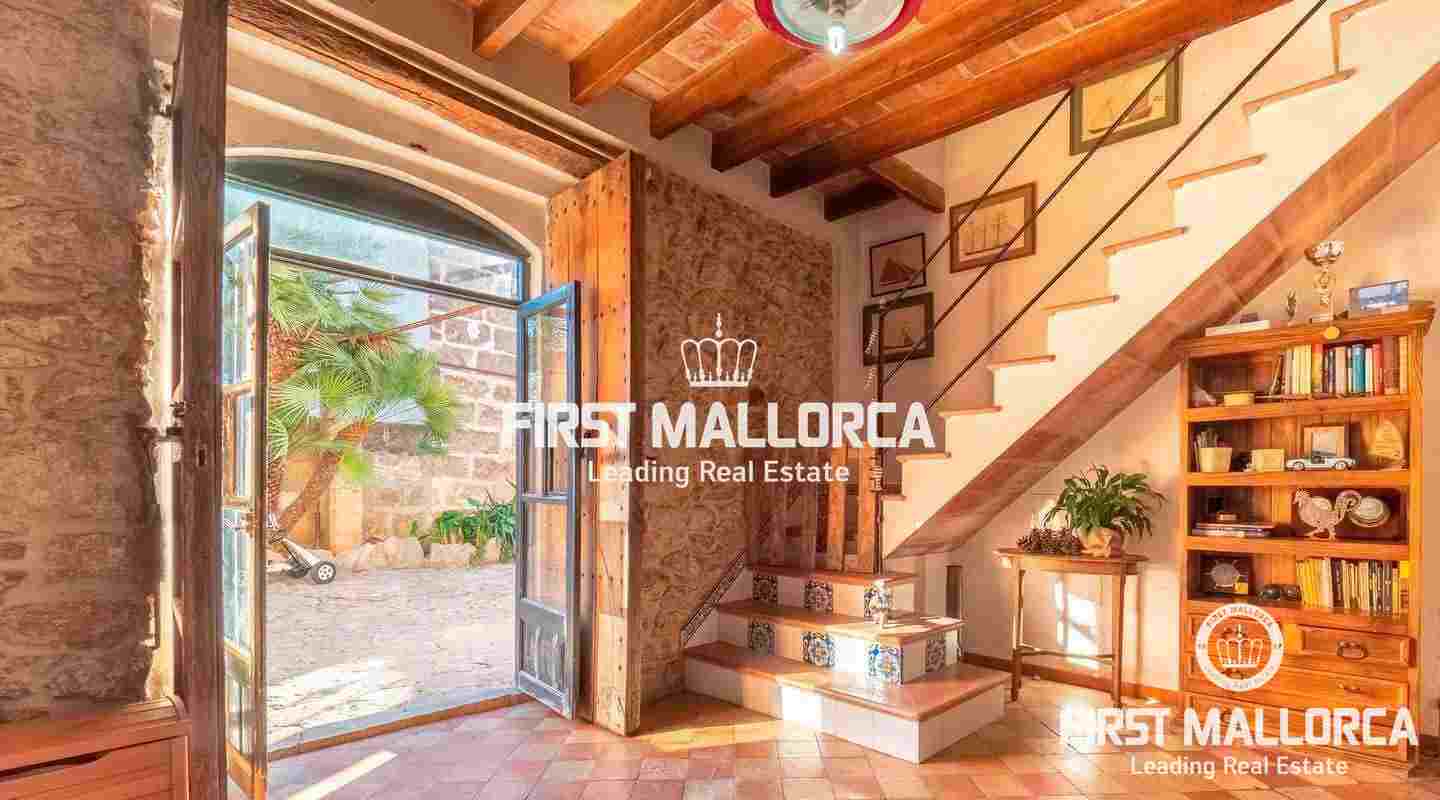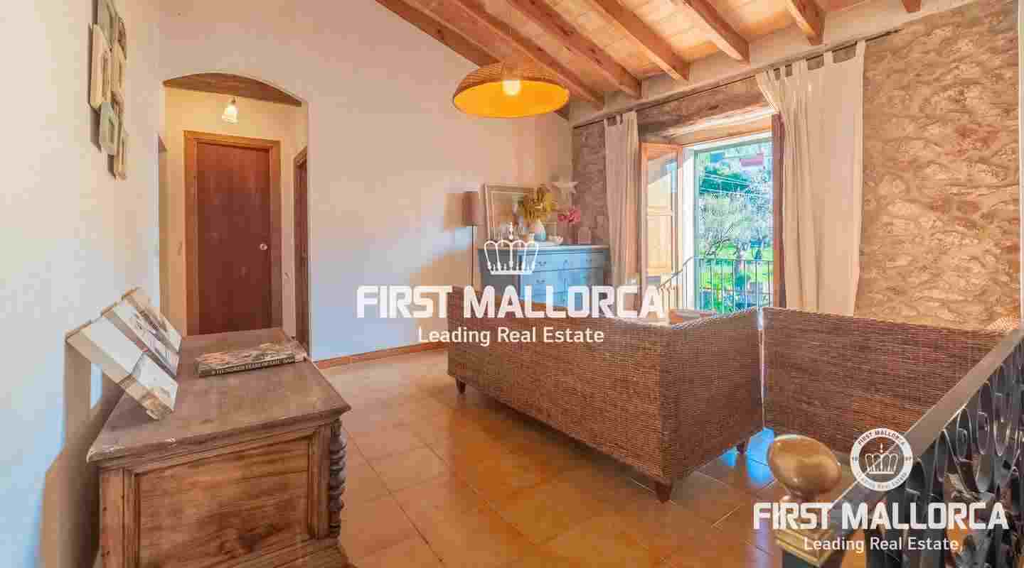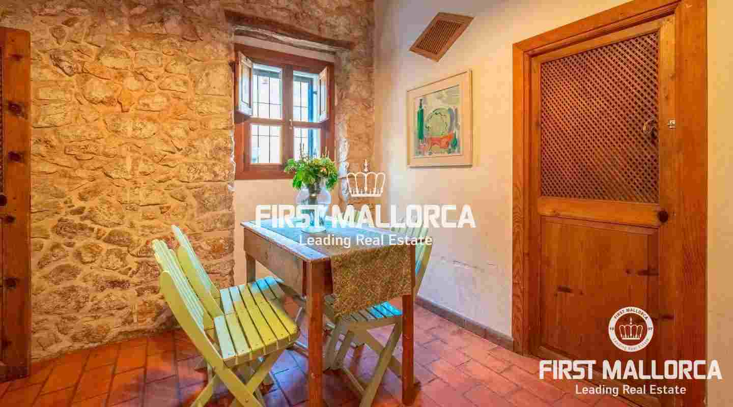 Im Erdgeschoss verfügt die Immobilie über ein Esszimmer mit einem alten Kamin, eine Küche, eine Speisekammer, ein Wohnzimmer ebenfalls mit Kamin, ein kleines Schlafzimmer und ein Gäste-WC. Im Obergeschoss liegen ein weiteres Wohnzimmer, 5 Schlafzimmer, 2 Bäder und eine großzügige Terrasse, welche einen herrlichen Blick auf das Tramuntana-Gebirge genießt.