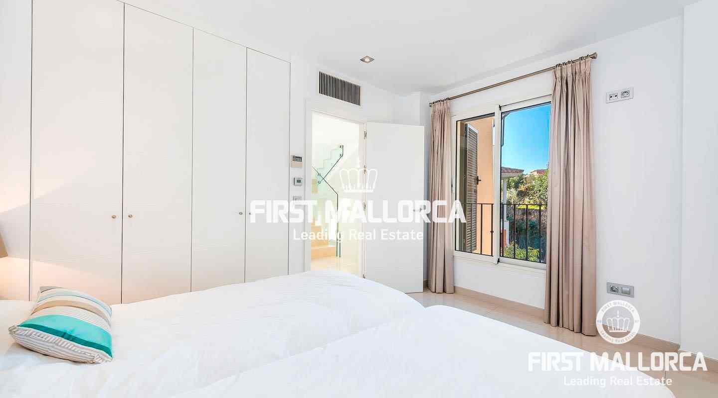 Im ersten Stock liegen 2 Schlafzimmer, welche sich ein Bad teilen. Ein Schlafzimmer hat ferner eine eigene Terrasse. Eine Etage darüber liegt das Hauptschlafzimmer mit Bad en Suite und privater Terrasse. Die Immobilie ist mit Klimaanlage, Fußbodenheizung sowie Fensterläden ausgestattet und wird möbliert angeboten. Ein privater Parkplatz ist ebenfalls in den Kaufpreis inbegriffen.