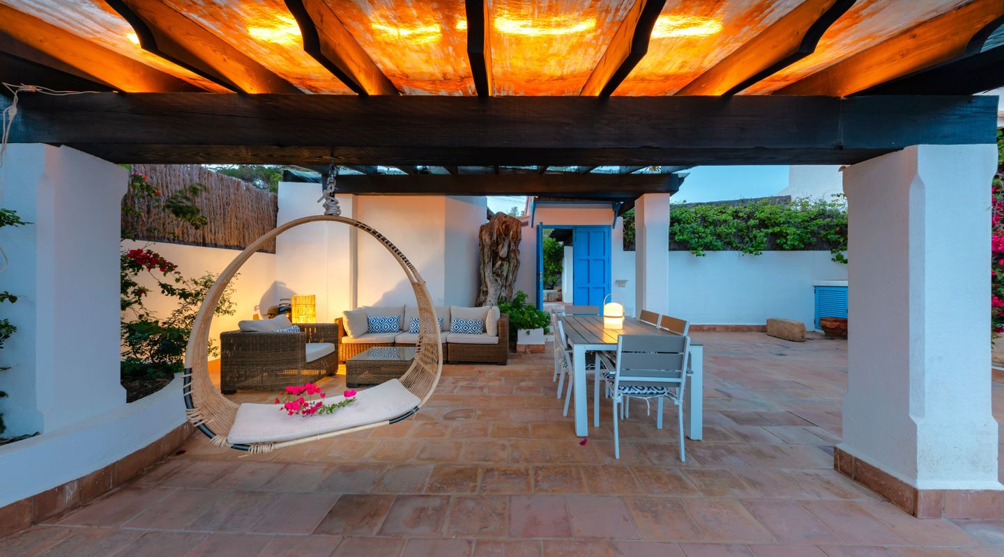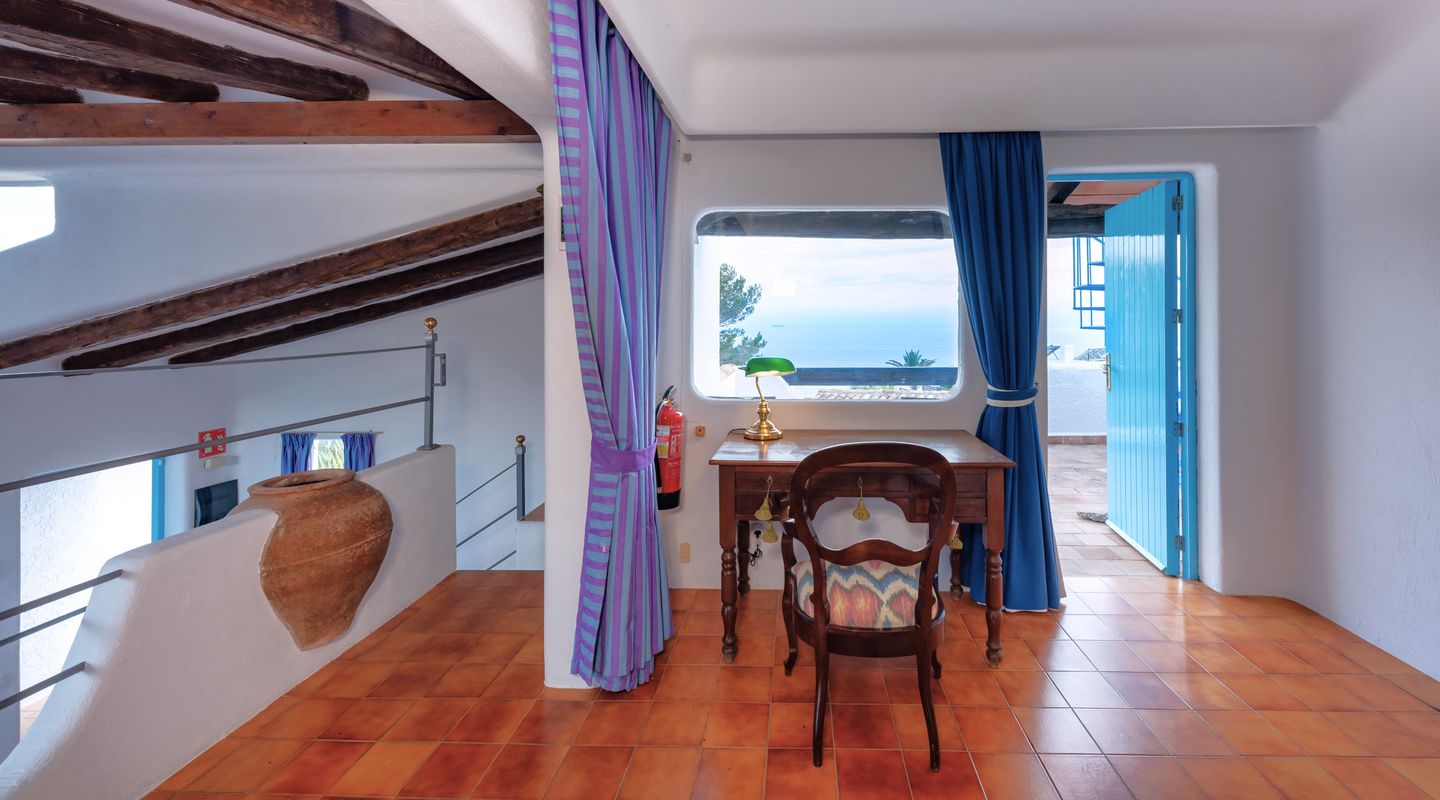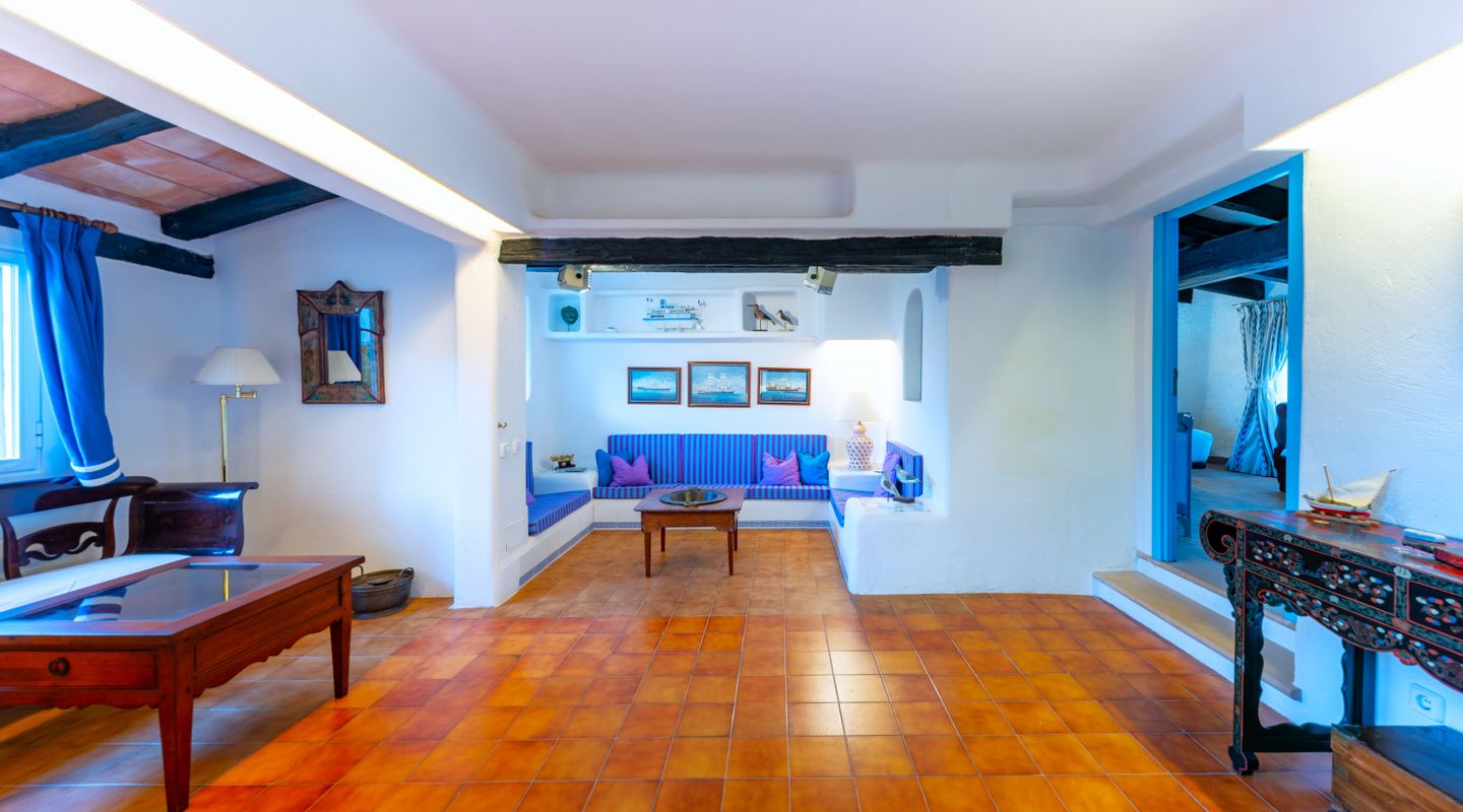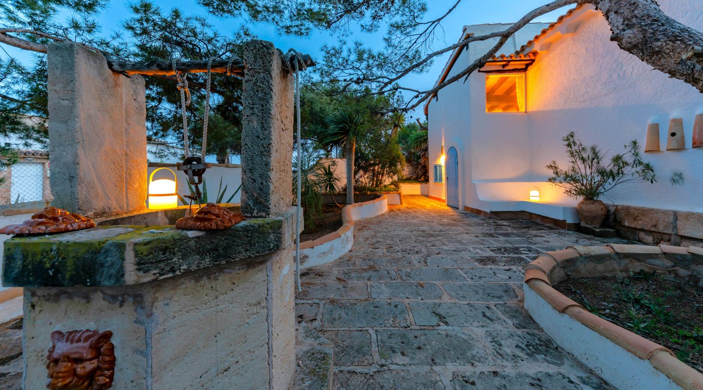 Dieses charmante Haus aus den Siebzigern ist eines der ersten Häuser, das auf der Halbinsel La Mola errichtet wurde. Es stammt vom bekannten und beliebten Architekten Pedro Otzoup, der keines seiner Objekte wie das Andere gebaut hat. Holzbalken, Rundungen, kleine Glasfenster, eingemauerte Regale, etc.