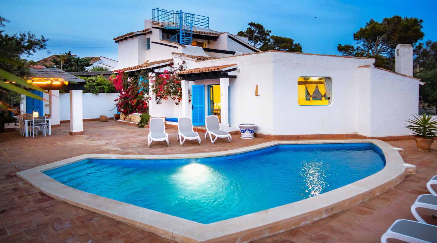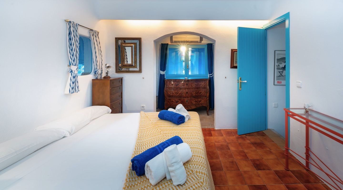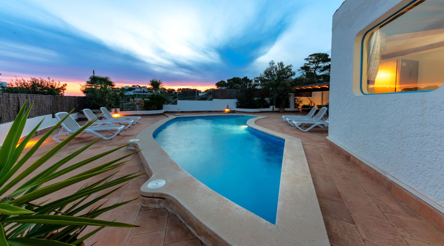 Dieses charmante Haus aus den Siebzigern ist eines der ersten Häuser, das auf der Halbinsel La Mola errichtet wurde. Es stammt vom bekannten und beliebten Architekten Pedro Otzoup, der keines seiner Objekte wie das Andere gebaut hat. Holzbalken, Rundungen, kleine Glasfenster, eingemauerte Regale, etc.