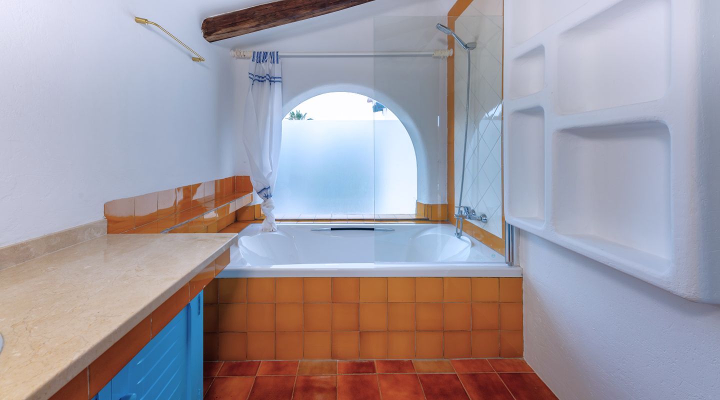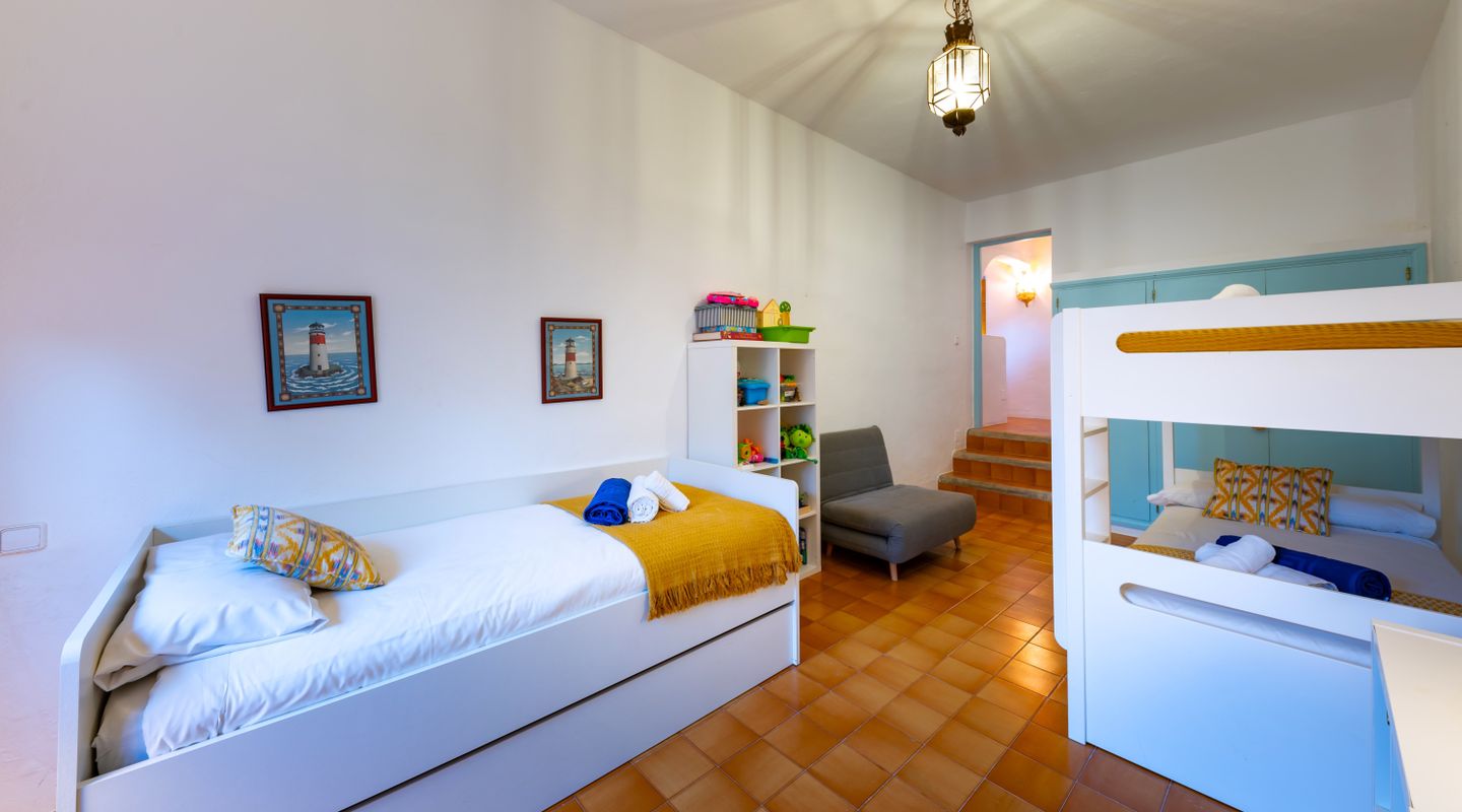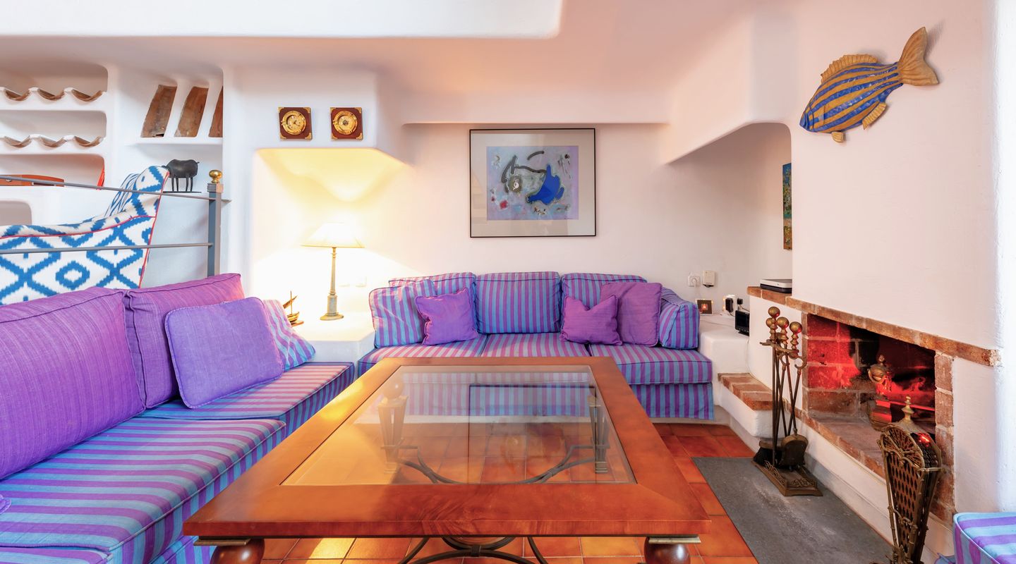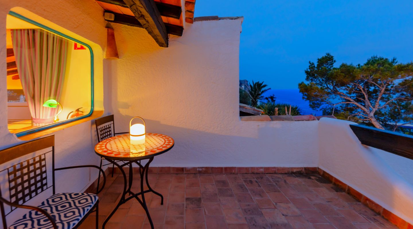 Dieses charmante Haus aus den Siebzigern ist eines der ersten Häuser, das auf der Halbinsel La Mola errichtet wurde. Es stammt vom bekannten und beliebten Architekten Pedro Otzoup, der keines seiner Objekte wie das Andere gebaut hat. Holzbalken, Rundungen, kleine Glasfenster, eingemauerte Regale, etc.