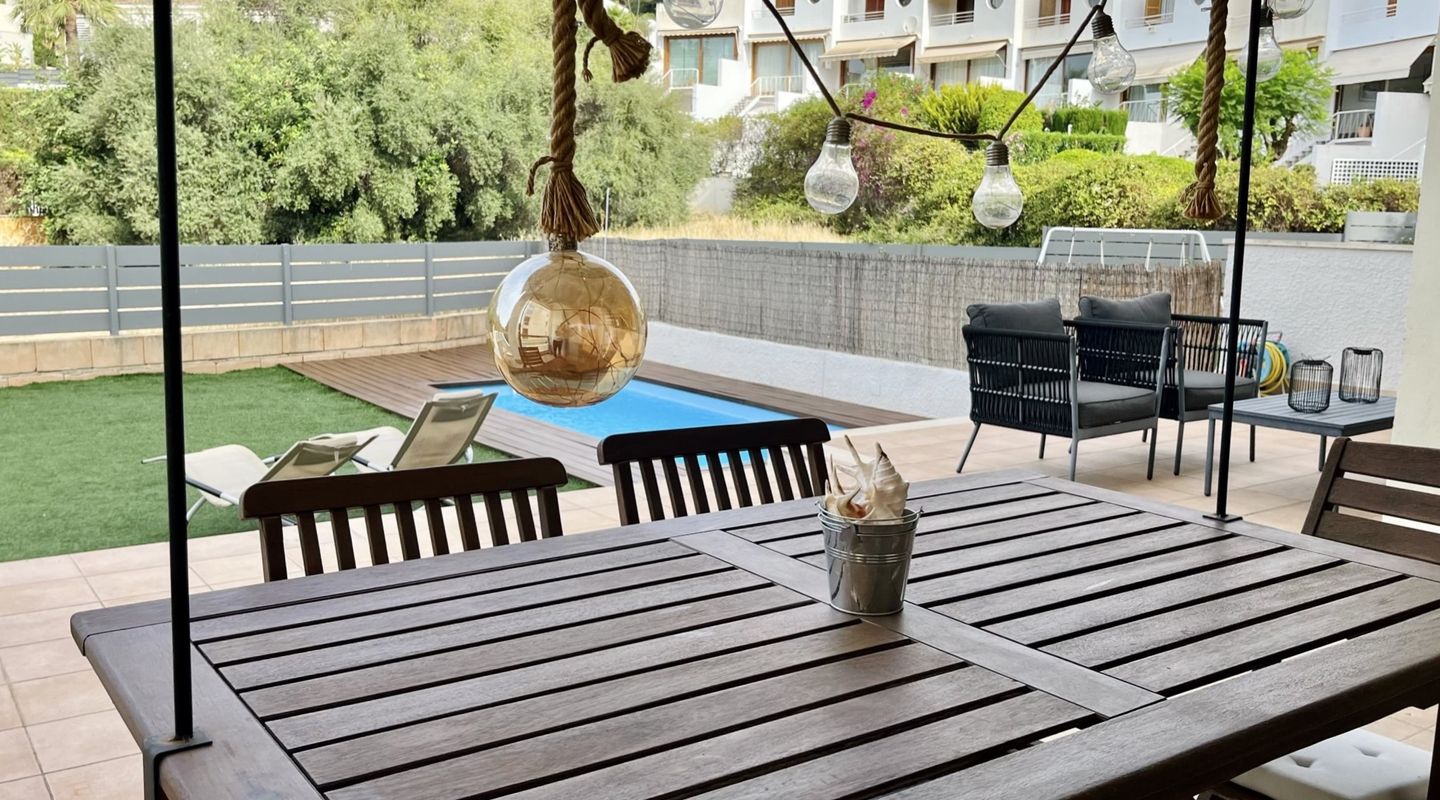 Schöne Erdgeschosswohnung mit gemütlicher Atmosphäre und einladendem Design. Das sehr helle Wohnzimmer mit Essbereich lässt Sie die Freude und den Komfort spüren. Die Terrasse und der private Pool werden Sie während der warmen Sommertage und Nächte verwöhnen. Sie haben auch Zugang zum gemeinschaftlichen Pool. Ein perfekter Ort, um mit Ihrer Familie und Freunden zu genießen. Vollständig möblierte Wohnung, voll ausgestattete Küche mit Hauswirtschaftsraum. Wohnung mit drei Schlafzimmern und einem Bad en suite. Die Wohnung befindet sich in einer Wohngegend, umgeben von Natur und nur wenige Gehminuten vom Zentrum von Palma entfernt. Parkplatz inklusive.