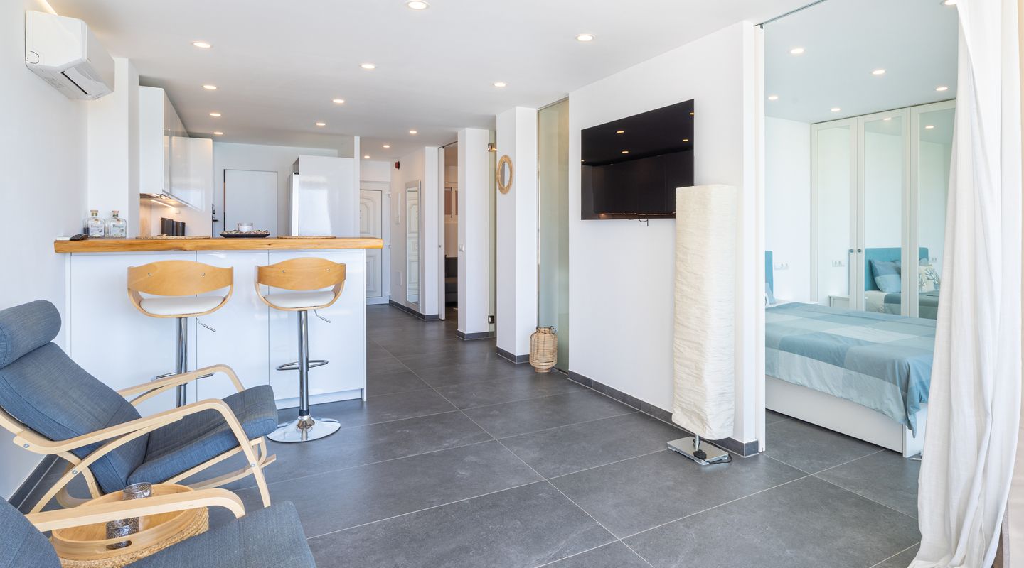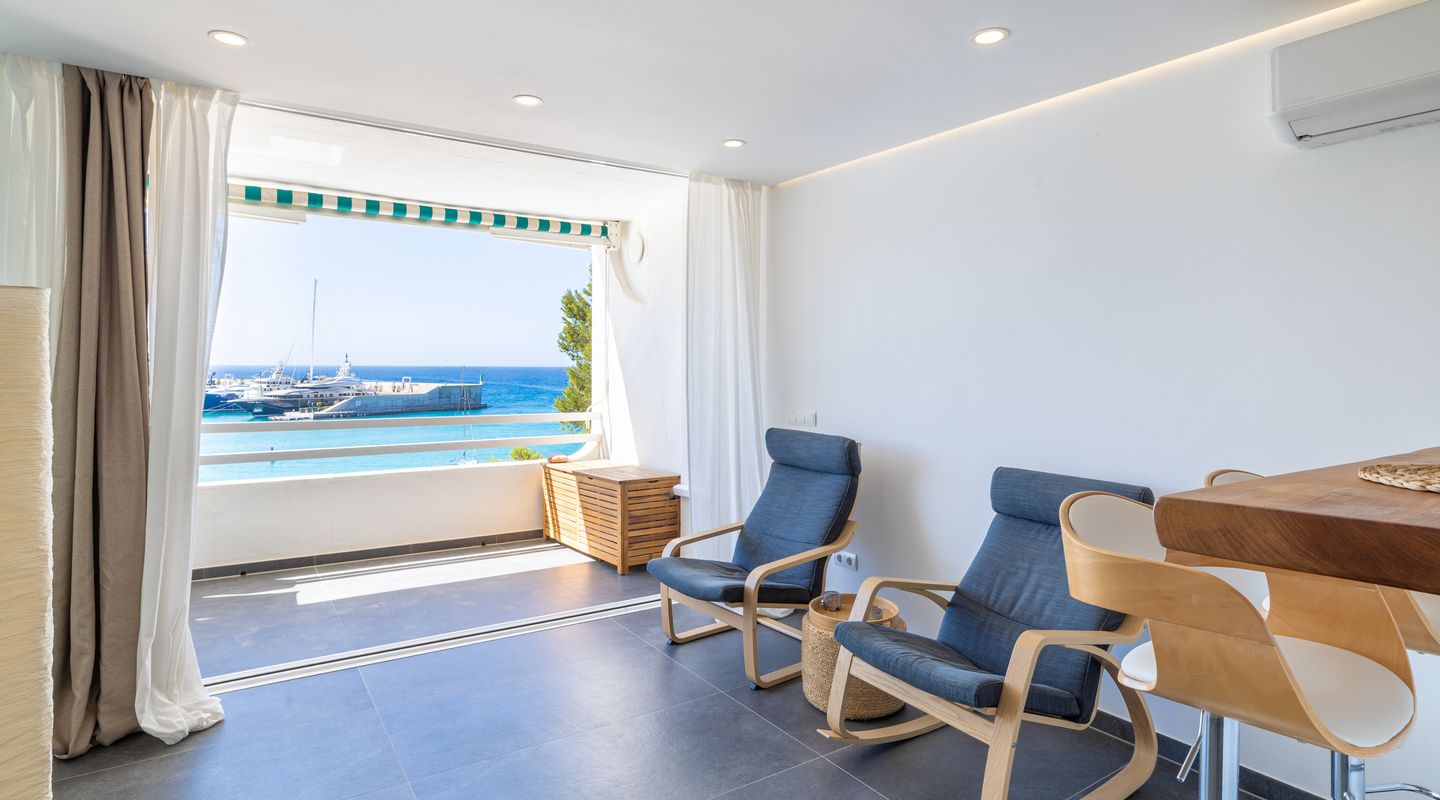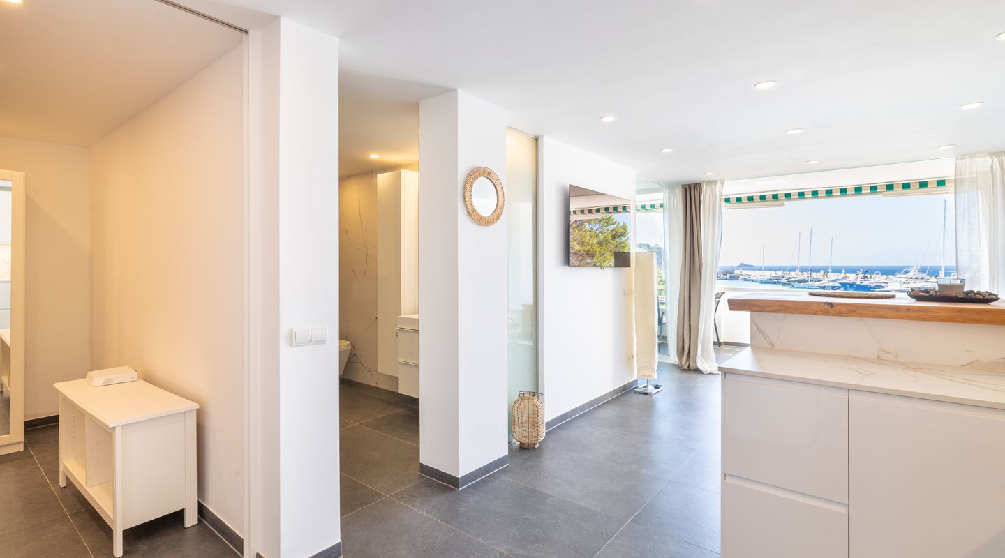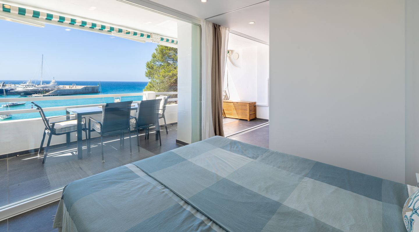 Sie verfügt über einen großzügigen Wohn- und Küchenbereich sowie zwei abgetrennte Schlafräume. Von einem der Schlafzimmer aus hat man durch eine große Glastür, die komplett geöffnet werden kann, direkten Meerblick aus dem Bett. Vom Wohnbereich und dem Balkon aus hat man den selben beeindruckenden Blick auf den Hafen und den Strand von Port Adriano.