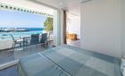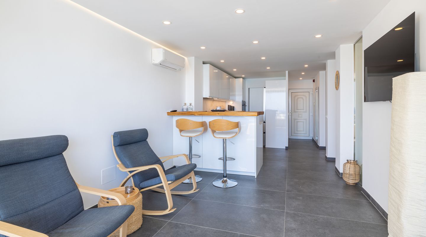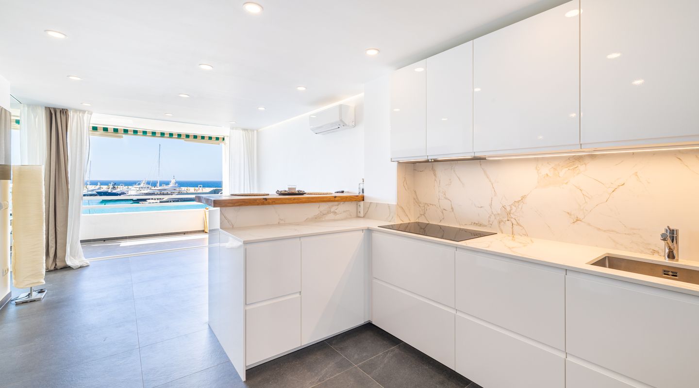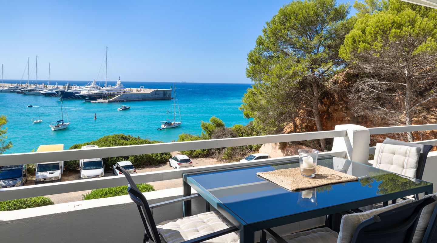 Sie verfügt über einen großzügigen Wohn- und Küchenbereich sowie zwei abgetrennte Schlafräume. Von einem der Schlafzimmer aus hat man durch eine große Glastür, die komplett geöffnet werden kann, direkten Meerblick aus dem Bett. Vom Wohnbereich und dem Balkon aus hat man den selben beeindruckenden Blick auf den Hafen und den Strand von Port Adriano.