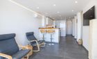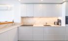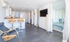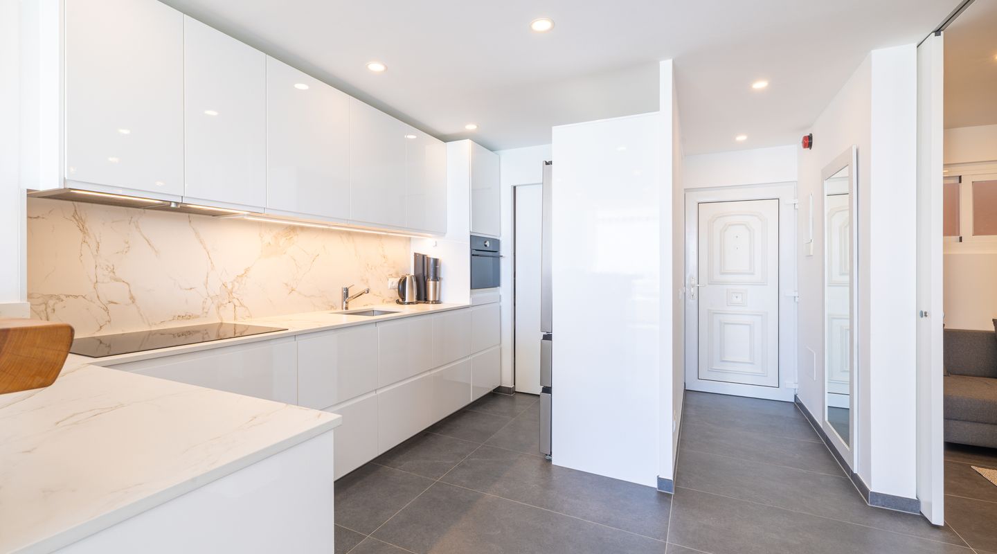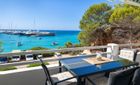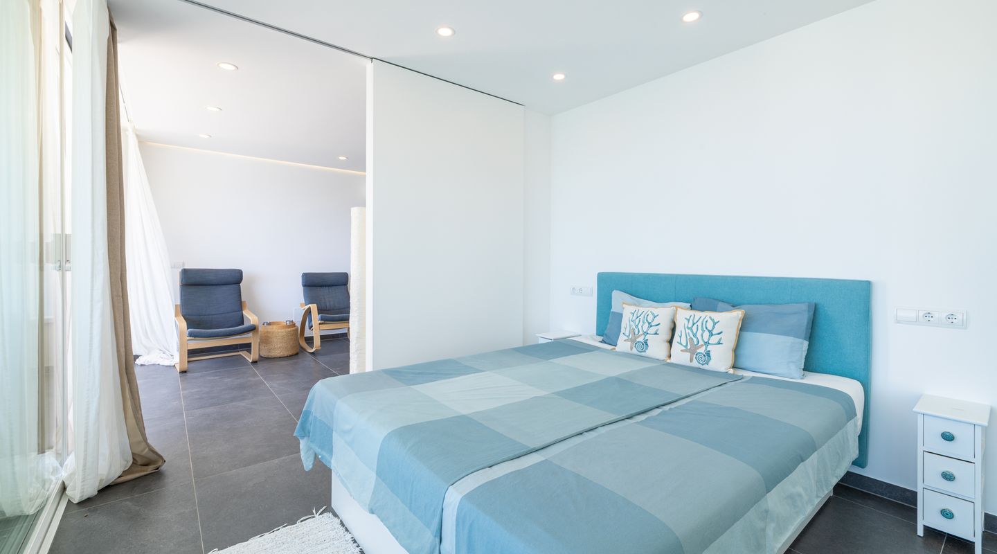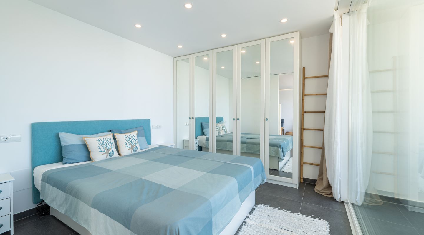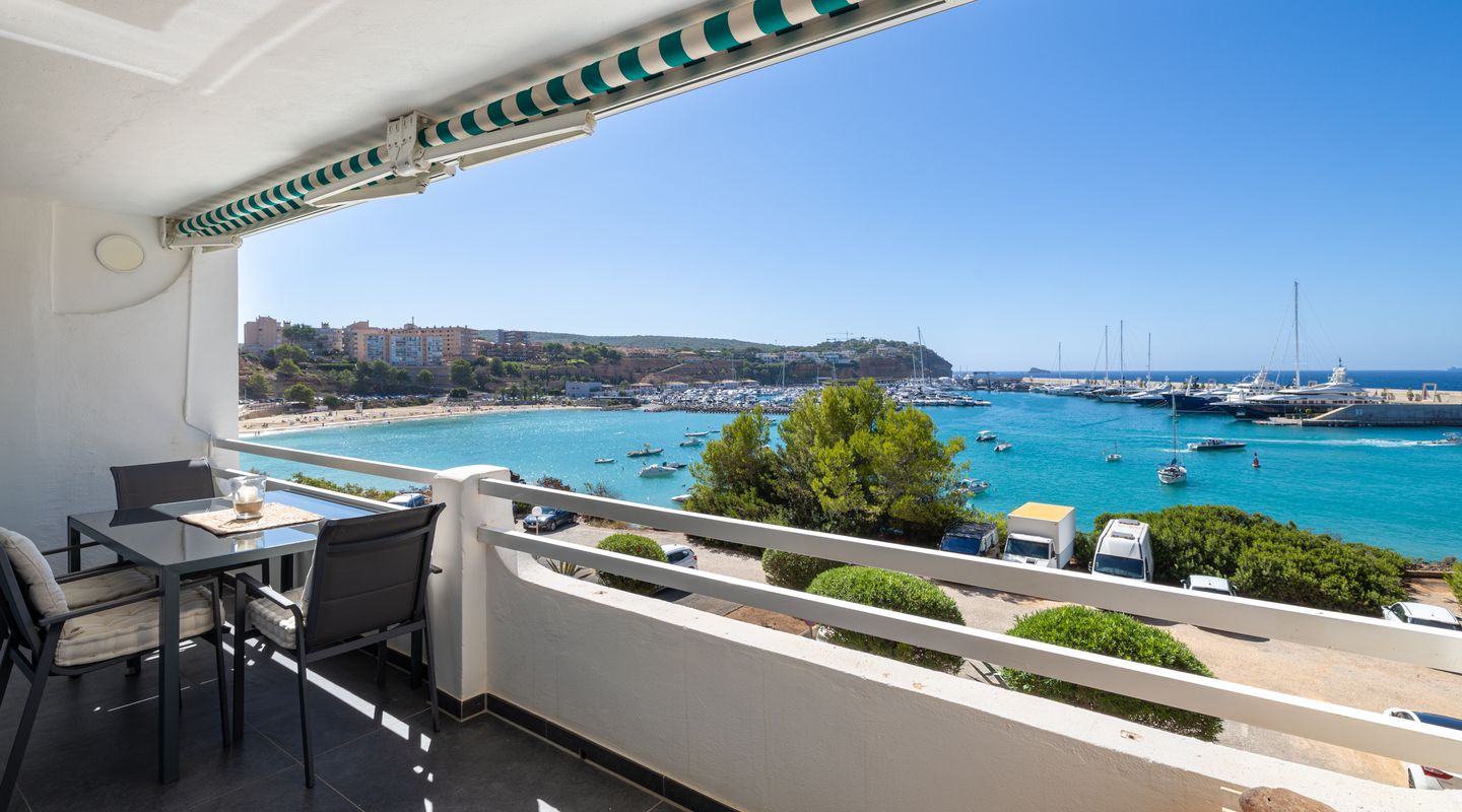 Sie verfügt über einen großzügigen Wohn- und Küchenbereich sowie zwei abgetrennte Schlafräume. Von einem der Schlafzimmer aus hat man durch eine große Glastür, die komplett geöffnet werden kann, direkten Meerblick aus dem Bett. Vom Wohnbereich und dem Balkon aus hat man den selben beeindruckenden Blick auf den Hafen und den Strand von Port Adriano.