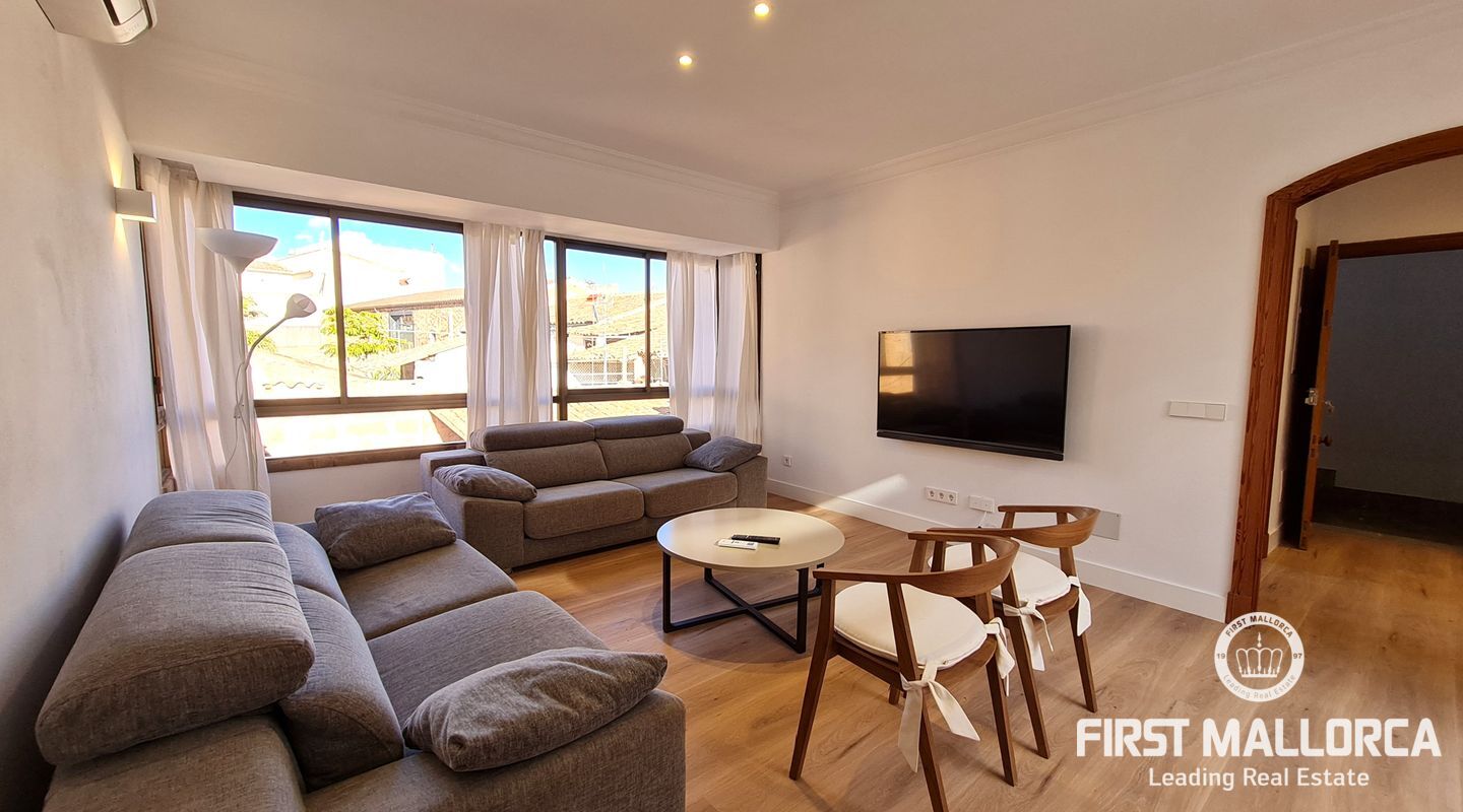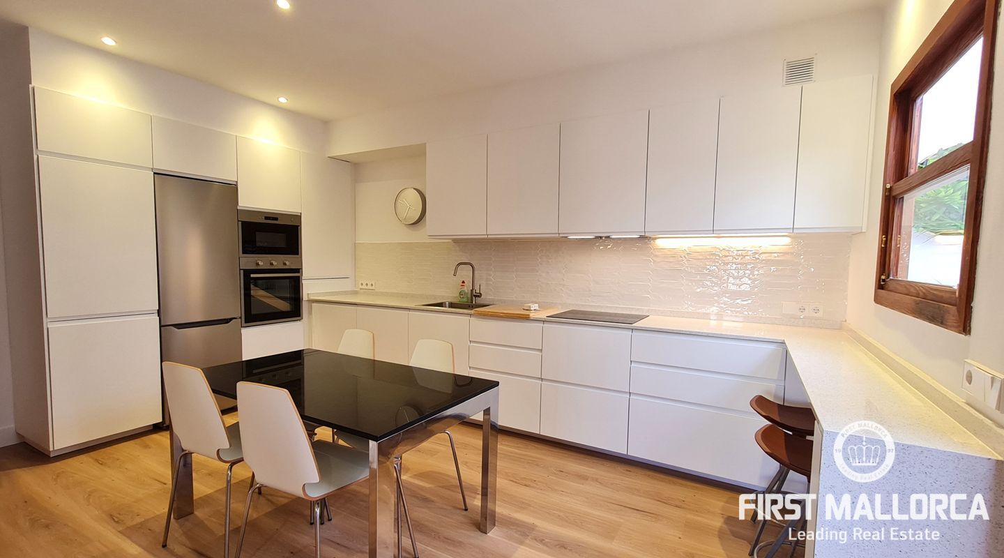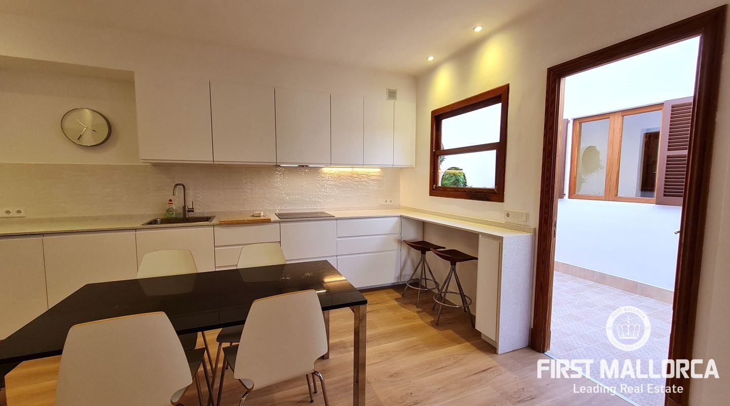 Die Wohnung befindet sich in einem Gebäude ohne Nachbarn, in Erdgeschoss eine private Garage. Im ersten Stock befindet sich die neue und maßgeschneiderten Küche mit Essplatz und allen Geräten aus Edelstahl. Die Küche wurde so renoviert, dass sie zum Wohnbereich und zu einem kleinen Innenhof mit viel Charme hin offen ist. Im Wohnzimmer lassen zwei große Fenster viel Licht herein, eines vom Innenhof und das andere zur Straße hin. Es gibt drei Schlafzimmer, zwei davon mit Doppelbett und eines mit Einzelbett, und zwei komplette Bäder, eines davon en-suite.