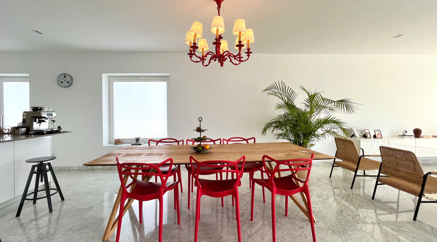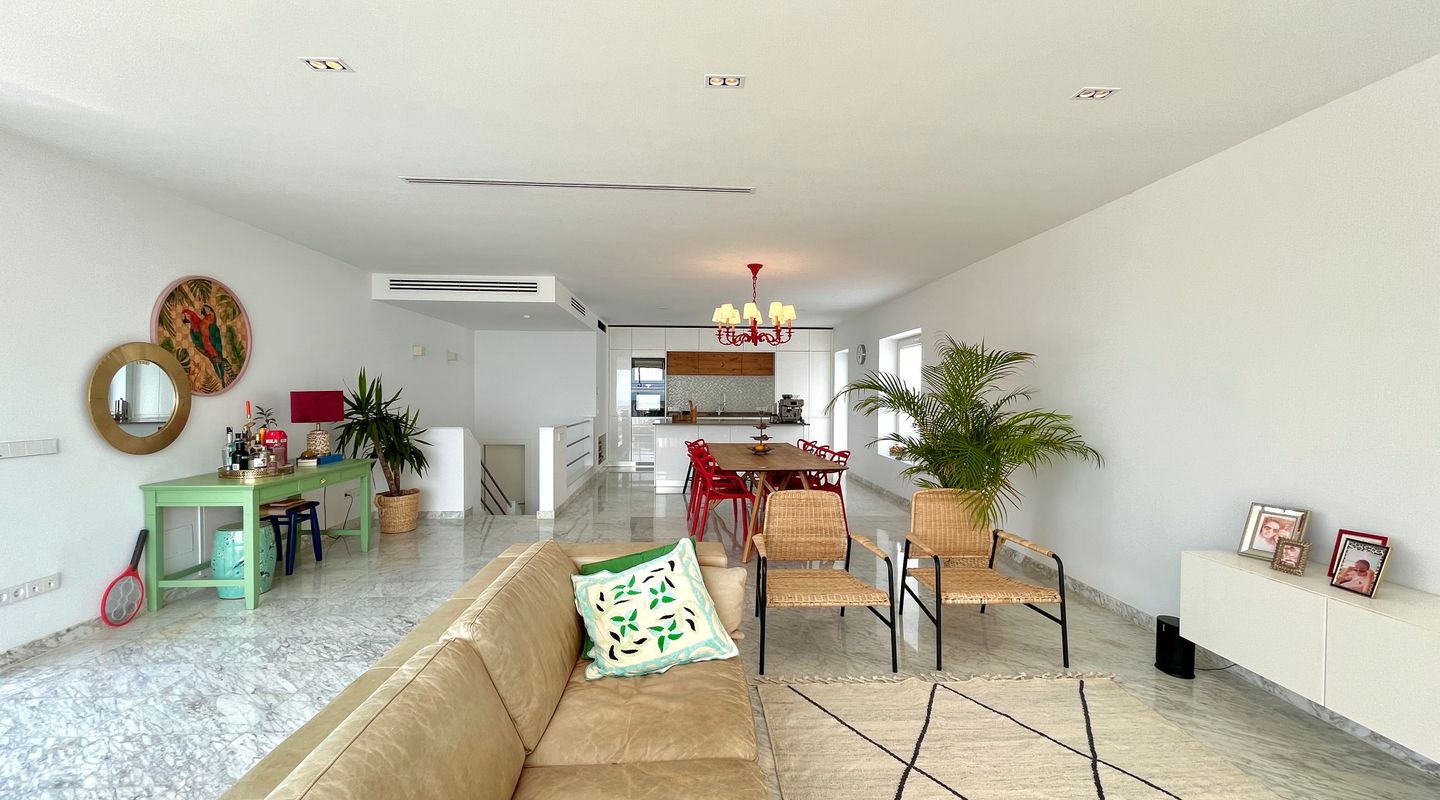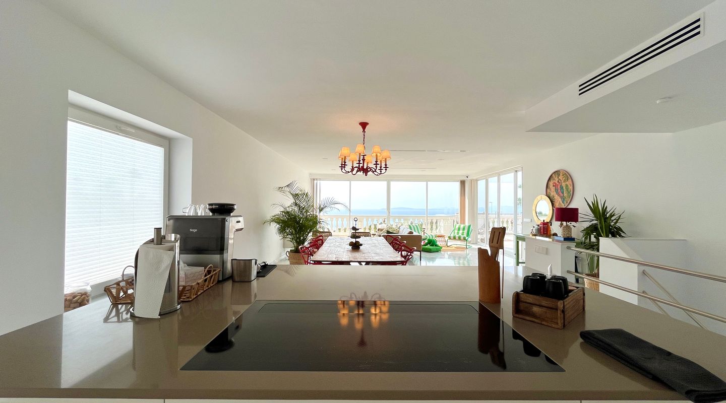 Im Obergeschoss befindet sich ein heller und großzügiger Wohnbereich mit offener, voll ausgestatteter Küche, der Zugang zu einer großen Terrasse mit Chill-out-Bereich und Grill bietet. Von hier aus genießt man herrlichen Meerblick und spektakuläre Sonnenuntergänge – perfekt zum Entspannen oder für gesellige Abende.