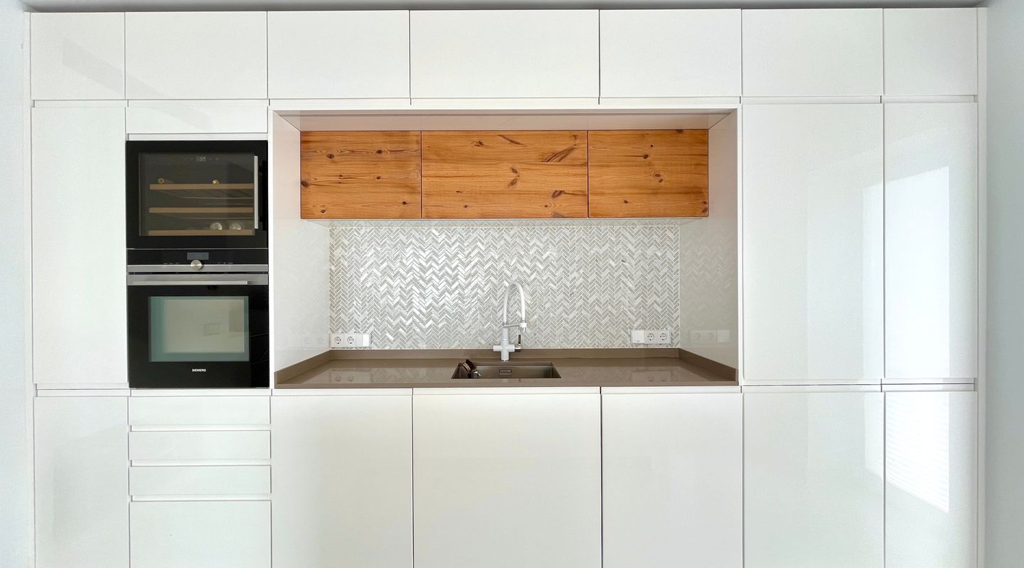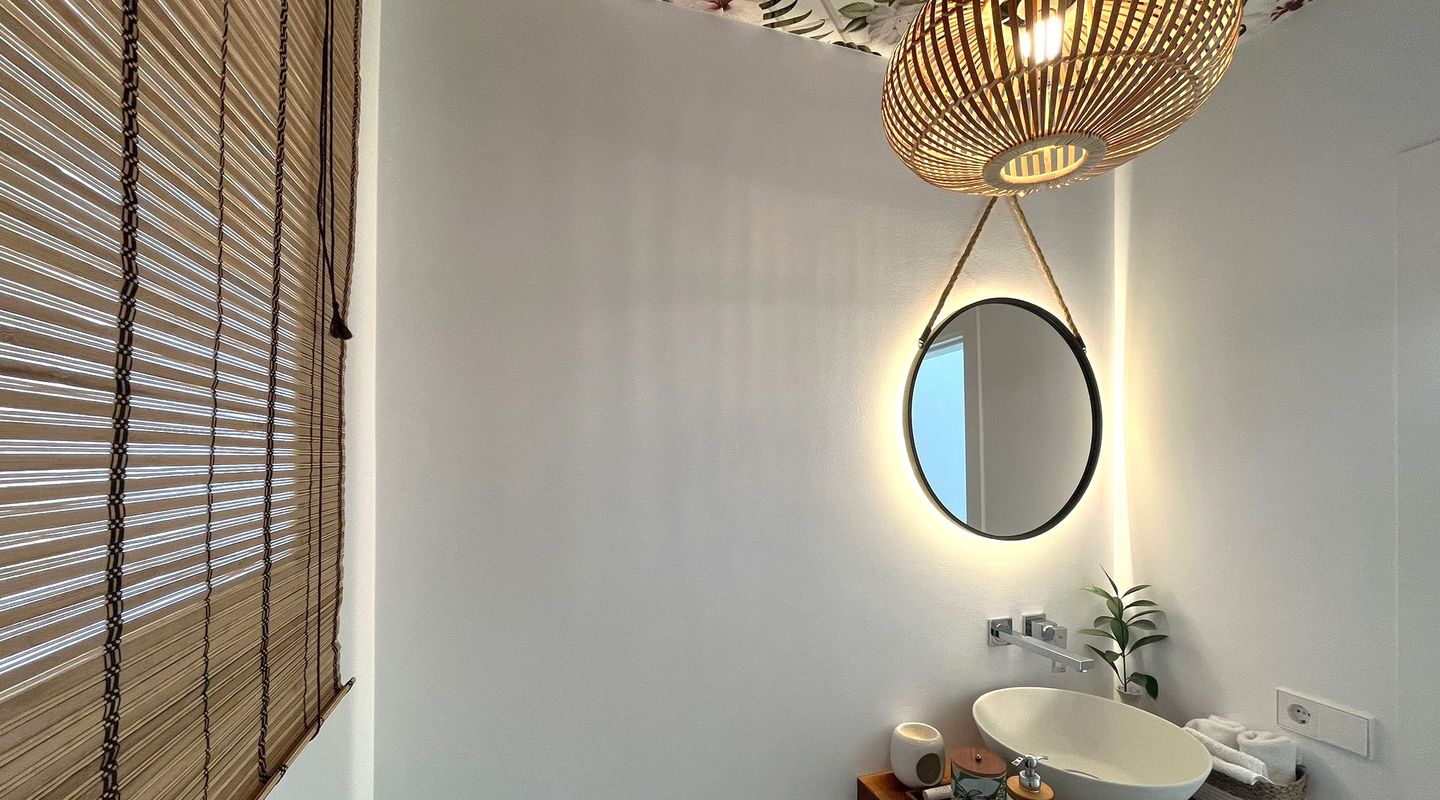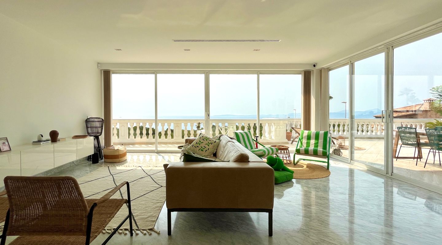 Im Obergeschoss befindet sich ein heller und großzügiger Wohnbereich mit offener, voll ausgestatteter Küche, der Zugang zu einer großen Terrasse mit Chill-out-Bereich und Grill bietet. Von hier aus genießt man herrlichen Meerblick und spektakuläre Sonnenuntergänge – perfekt zum Entspannen oder für gesellige Abende.