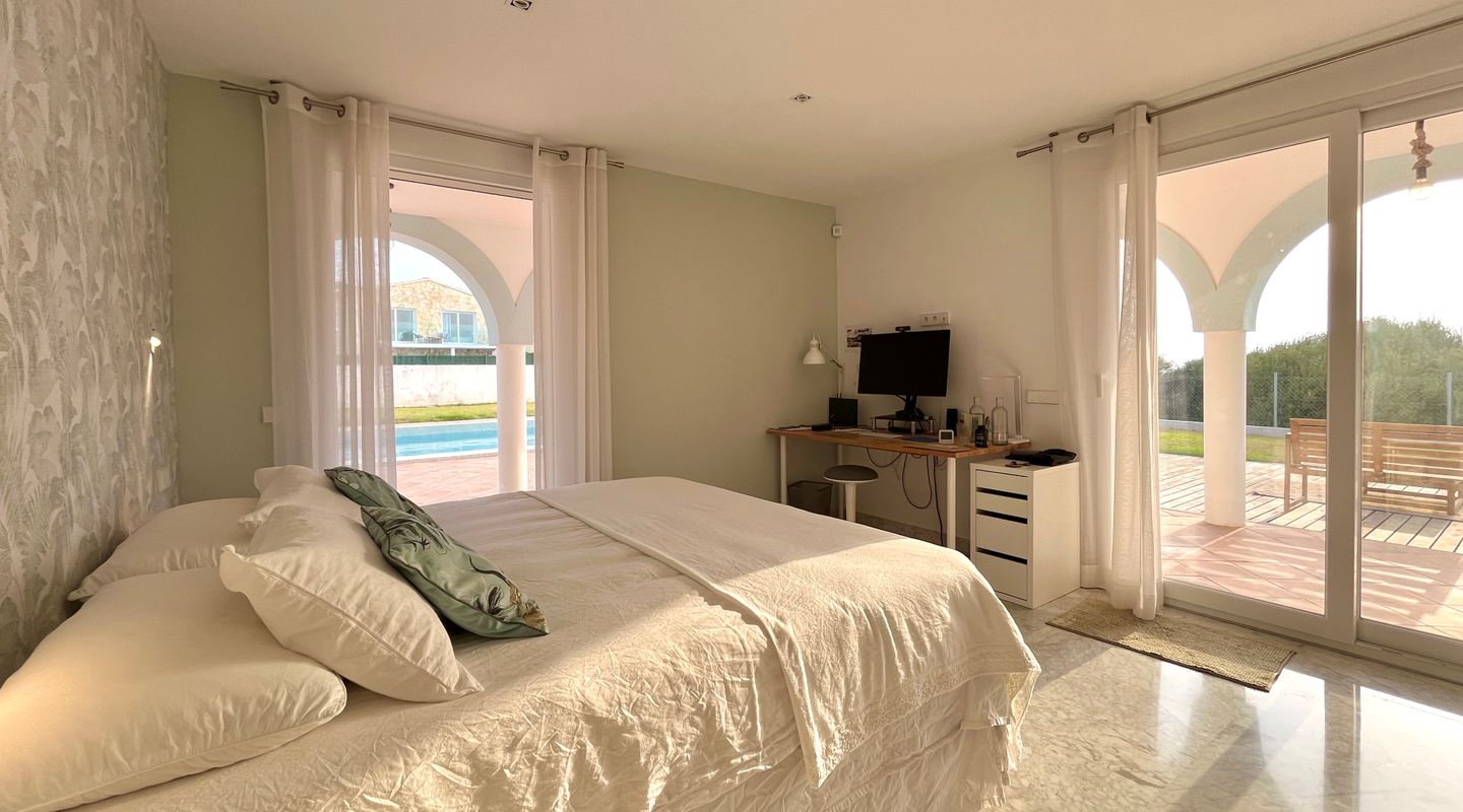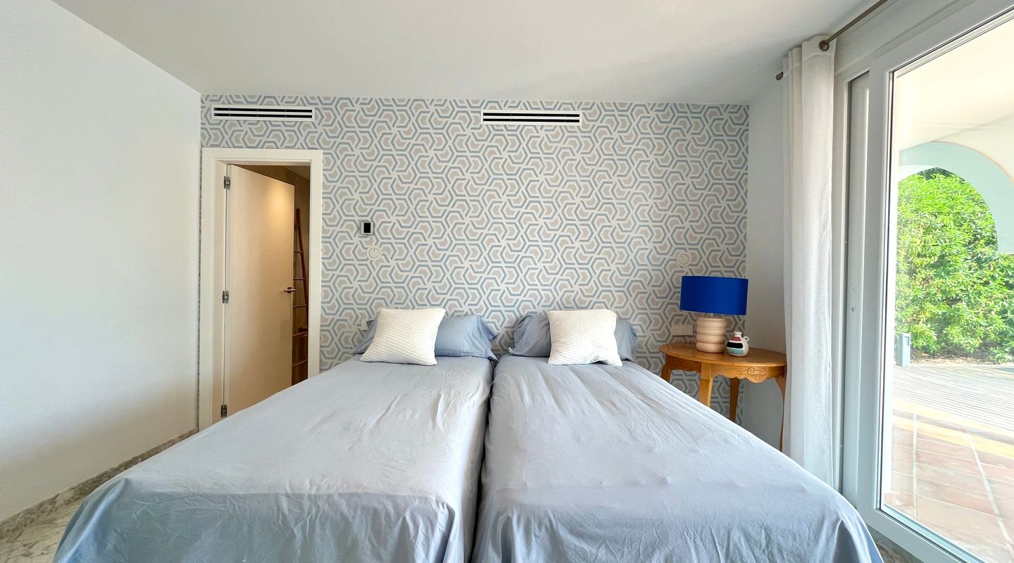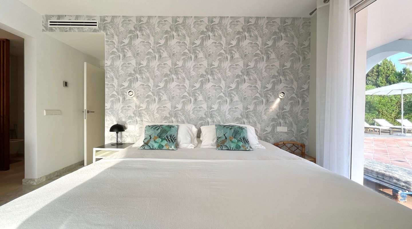 Im Erdgeschoss befinden sich vier Doppelschlafzimmer, jedes mit eigenem Bad und direktem Zugang zum Pool und Garten. Das Hauptschlafzimmer verfügt über ein Ankleidezimmer, außerdem gibt es eine Speisekammer und ein Gäste-WC.