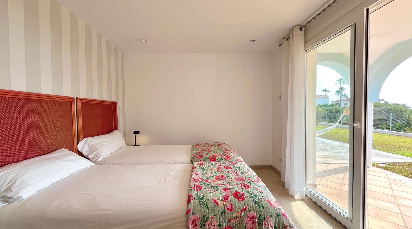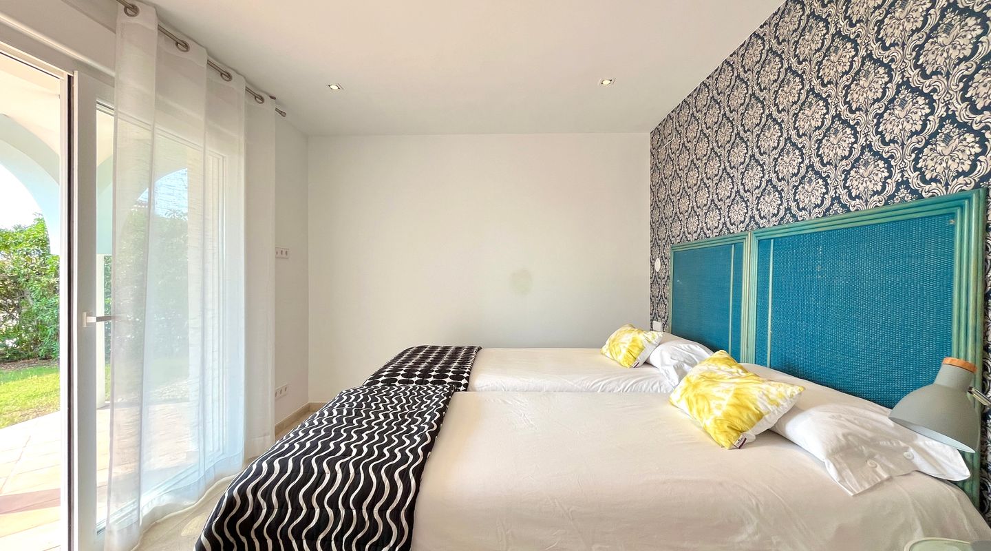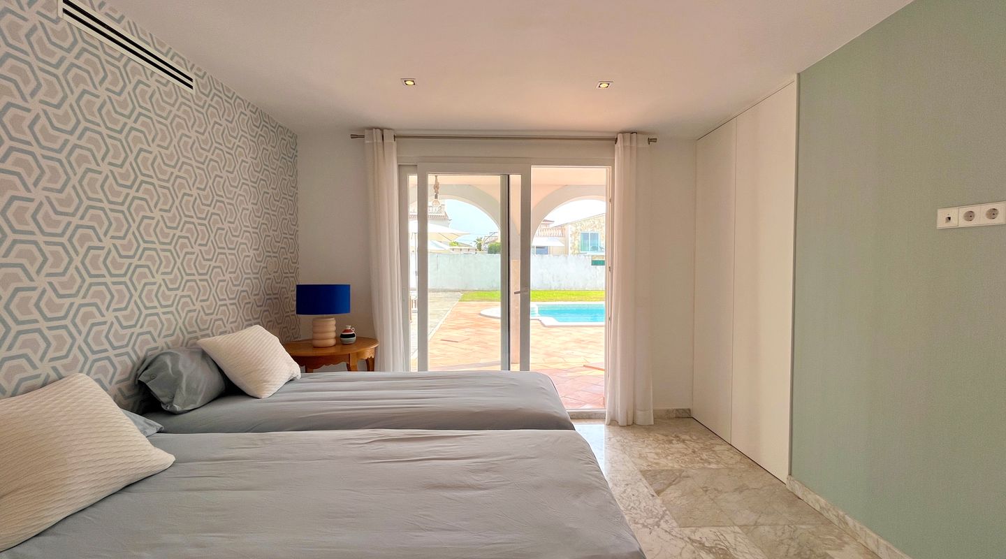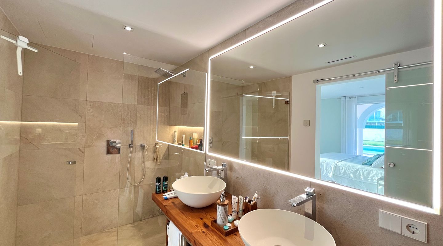 Im Erdgeschoss befinden sich vier Doppelschlafzimmer, jedes mit eigenem Bad und direktem Zugang zum Pool und Garten. Das Hauptschlafzimmer verfügt über ein Ankleidezimmer, außerdem gibt es eine Speisekammer und ein Gäste-WC.