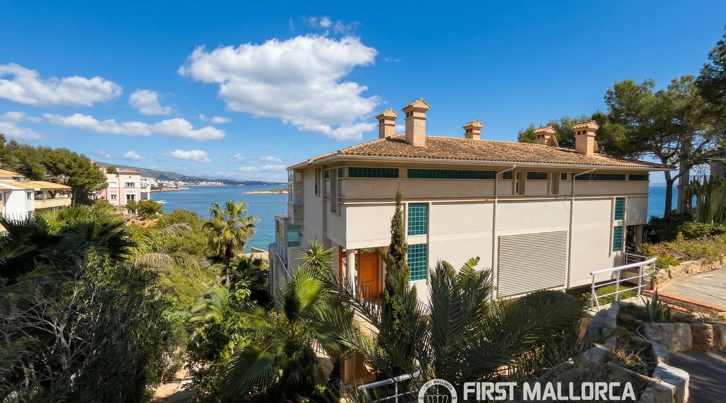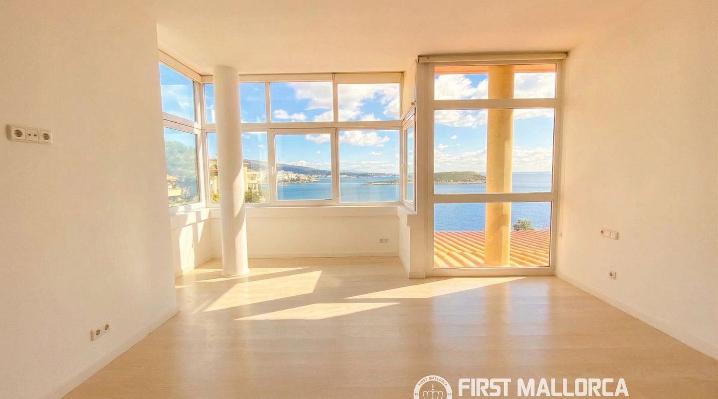 Dieses wunderschöne Duplex in Cala Vinyes bietet beeindruckende, offene Meerblicke aus nahezu allen Räumen, da die gesamte Immobilie zum Mittelmeer ausgerichtet ist. Im Erdgeschoss befindet sich ein heller, offen gestalteter Küchen-, Wohn- und Essbereich mit direktem Meerblick, außerdem eine Waschküche, ein Abstellraum sowie ein Gäste-WC.