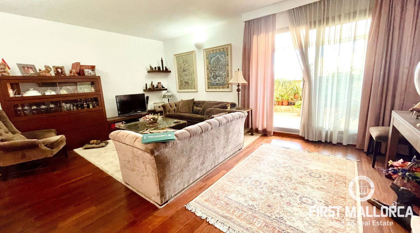 Am Eingang empfängt Sie ein geräumiges Wohnzimmer mit direktem Zugang zu der sehr großen und hellen überdachten Terrasse.