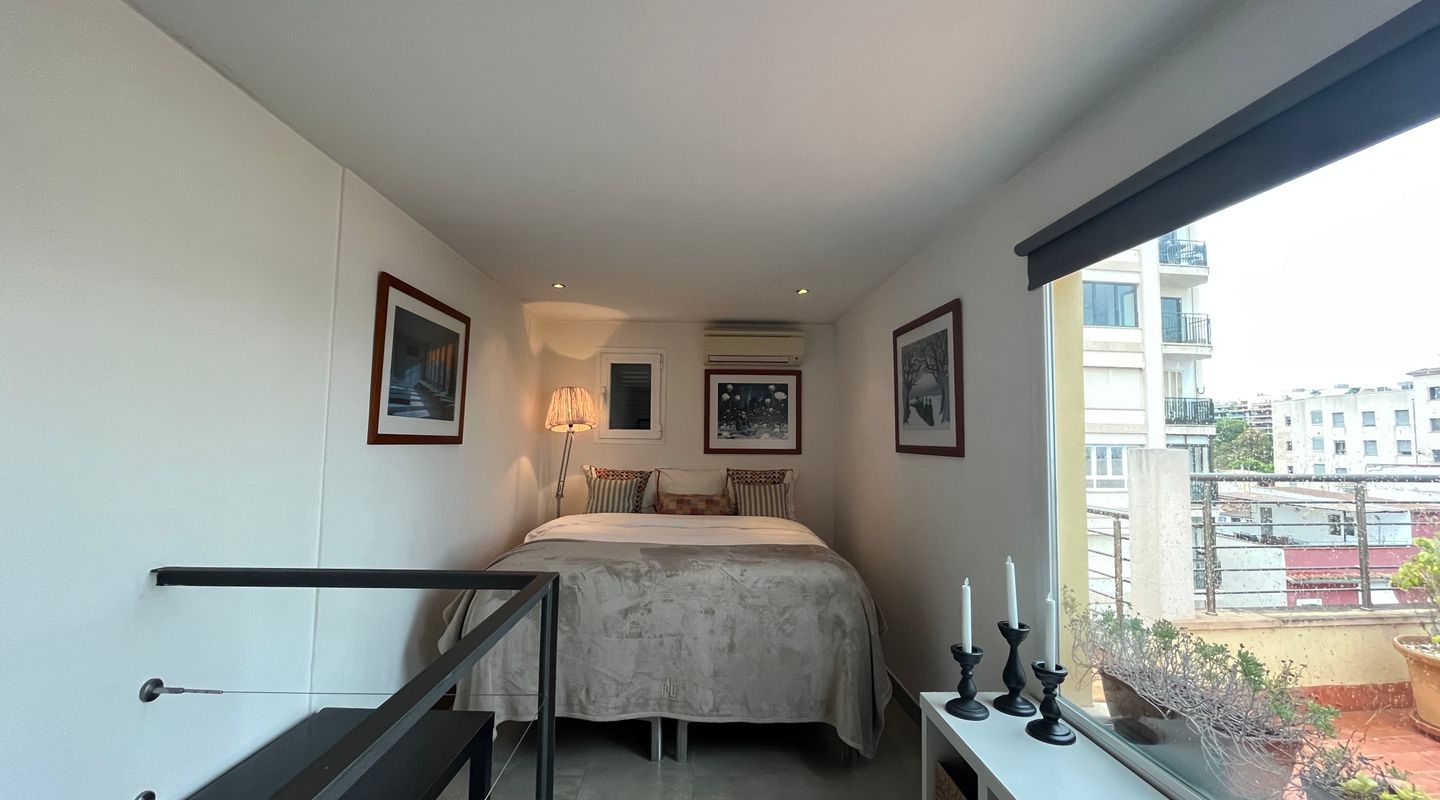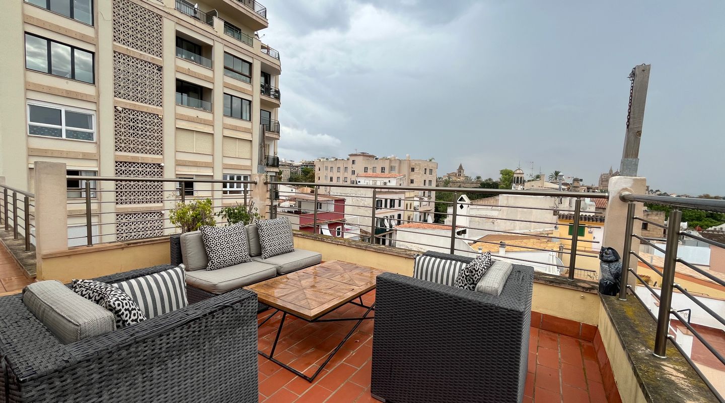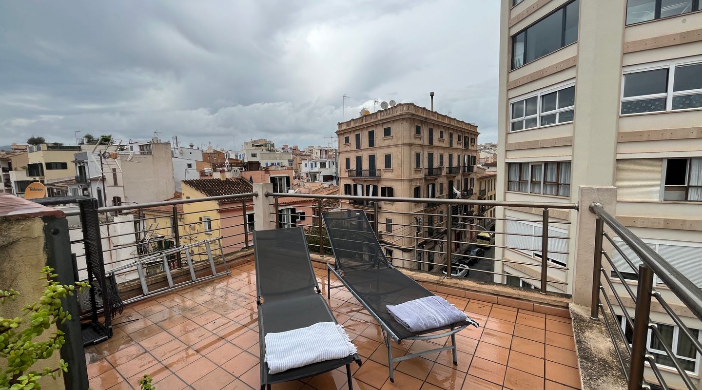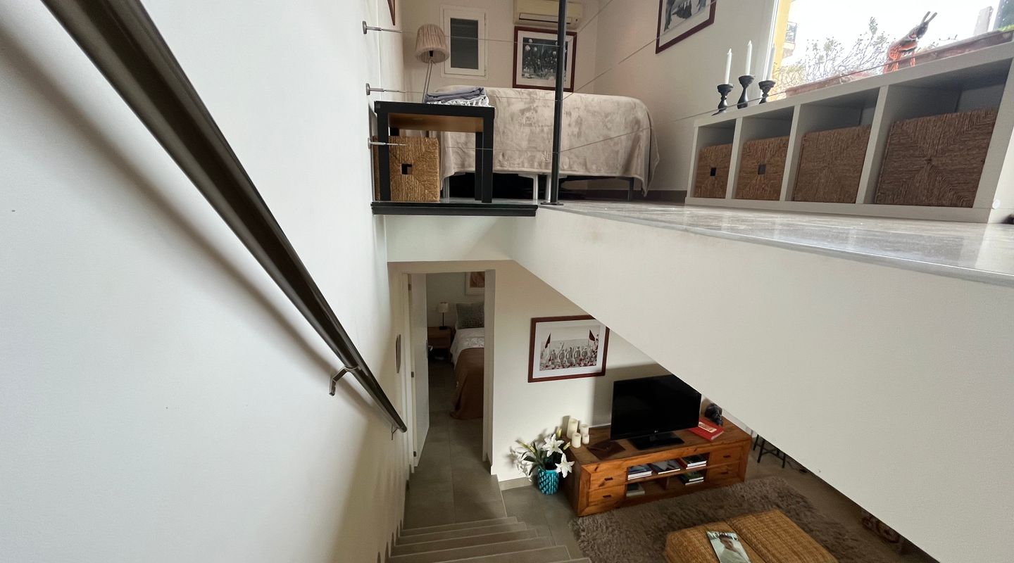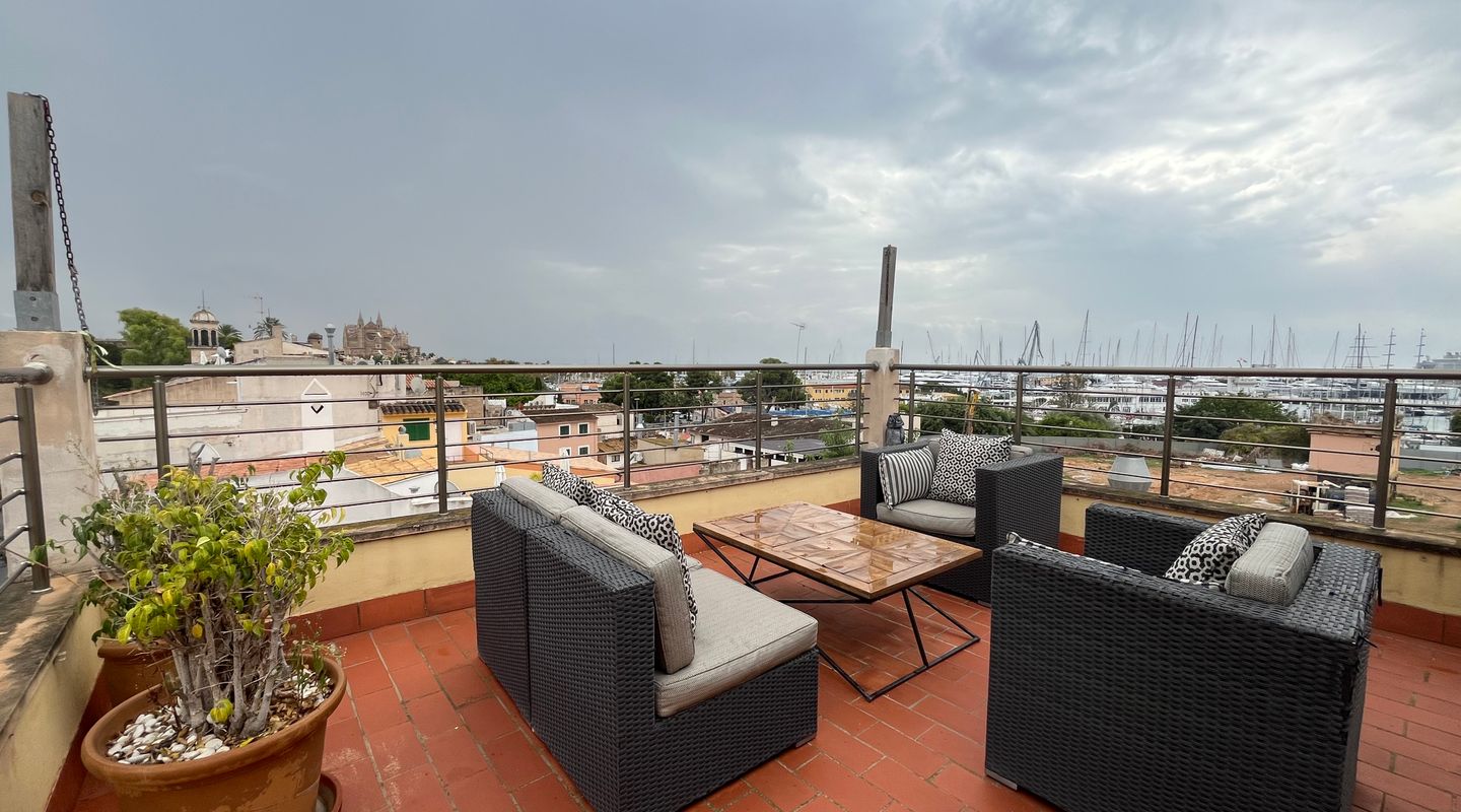 Auf zwei Ebenen verteilt bietet es 60 m² Wohnfläche und zwei herrliche Terrassen: eine 13 m² große Terrasse neben der Küche und eine 38 m² große Dachterrasse mit offenem Blick auf die Kathedrale, das Meer und die Dächer von Palma.
