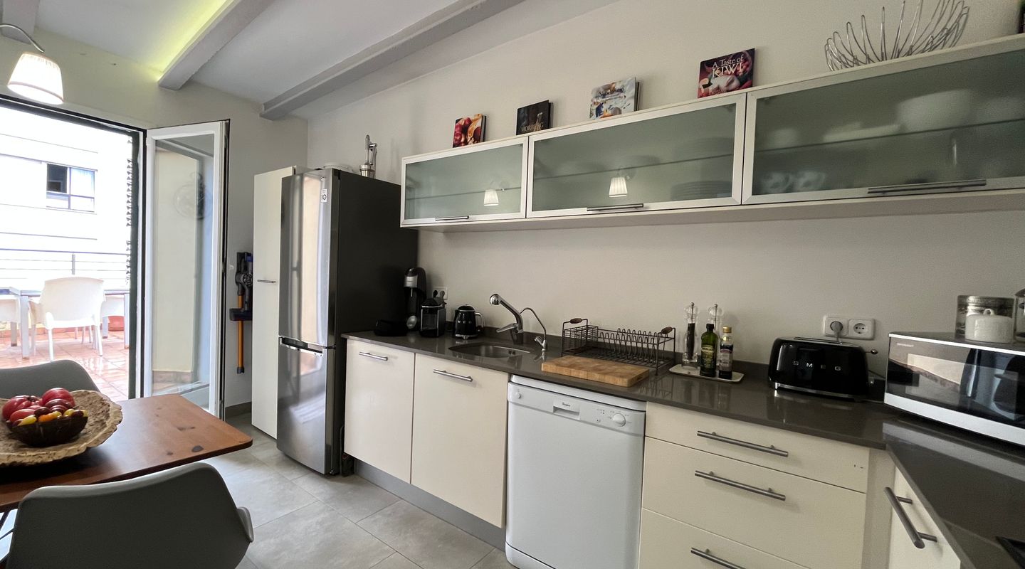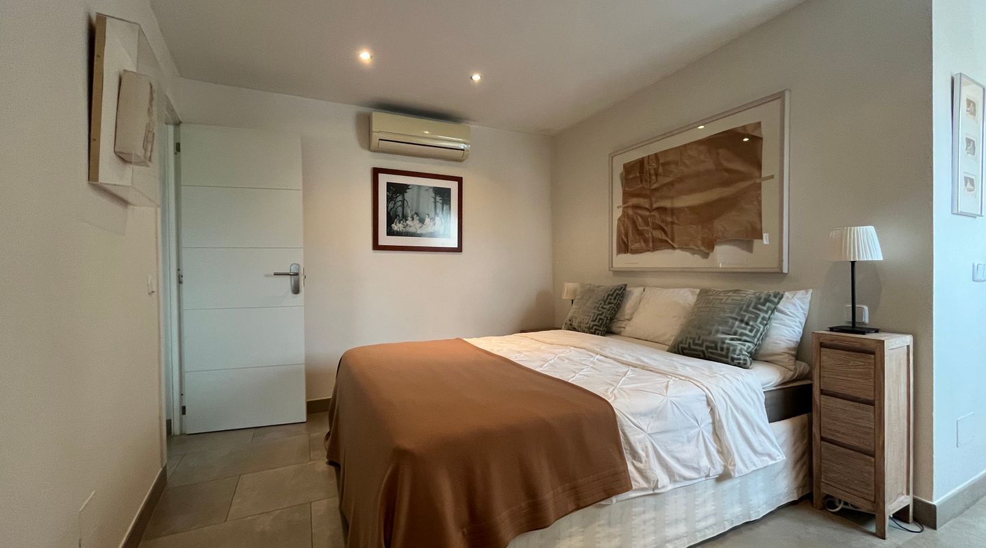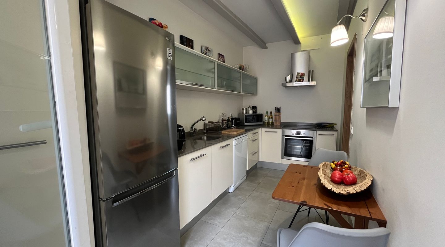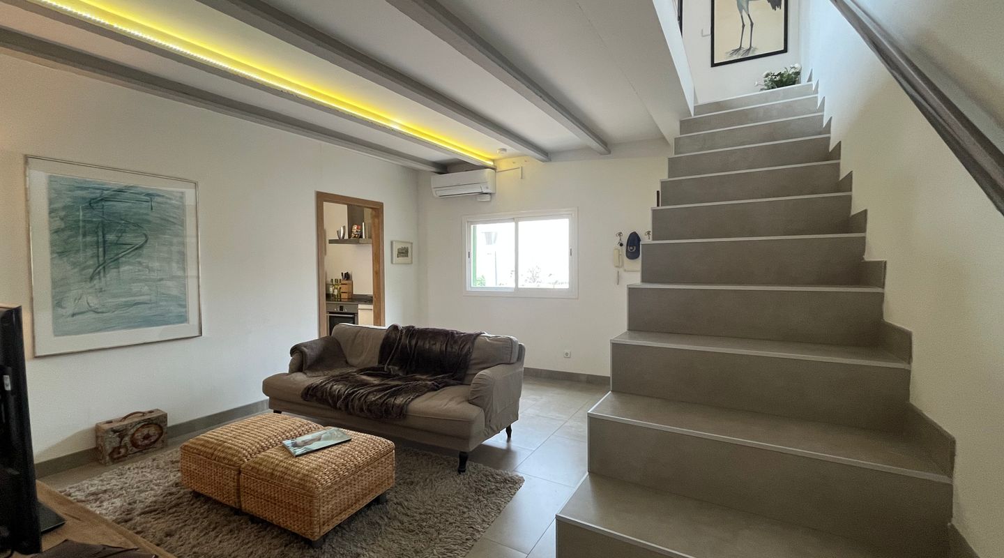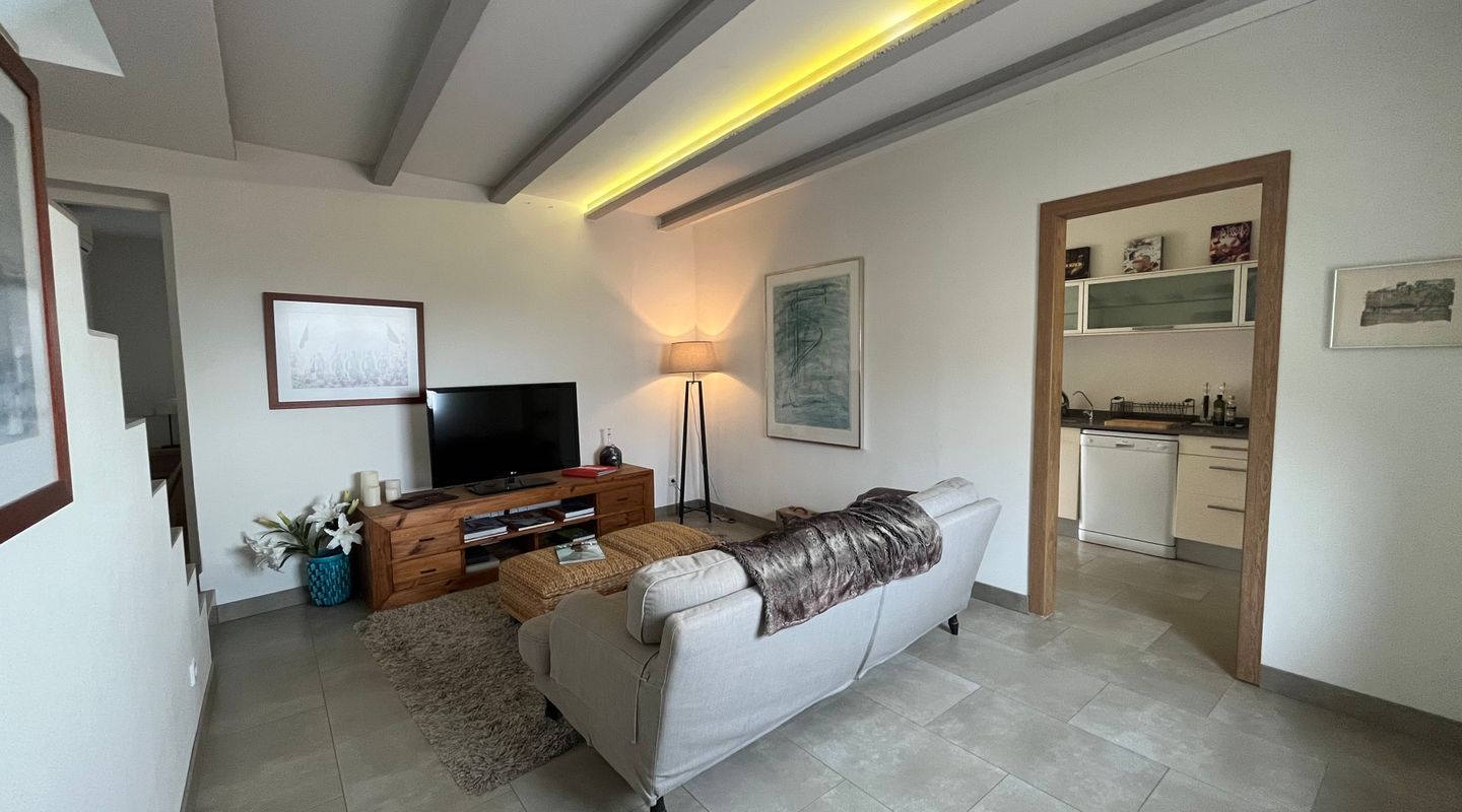 Das Apartment wurde liebevoll gepflegt und geschmackvoll eingerichtet, wodurch eine warme und einladende Atmosphäre entsteht. Auf der Hauptebene befinden sich ein helles Wohnzimmer, eine voll ausgestattete Küche mit hochwertigen Geräten und das Hauptschlafzimmer mit eigenem Bad. Im Obergeschoss öffnet sich ein zweites Schlafzimmer mit Doppelbett zur privaten Dachterrasse – perfekt zum Entspannen oder Genießen mediterraner Abende.