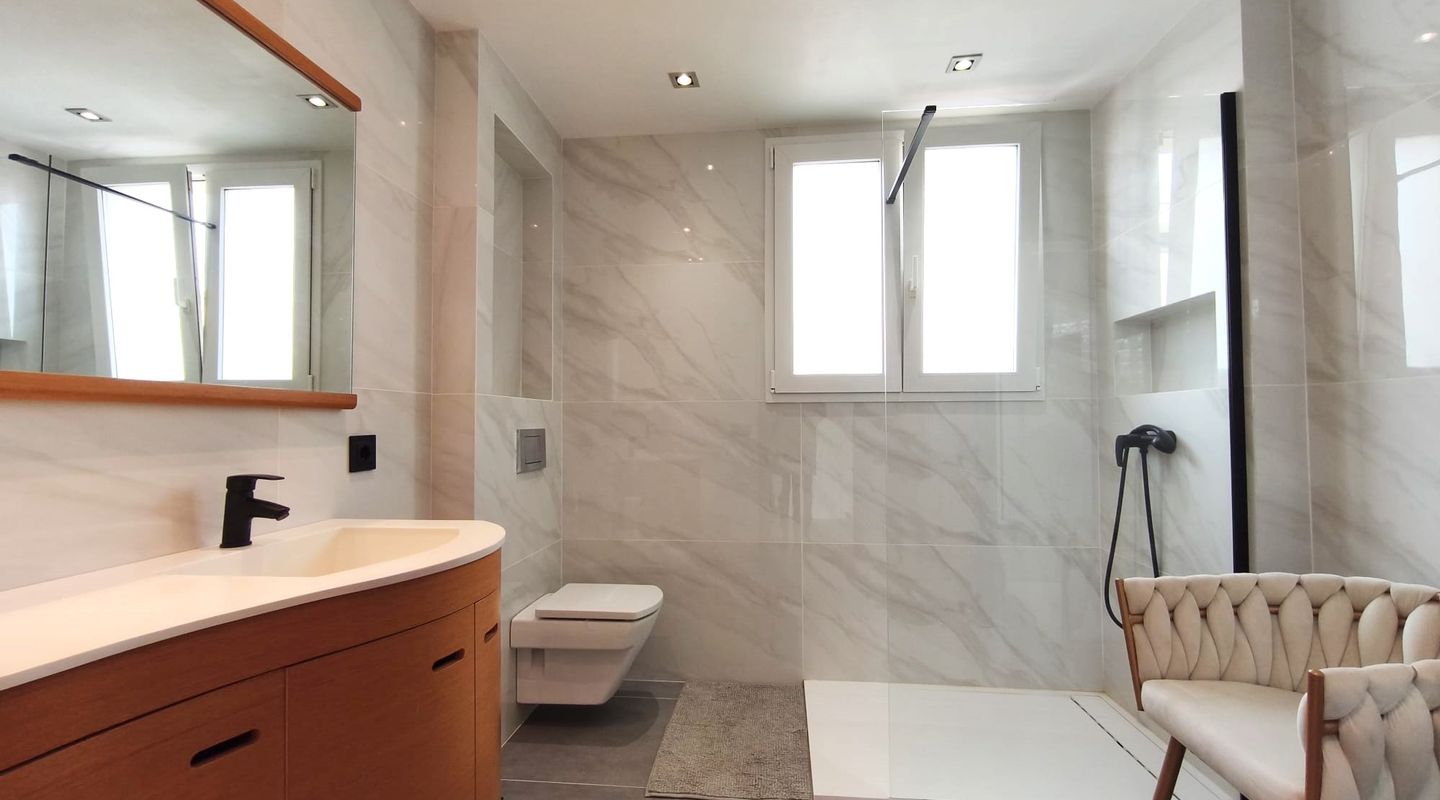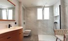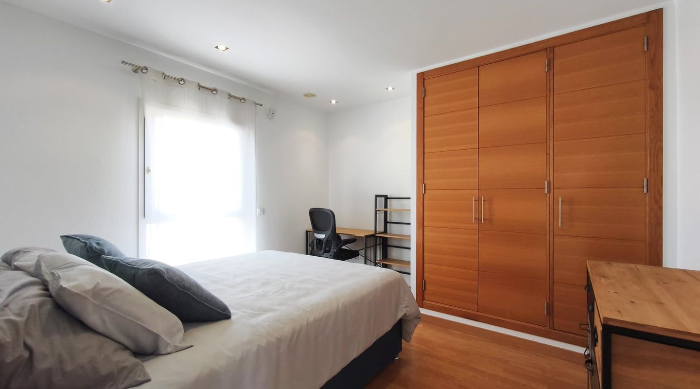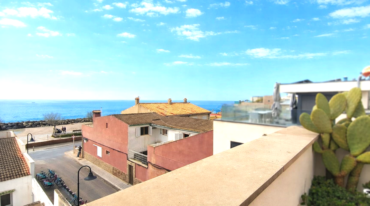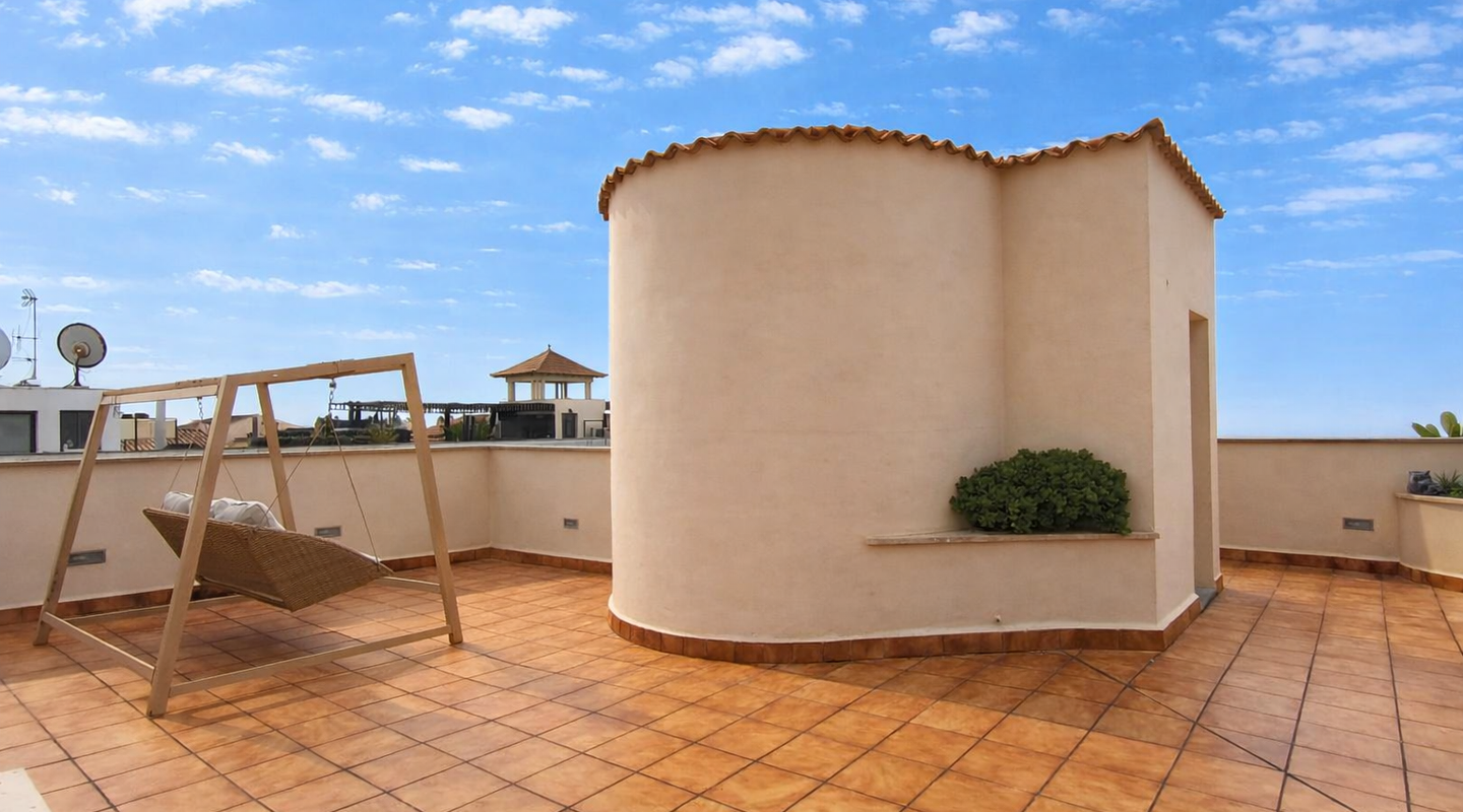 Im ersten Obergeschoss liegen drei geräumige Schlafzimmer. Das Hauptschlafzimmer verfügt über ein en-suite Badezimmer mit Badewanne und Dusche, während die beiden weiteren Schlafzimmer mit Einbauschränken ausgestattet sind und sich ein zweites Badezimmer mit Dusche teilen. Abgerundet wird das Angebot durch eine herrliche Dachterrasse mit ausgezeichnetem Meerblick.