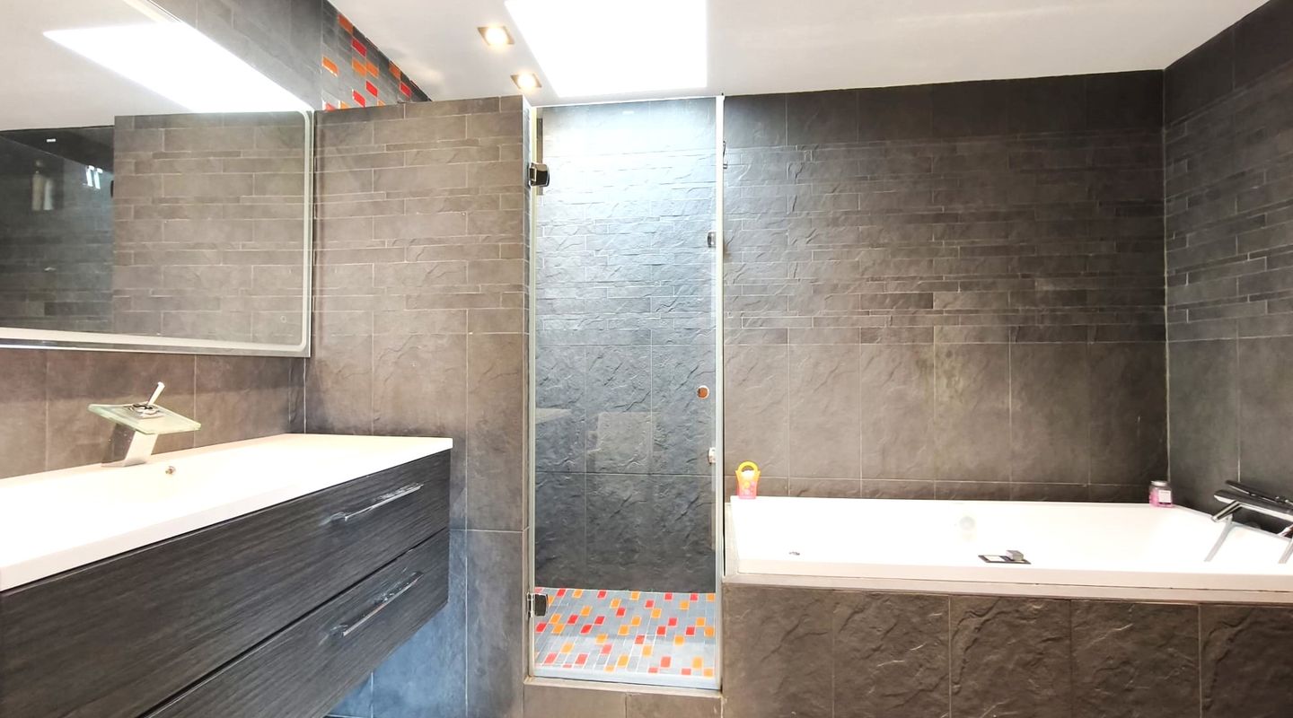 Die Immobilie ist mit einer Klimaanlage (warm/kalt) in allen Räumen ausgestattet und bietet ganzjährigen Wohnkomfort. Weitere Ausstattungsmerkmale sind Marmorböden, eine Garage für ein Fahrzeug sowie ein großzügiger Keller, der derzeit als Fitnessraum genutzt wird und ebenfalls klimatisiert ist.