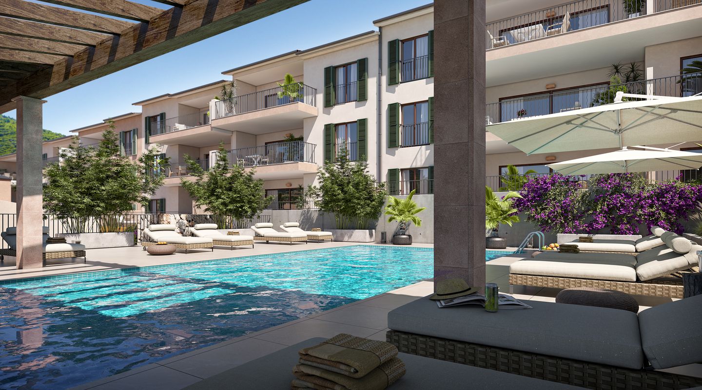 Modern und doch mallorquin gehalten werden am Stadtrand 23 Neubauwohnungen und neun Stadthäuser entstehen. Die Anlage wird über einen Gemeinschaftspool und einen Garten verfügen und bietet genug Parkplätze für alle.