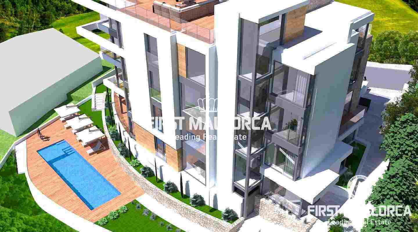 Außerdem gibt es wunderschöne Gärten, große Terrassen und einen Swimmingpool zur gemeinschaftlichen Nutzung. FIRST MALLORCA bietet auch andere Wohneinheiten in dieser exklusiven Anlage an: Gartenwohnungen sowie Apartments im ersten und zweiten Stock mit 2 oder 3 Schlafzimmern sowie Wohnflächen von 94 bis 154 m² oder aber ein spektakuläres Penthouse mit 280 m² und 4 Schlafzimmern sowie zusätzlich 215 m² Terrassenfläche mit Privatpool. Bitte kontaktieren Sie uns für eine detailliertere Präsentation dieses aufregenden neuen Projekts in Palma.