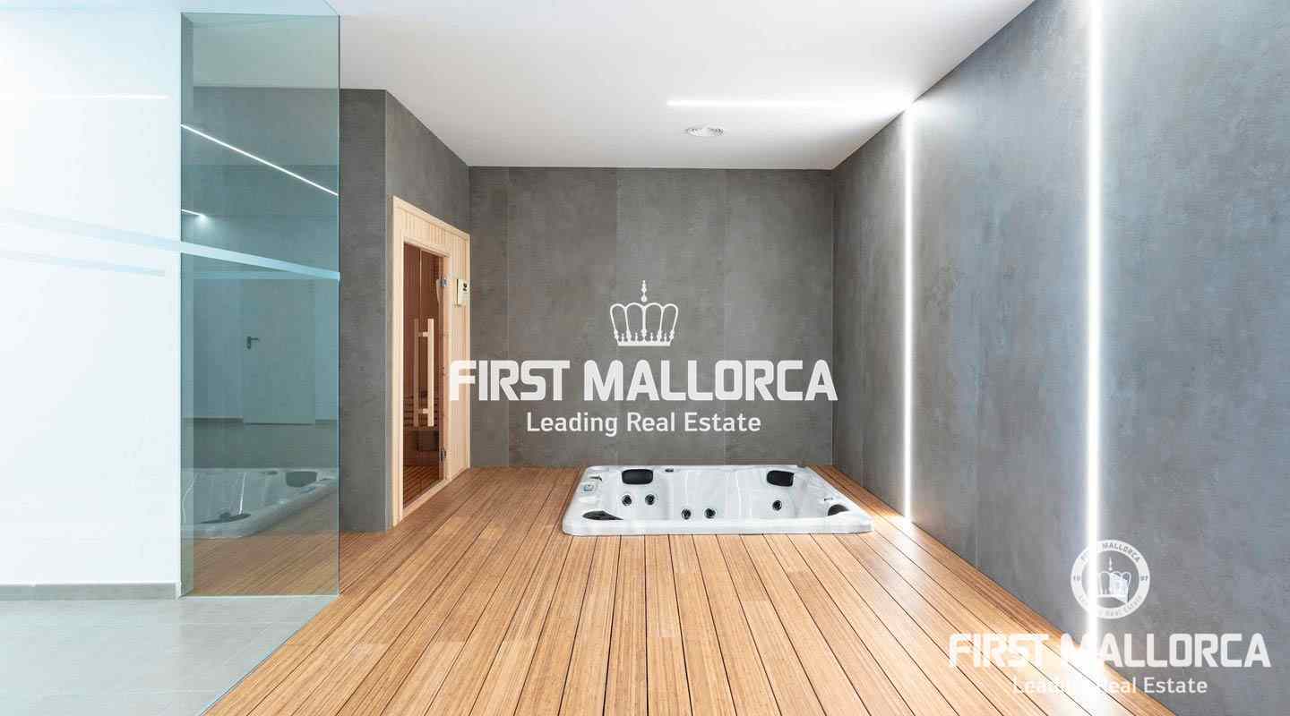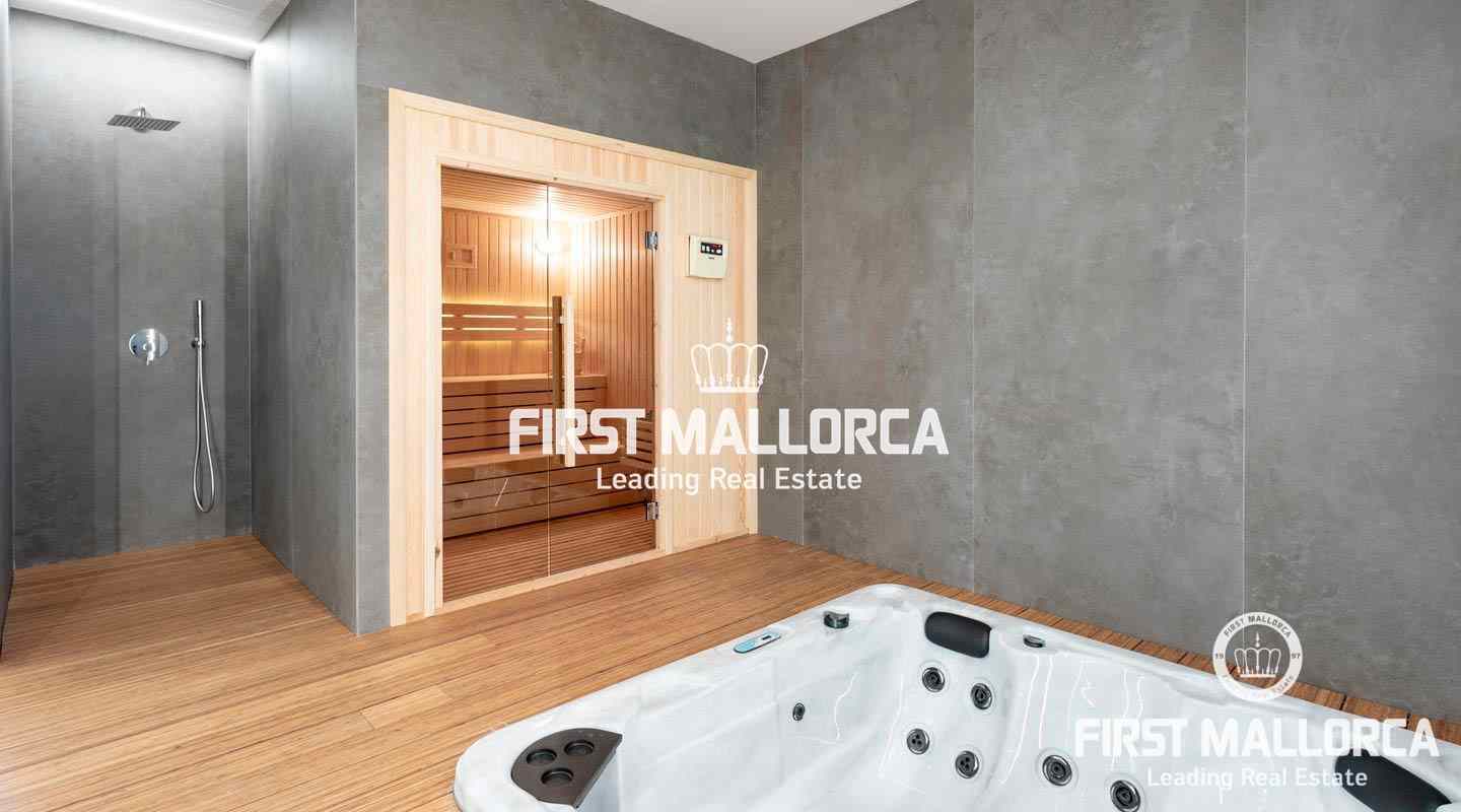 Die luxuriöse Raumaufteilung auf 3 Ebenen bietet einen Wellnessbereich mit Whirlpool, Sauna und Fitnessraum, ein Heimkino und einen Weinkeller. Es gibt auch einen Aufzug, der alle Stockwerke verbindet und eine Garage mit zwei Parkplätzen.