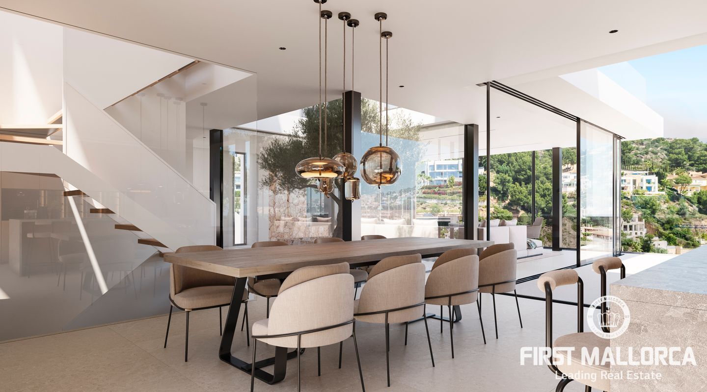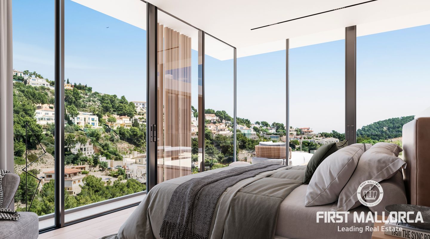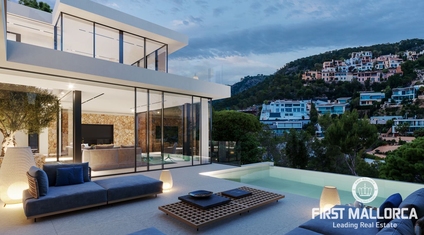 In der prestigeträchtigen Gegend von Costa d'en Blanes, oberhalb des bekannten Puerto Portals gelegen, genießt diese Immobilie eine begehrte Lage im Südwesten Mallorcas. Auf einem großzügigen Hanggrundstück von 838 Quadratmetern bietet es einen beeindruckenden Blick auf das hügelige Tal darunter.
