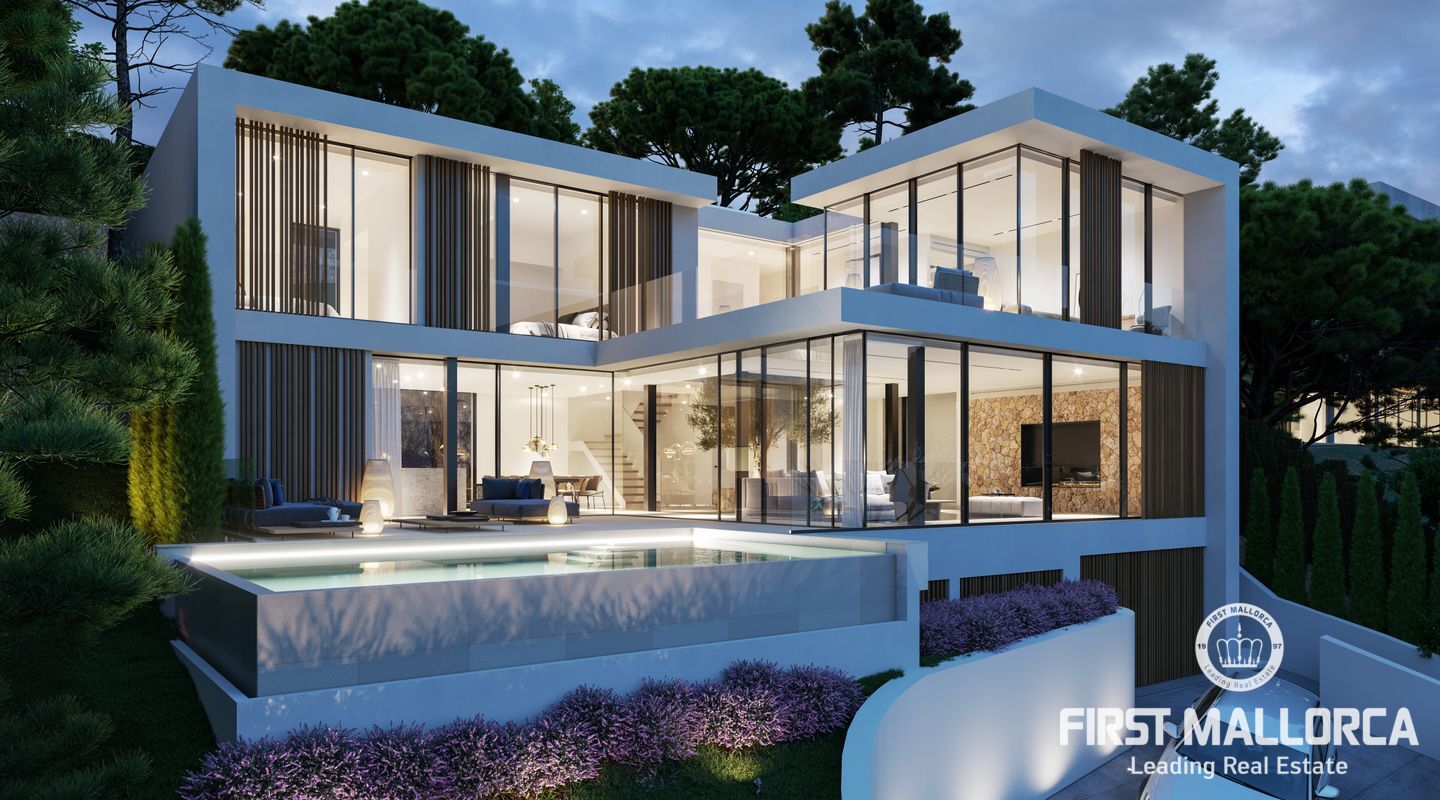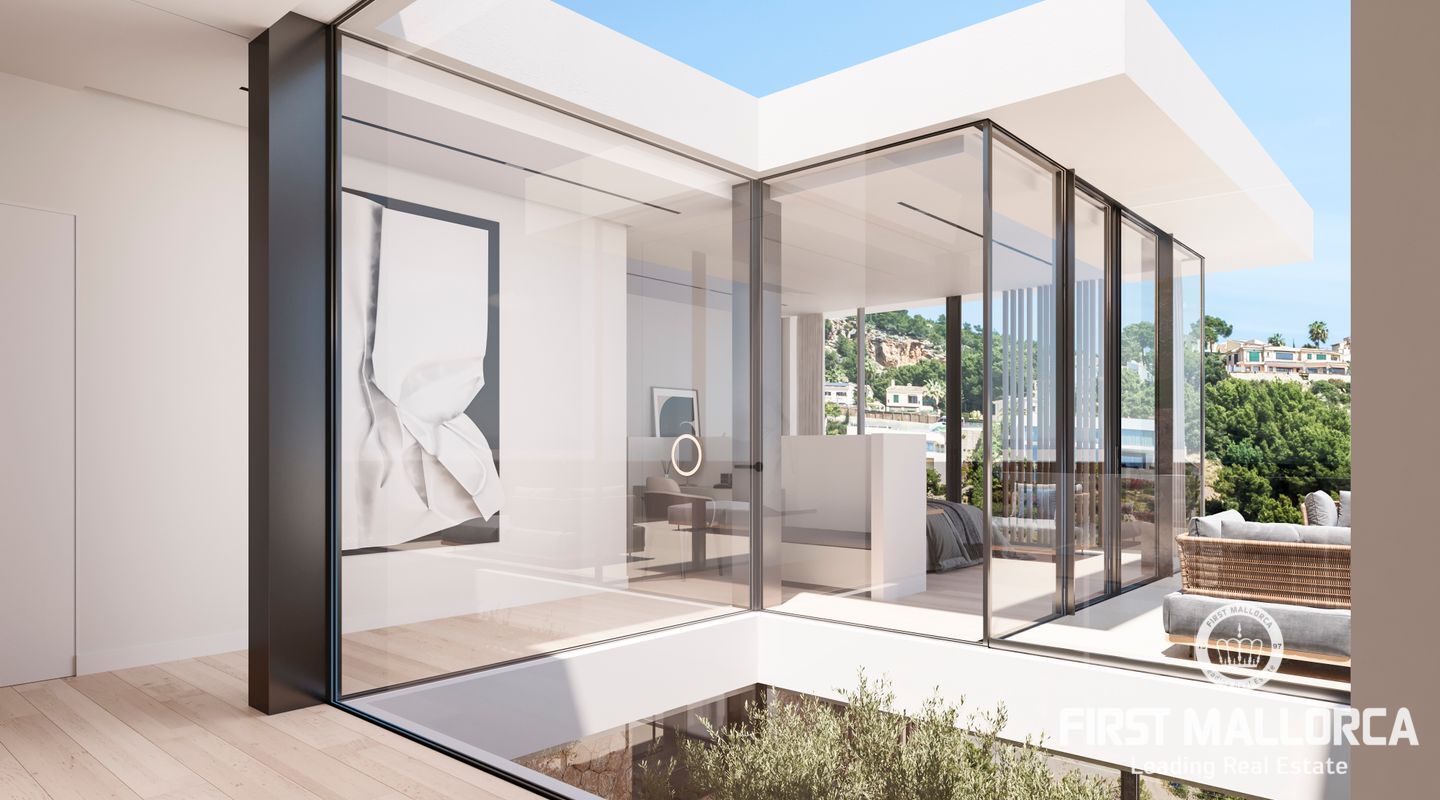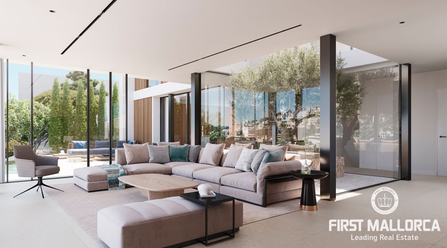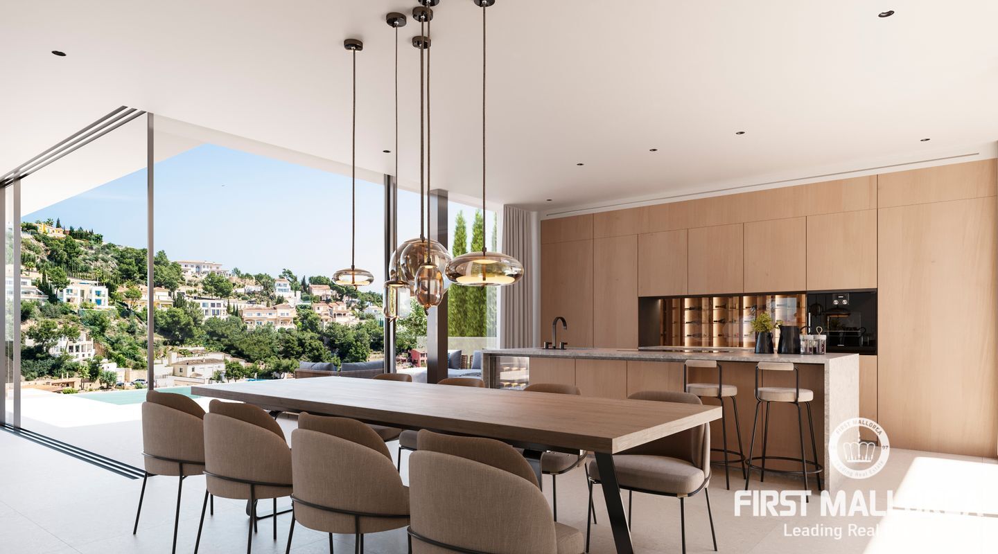 In der prestigeträchtigen Gegend von Costa d'en Blanes, oberhalb des bekannten Puerto Portals gelegen, genießt diese Immobilie eine begehrte Lage im Südwesten Mallorcas. Auf einem großzügigen Hanggrundstück von 838 Quadratmetern bietet es einen beeindruckenden Blick auf das hügelige Tal darunter.