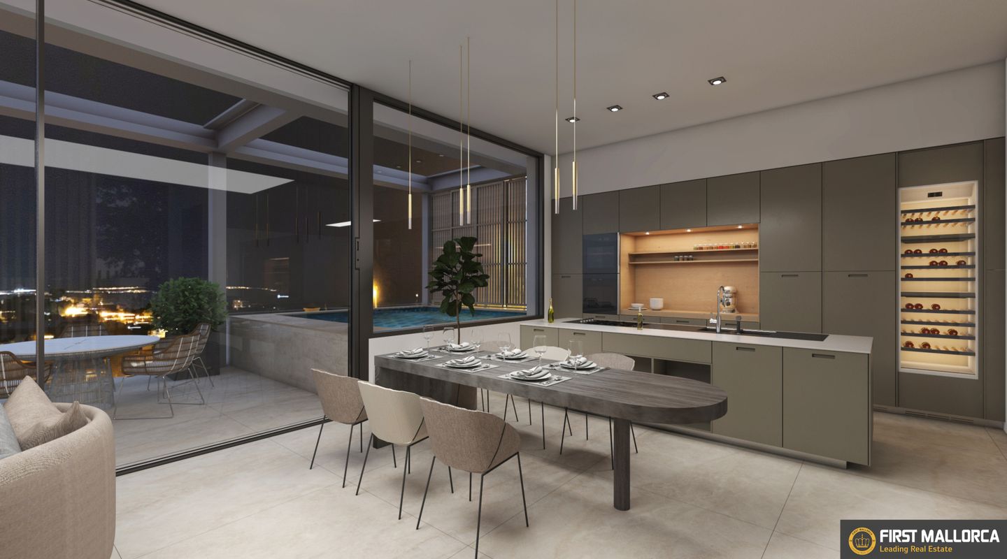 Der offene Wohn- und Essbereich mit Designer-Küche öffnet sich zu einer sonnigen Terrasse mit Meerblick. Ein beheizter Pool und eine elektrisch verstellbare Pergola schaffen das perfekte Ambiente zum Entspannen oder Unterhalten das ganze Jahr über.