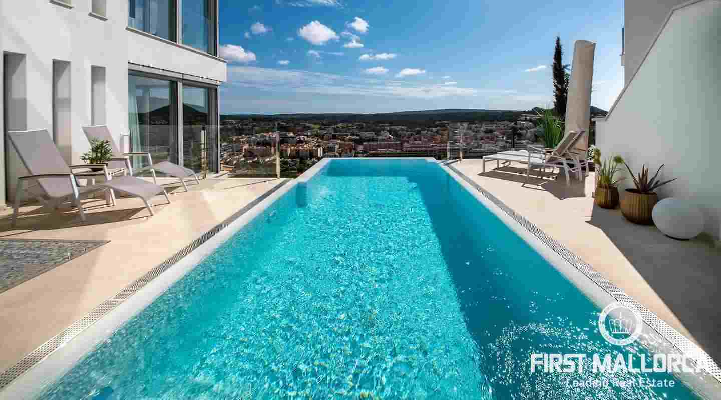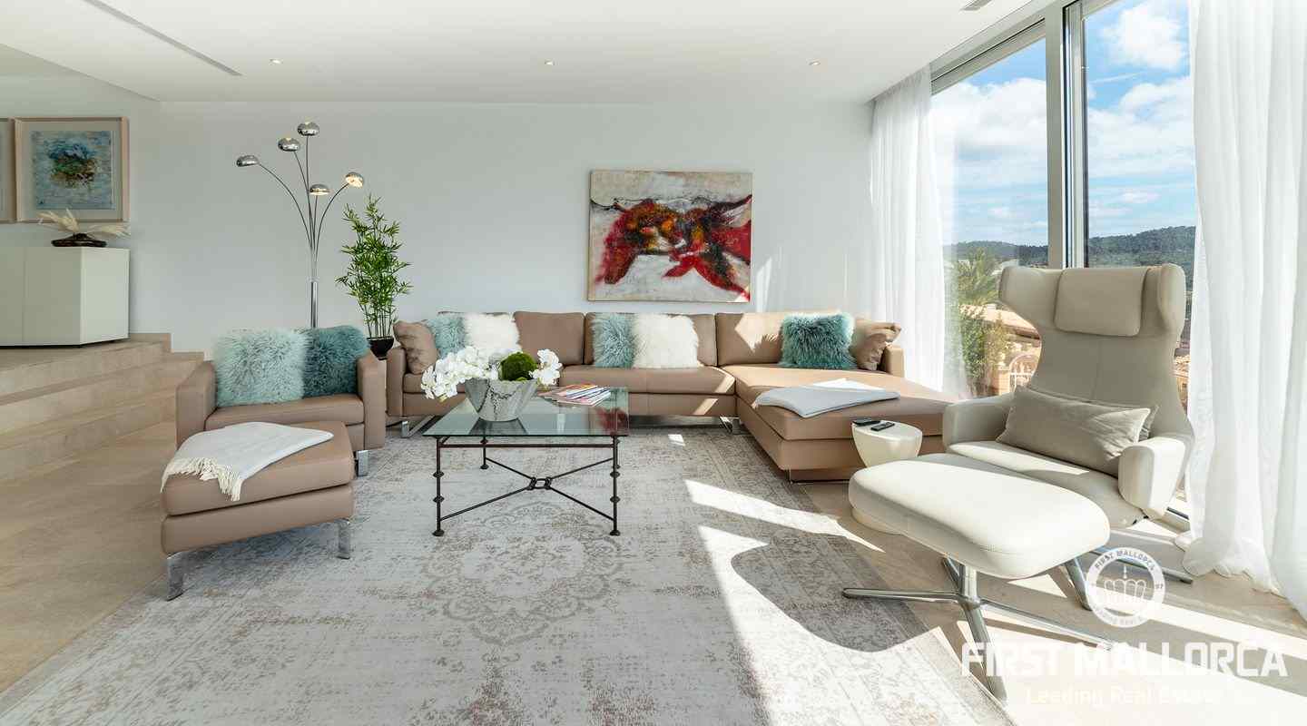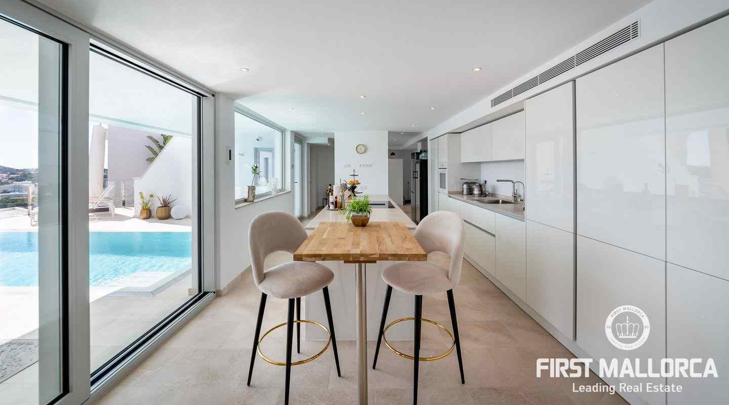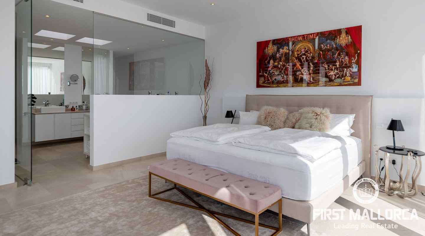 Die moderne, minimalistische Architektur sorgt in den hohen Räumen für reichlich Sonnenlicht und die großen Fensterfronten für einen unverwechselbaren 180º-Panoramablick. Das ausgewogene Designkonzept bietet ein exklusives Interieur mit extravaganten Böden und einer hochwertigen Küche. Eine geräumige Master-Suite und zwei weitere Schlafzimmer, alle mit eigenem Bad, vermitteln ein großzügiges Raumgefühl. Es besteht die Möglichkeit, ein viertes Schlafzimmer mit Bad einzurichten. Der Außenpoolbereich bietet großzügige Terrassen und viel Platz für Familie und Freunde zum Sonnenbaden und Entspannen.