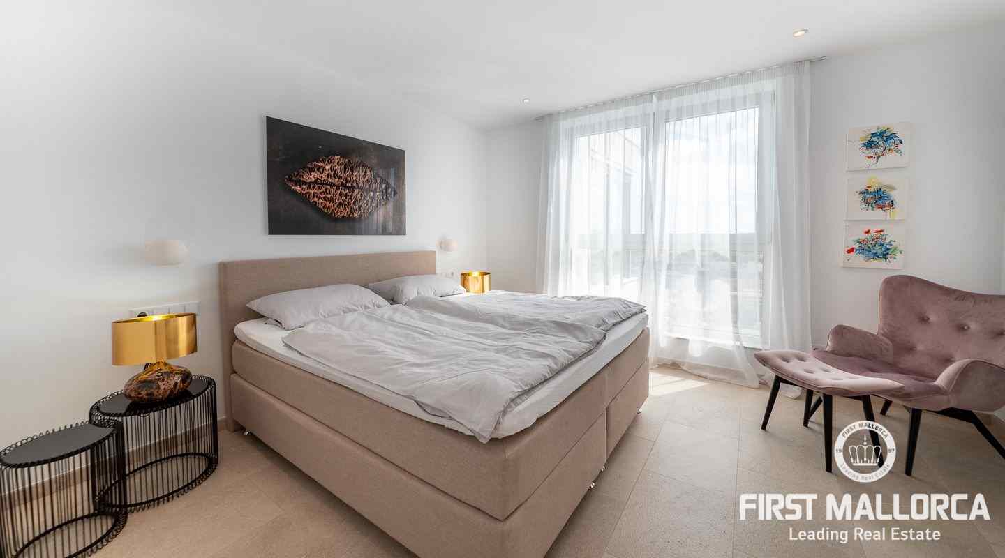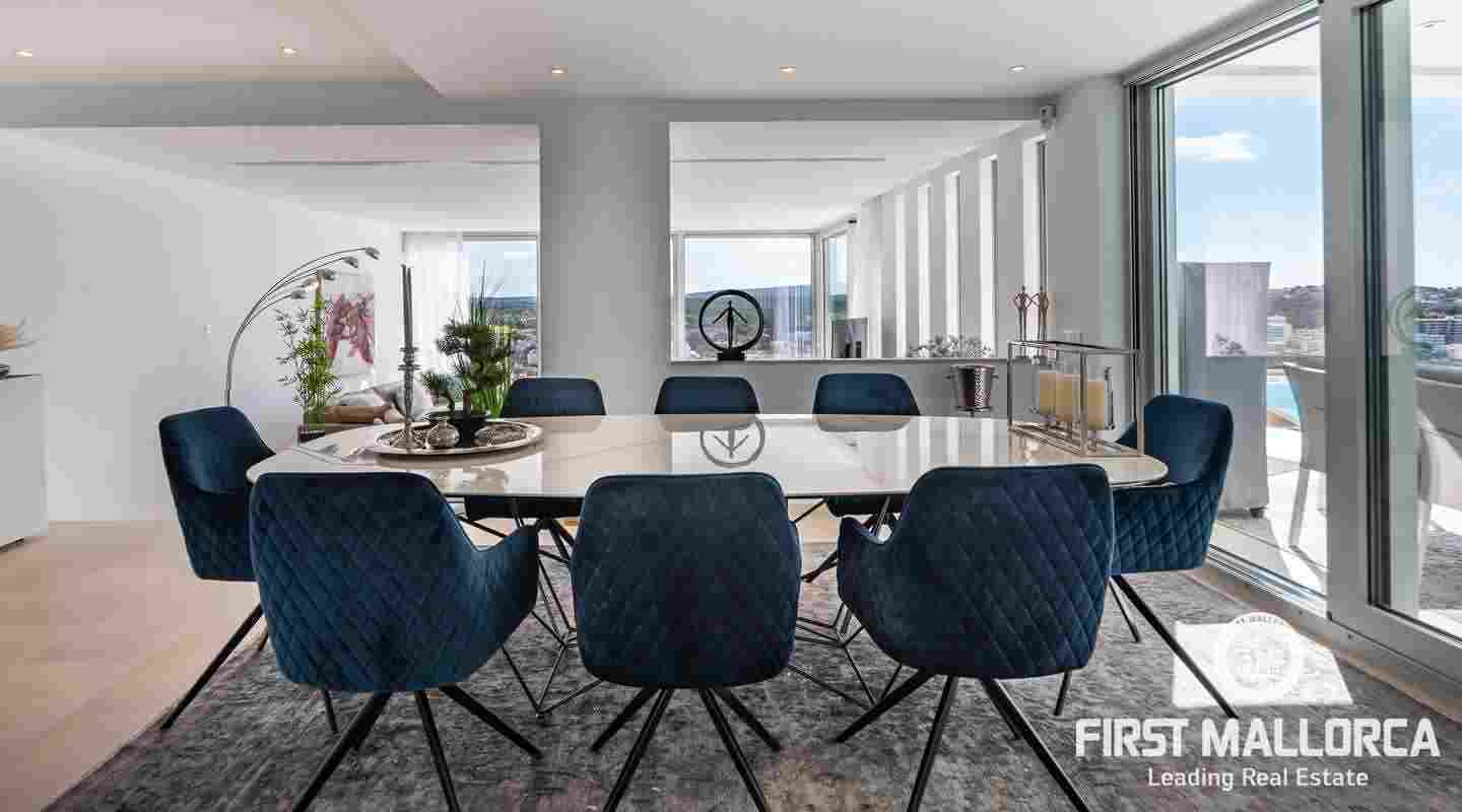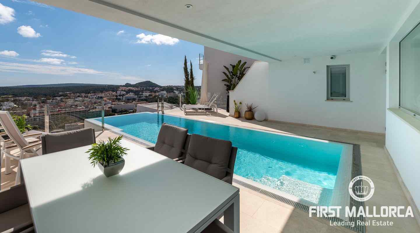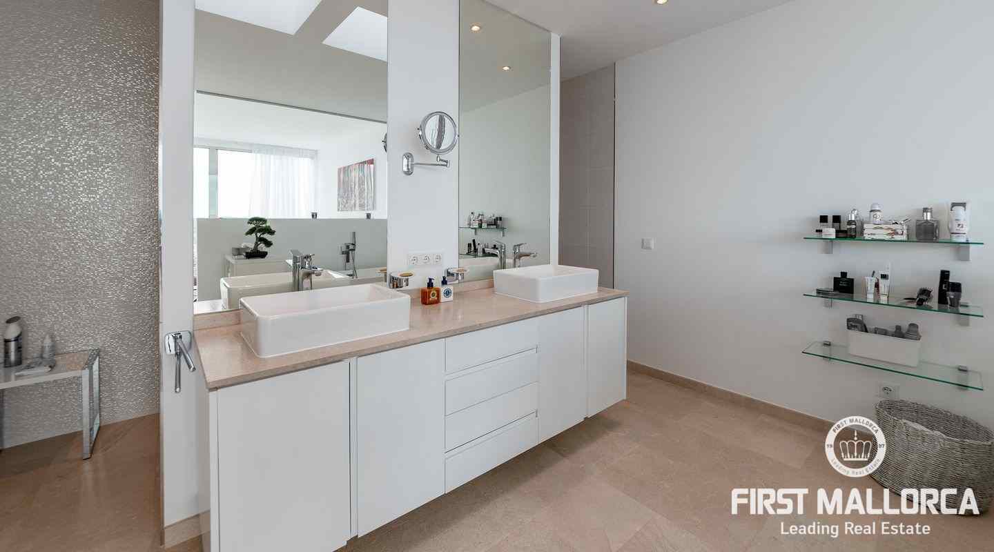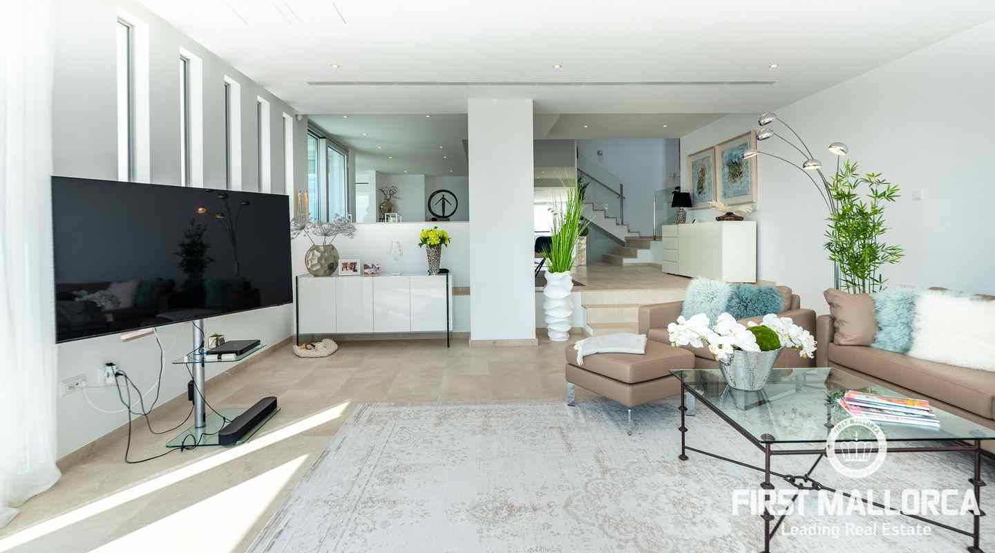 Die moderne, minimalistische Architektur sorgt in den hohen Räumen für reichlich Sonnenlicht und die großen Fensterfronten für einen unverwechselbaren 180º-Panoramablick. Das ausgewogene Designkonzept bietet ein exklusives Interieur mit extravaganten Böden und einer hochwertigen Küche. Eine geräumige Master-Suite und zwei weitere Schlafzimmer, alle mit eigenem Bad, vermitteln ein großzügiges Raumgefühl. Es besteht die Möglichkeit, ein viertes Schlafzimmer mit Bad einzurichten. Der Außenpoolbereich bietet großzügige Terrassen und viel Platz für Familie und Freunde zum Sonnenbaden und Entspannen.