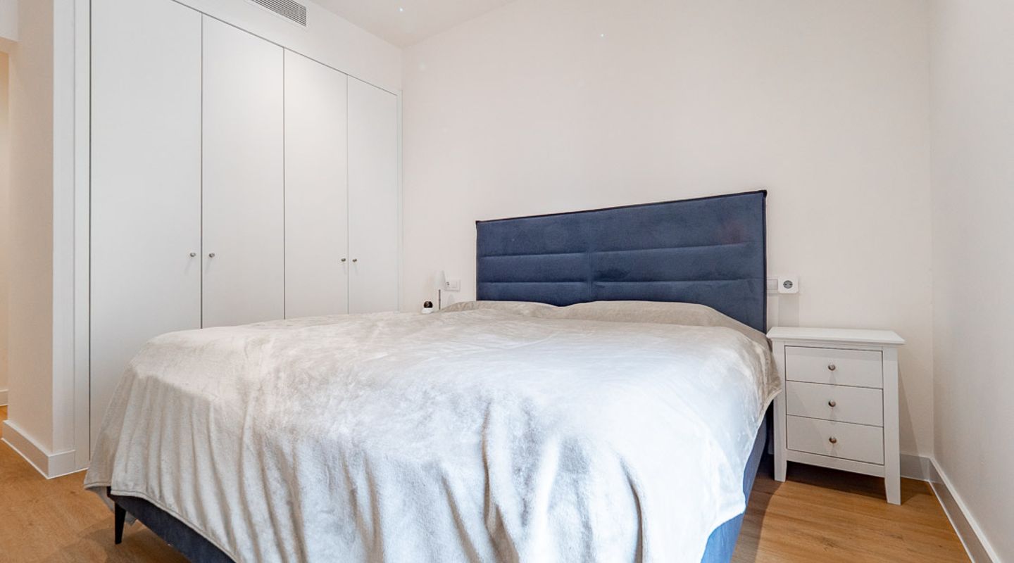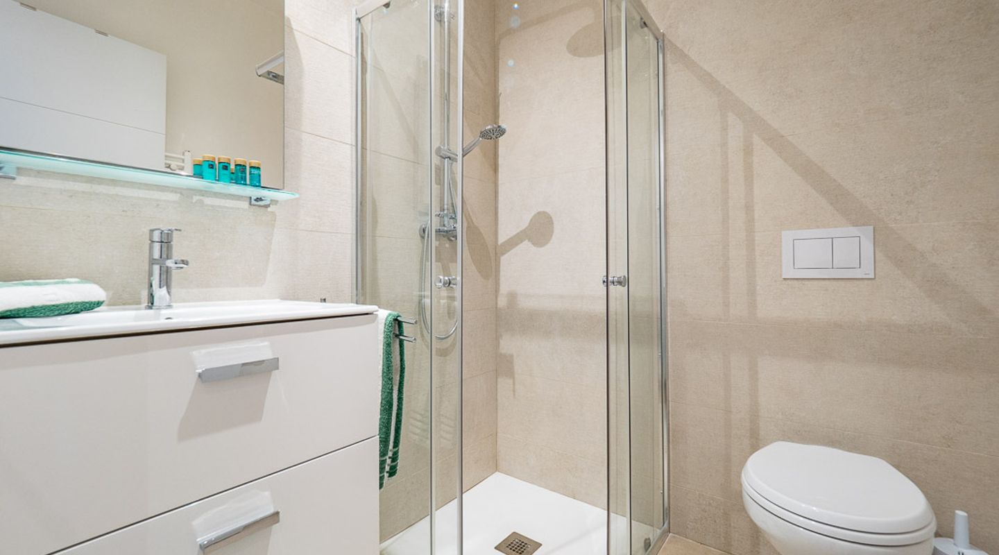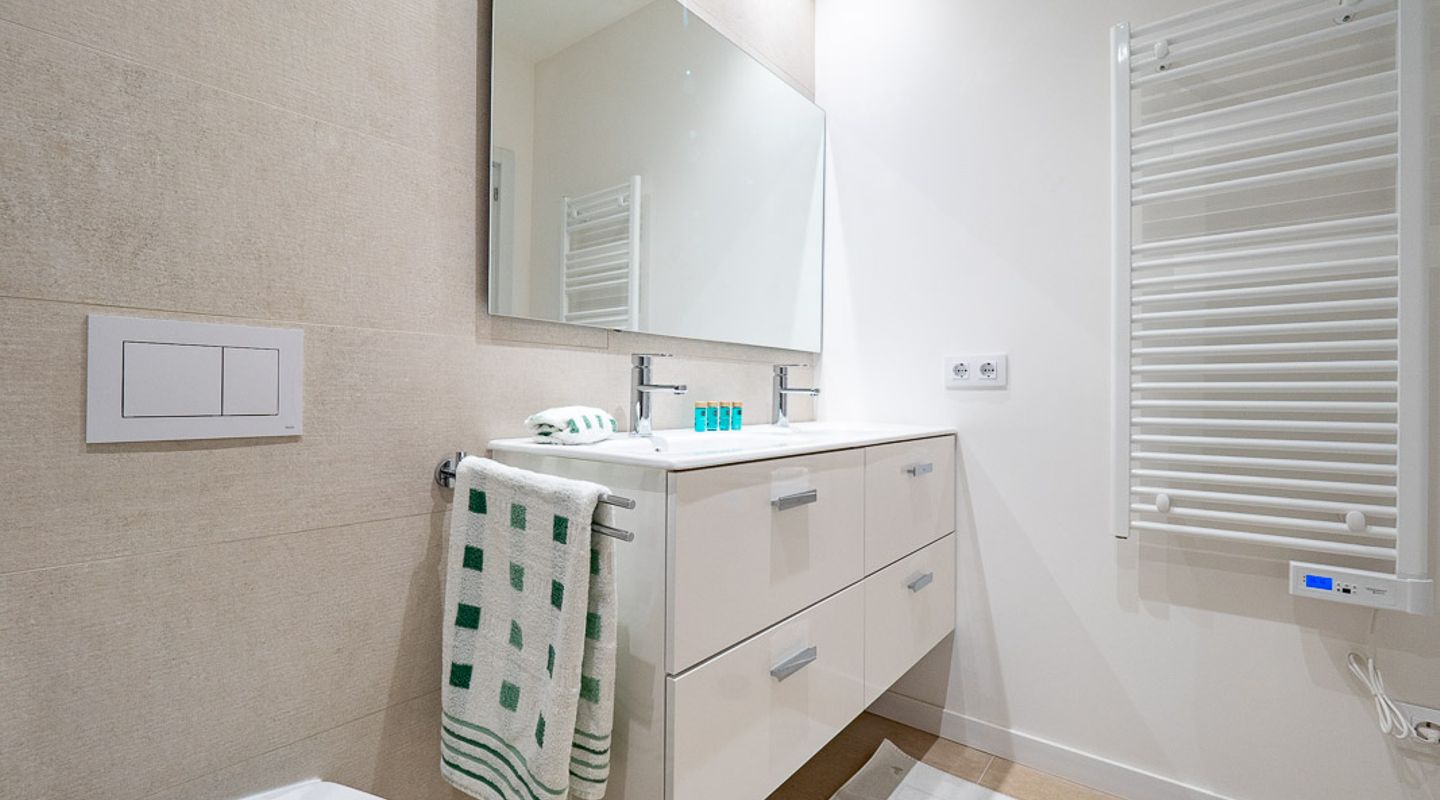 Genießen Sie dank der zentralen Klimaanlage das ganze Jahr über komfortables Wohnen und gönnen Sie sich Entspannung im Wellnessbereich mit beheiztem Innenpool und Sauna. Im Inneren verfügt die Wohnung über ein helles Hauptschlafzimmer mit eigenem Bad, ein zweites Schlafzimmer und ein weiteres modernes Badezimmer. Ein charmanter Balkon ist der ideale Ort für den Morgenkaffee oder ein gemütliches Frühstück im Freien.