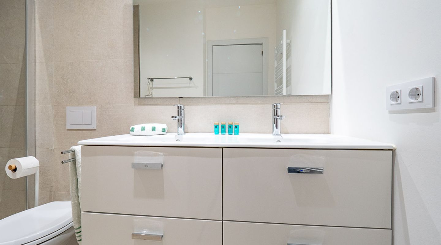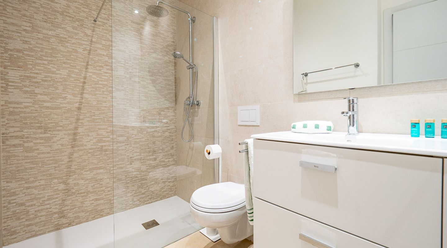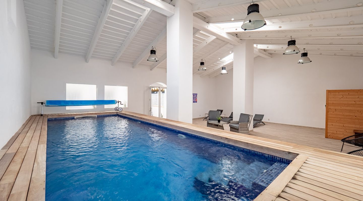 Genießen Sie dank der zentralen Klimaanlage das ganze Jahr über komfortables Wohnen und gönnen Sie sich Entspannung im Wellnessbereich mit beheiztem Innenpool und Sauna. Im Inneren verfügt die Wohnung über ein helles Hauptschlafzimmer mit eigenem Bad, ein zweites Schlafzimmer und ein weiteres modernes Badezimmer. Ein charmanter Balkon ist der ideale Ort für den Morgenkaffee oder ein gemütliches Frühstück im Freien.