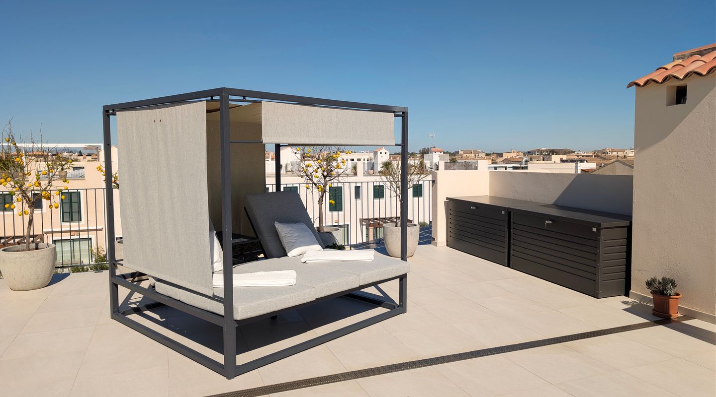 Ein besonderes Highlight ist die rund 70 m² große, private Dachterrasse mit beeindruckendem Blick auf das Meer, die Insel Cabrera und die mallorquinische Landschaft.
