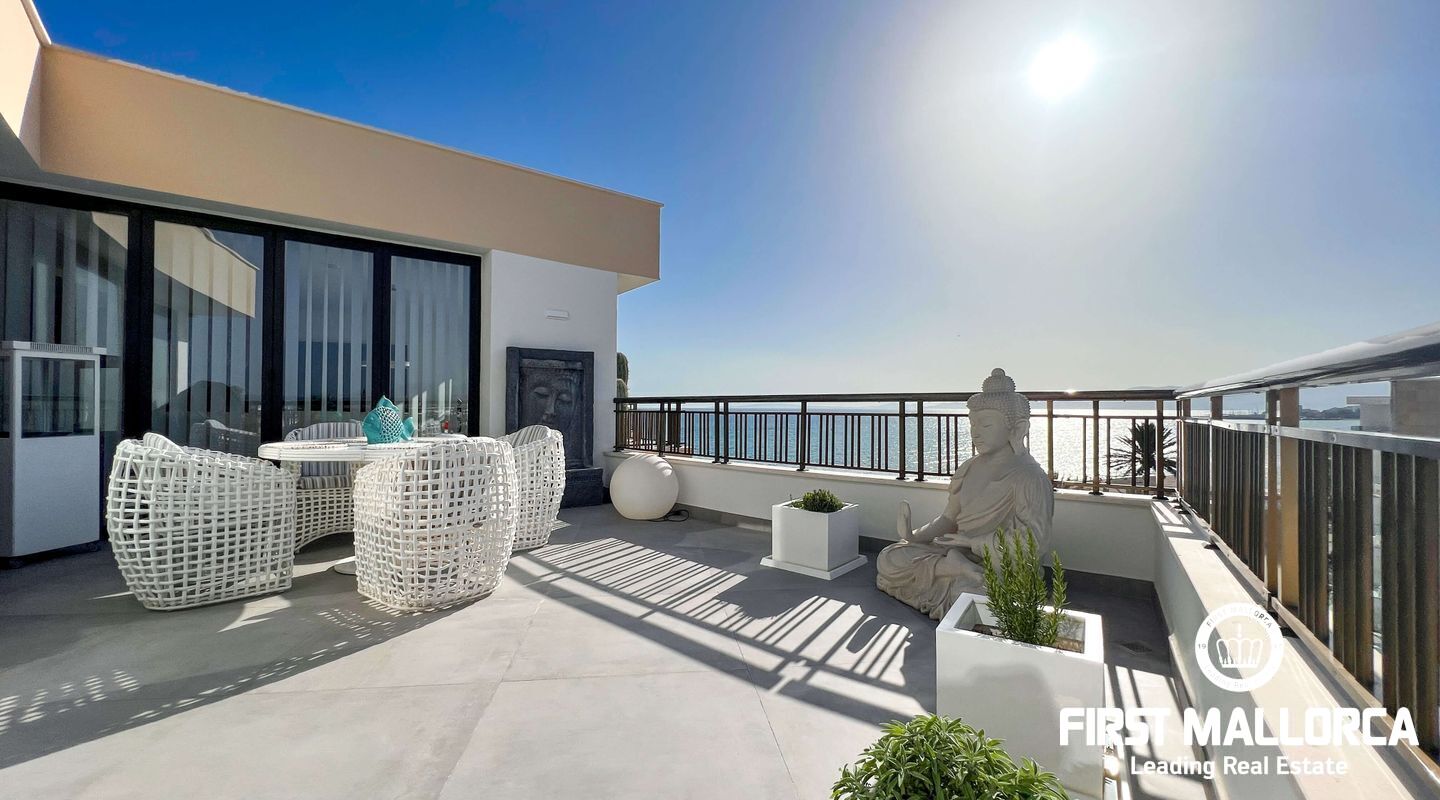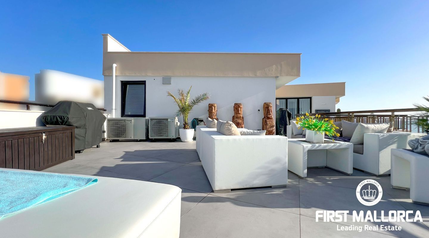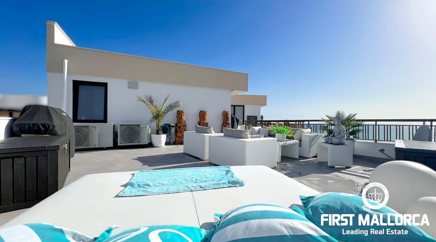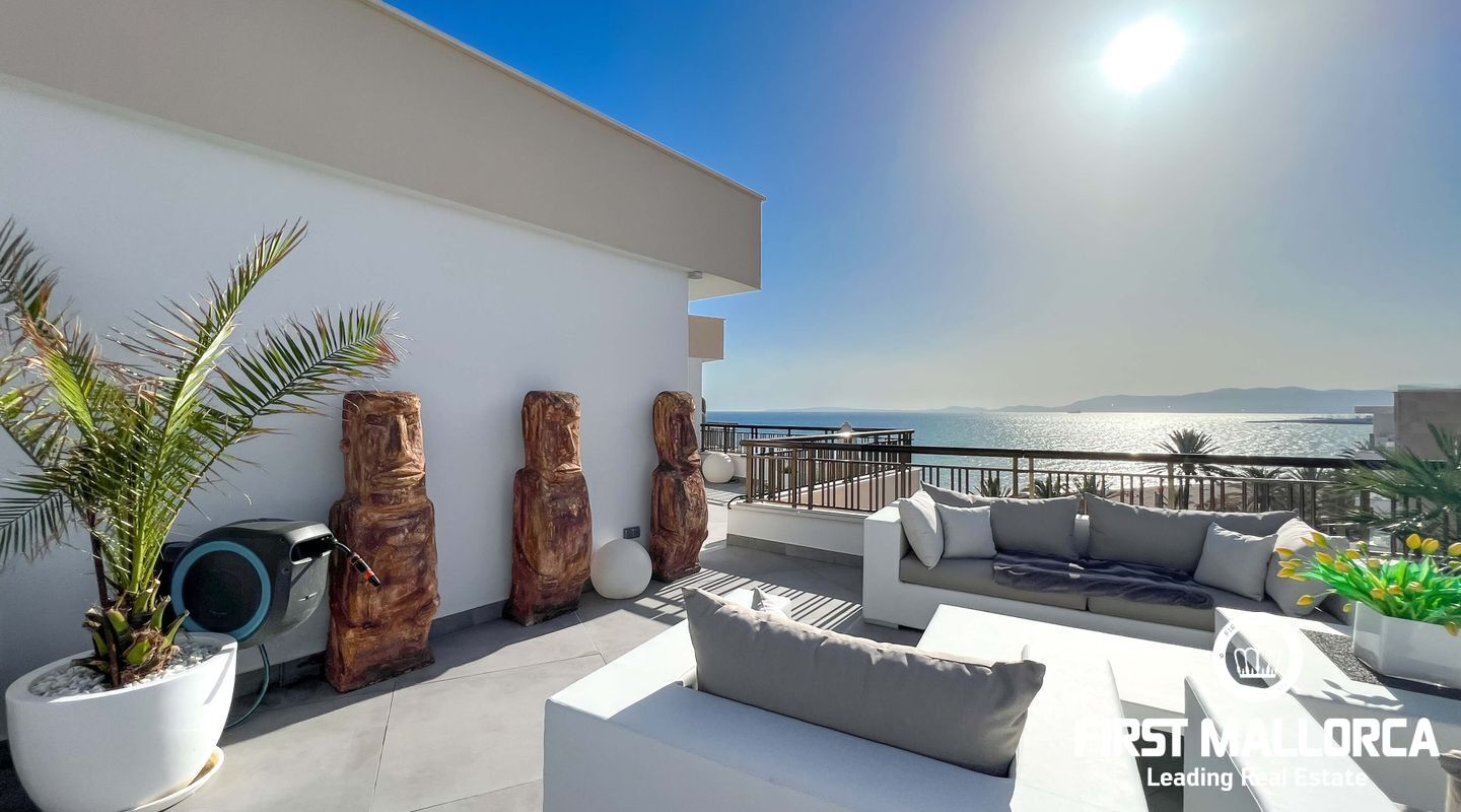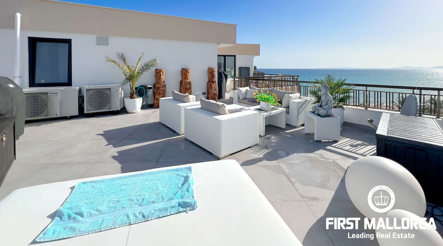 Dieses außergewöhnliche Penthouse im sechsten Stock eines gepflegten Gebäudes mit Aufzug befindet sich direkt an der ersten Meereslinie der begehrten Playa de Palma (in La Ribera). Hier genießen Sie einen unvergleichlichen Blick auf das prachtvolle Mittelmeer und den wunderschönen Sandstrand mit kristallklarem Wasser. Auf einer großzügigen Wohnfläche von etwa 102 m² und 84 m² Terrasse mit atemberaubendem Meerblick lassen sich Komfort und Luxus in vollen Zügen auskosten. Der lichtdurchflutete Wohnbereich überzeugt durch ein geräumiges Wohn-Esszimmer mit Panorama-Schiebefenstern, die Sie vollständig öffnen können Ihnen das Gefühl geben, direkt am Meer zu leben. Die luxuriöse Küche ist mit hochwertigen Gaggenau-Geräten ausgestattet und bietet alles, was das Herz eines ambitionierten Hobbykochs begehrt. Drei Schlafzimmer bieten ausreichend Platz und Rückzugsmöglichkeiten. Zwei moderne Badezimmer, eines davon en suite, sind mit hochwertigen Materialien und stilvollen Details ausgestattet, die keine Wünsche offen lassen. Das Highlight dieses Penthouses sind die großzügigen Terrassenbereiche, die Ihnen einen unvergleichlichen 360°-Blick auf das Meer und das Tramuntana-Gebirge bieten. Dieser Chill-out-Bereich lädt zu gemütlichen Mahlzeiten und entspannten Stunden mit Freunden und Familie ein. Hier können Sie die mediterrane Lebensart in vollen Zügen genießen und unvergessliche Sonnenuntergänge erleben. Zu den weiteren herausragenden Merkmalen dieser Immobilie zählen eine Fußbodenheizung mit Wärmepumpe, dreifach verglaste Fenster und stilvolle Fliesen, die ein elegantes Wohnambiente schaffen. Ein privater Parkplatz bietet ausreichend Platz für Ihr Fahrzeug. Ein weiterer Vorteil dieses exklusiven Penthouses ist das geräumige, komplett renovierte "Lokal" im Untergeschoss des Gebäudes, das jedoch als Lagerraum genutzt wird. Dieses bietet zusätzlichen Stauraum und vielfältige Nutzungsmöglichkeiten. Die Fassade dieser fantastischen Immobilie wurde kürzlich erneuert und fügt sich harmonisch in die Umgebung ein. Dank der unschlagbaren Lage an der Playa de Palma profitieren Sie von einer idealen Anbindung an den Flughafen sowie von zahlreichen Restaurants, Bars und Annehmlichkeiten in unmittelbarer Nähe. Dieses Penthouse in La Ribera ist ein echtes Juwel, das Luxus und Komfort in perfekter Harmonie vereint. Erleben Sie das mediterrane Lebensgefühl in einer der begehrtesten Lagen Mallorcas und machen Sie dieses Traumdomizil zu Ihrem neuen Zuhause. Zögern Sie nicht und vereinbaren Sie noch heute einen Besichtigungstermin, um sich von der Einzigartigkeit dieser Immobilie selbst zu überzeugen.