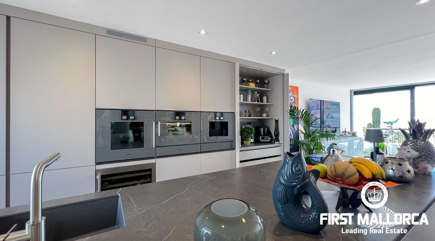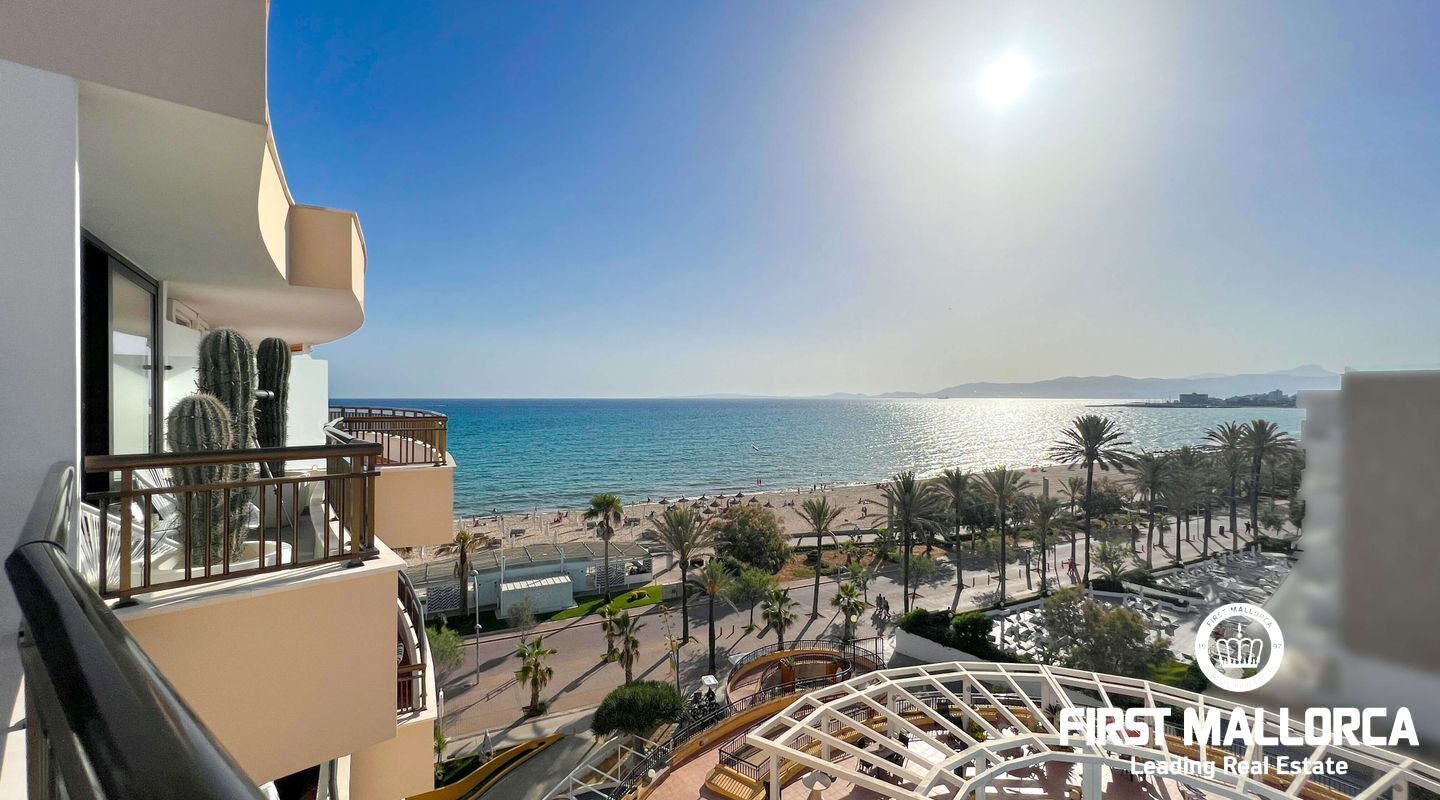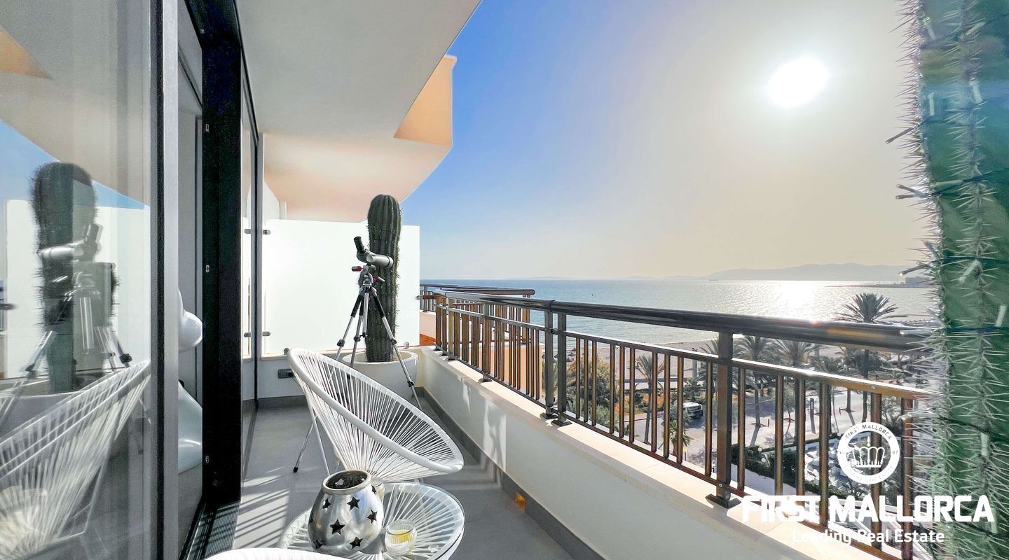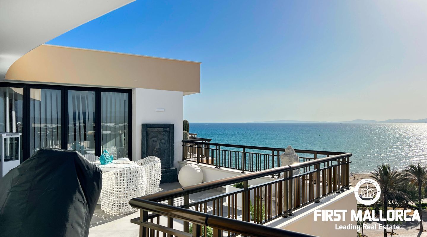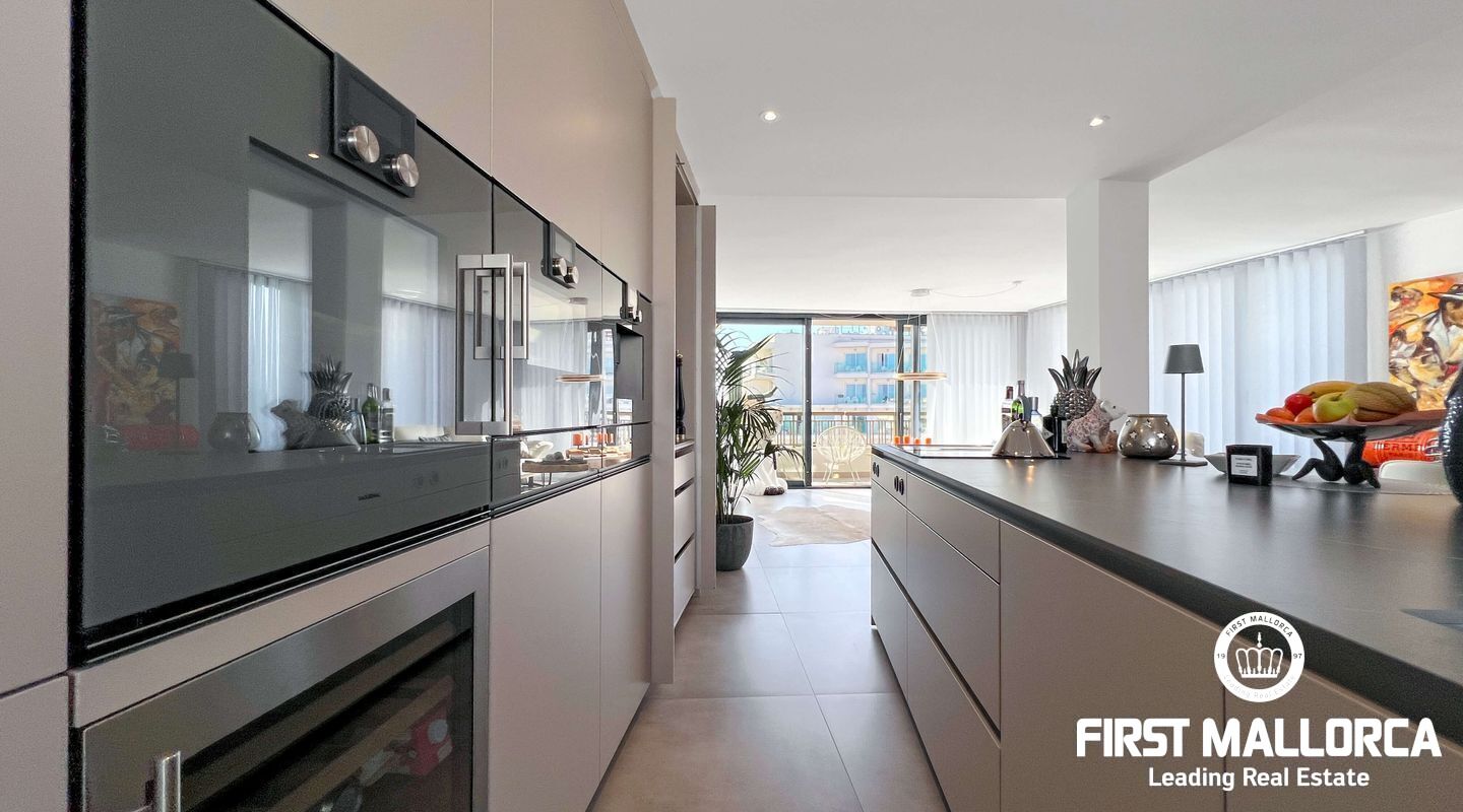 Dieses außergewöhnliche Penthouse im sechsten Stock eines gepflegten Gebäudes mit Aufzug befindet sich direkt an der ersten Meereslinie der begehrten Playa de Palma (in La Ribera). Hier genießen Sie einen unvergleichlichen Blick auf das prachtvolle Mittelmeer und den wunderschönen Sandstrand mit kristallklarem Wasser. Auf einer großzügigen Wohnfläche von etwa 102 m² und 84 m² Terrasse mit atemberaubendem Meerblick lassen sich Komfort und Luxus in vollen Zügen auskosten. Der lichtdurchflutete Wohnbereich überzeugt durch ein geräumiges Wohn-Esszimmer mit Panorama-Schiebefenstern, die Sie vollständig öffnen können Ihnen das Gefühl geben, direkt am Meer zu leben. Die luxuriöse Küche ist mit hochwertigen Gaggenau-Geräten ausgestattet und bietet alles, was das Herz eines ambitionierten Hobbykochs begehrt. Drei Schlafzimmer bieten ausreichend Platz und Rückzugsmöglichkeiten. Zwei moderne Badezimmer, eines davon en suite, sind mit hochwertigen Materialien und stilvollen Details ausgestattet, die keine Wünsche offen lassen. Das Highlight dieses Penthouses sind die großzügigen Terrassenbereiche, die Ihnen einen unvergleichlichen 360°-Blick auf das Meer und das Tramuntana-Gebirge bieten. Dieser Chill-out-Bereich lädt zu gemütlichen Mahlzeiten und entspannten Stunden mit Freunden und Familie ein. Hier können Sie die mediterrane Lebensart in vollen Zügen genießen und unvergessliche Sonnenuntergänge erleben. Zu den weiteren herausragenden Merkmalen dieser Immobilie zählen eine Fußbodenheizung mit Wärmepumpe, dreifach verglaste Fenster und stilvolle Fliesen, die ein elegantes Wohnambiente schaffen. Ein privater Parkplatz bietet ausreichend Platz für Ihr Fahrzeug. Ein weiterer Vorteil dieses exklusiven Penthouses ist das geräumige, komplett renovierte "Lokal" im Untergeschoss des Gebäudes, das jedoch als Lagerraum genutzt wird. Dieses bietet zusätzlichen Stauraum und vielfältige Nutzungsmöglichkeiten. Die Fassade dieser fantastischen Immobilie wurde kürzlich erneuert und fügt sich harmonisch in die Umgebung ein. Dank der unschlagbaren Lage an der Playa de Palma profitieren Sie von einer idealen Anbindung an den Flughafen sowie von zahlreichen Restaurants, Bars und Annehmlichkeiten in unmittelbarer Nähe. Dieses Penthouse in La Ribera ist ein echtes Juwel, das Luxus und Komfort in perfekter Harmonie vereint. Erleben Sie das mediterrane Lebensgefühl in einer der begehrtesten Lagen Mallorcas und machen Sie dieses Traumdomizil zu Ihrem neuen Zuhause. Zögern Sie nicht und vereinbaren Sie noch heute einen Besichtigungstermin, um sich von der Einzigartigkeit dieser Immobilie selbst zu überzeugen.