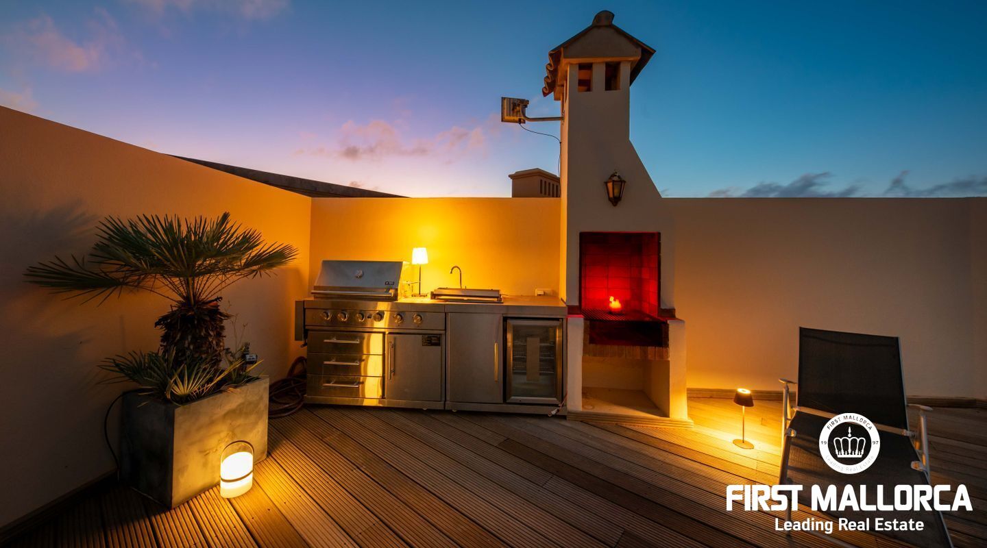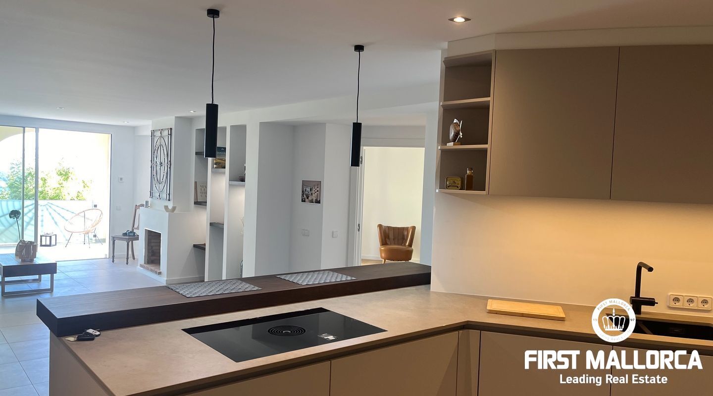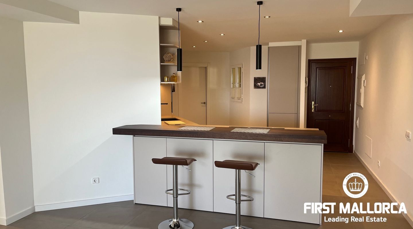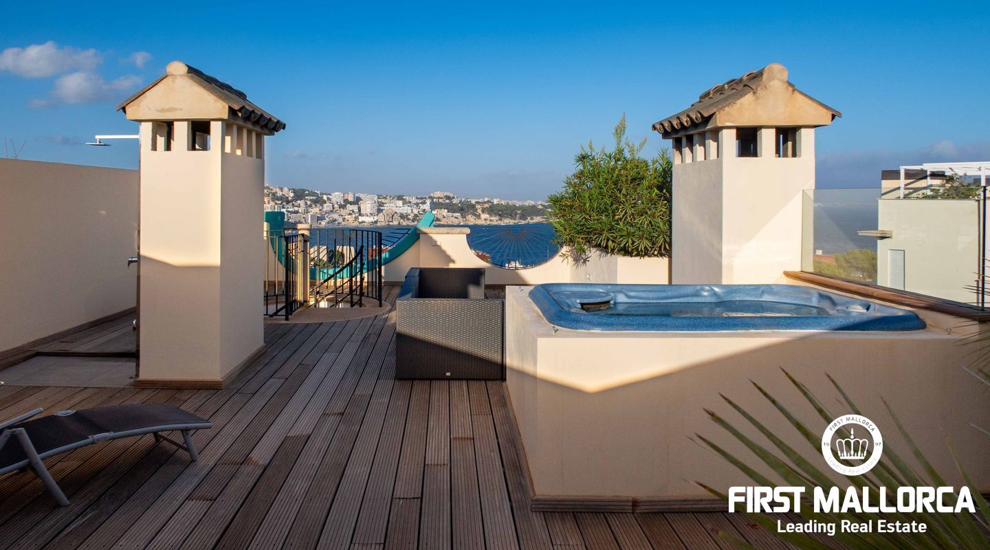 Dieses renovierte Penthouse mit 3 Schlafzimmern besticht durch einen offenen Wohn- und Essbereich mit offener Küche, die einen schönen Meerblick über Cala Nova und Marivent bietet. Das große Wohnzimmer hat einen offenen Kamin und ist durch große Schiebefenster mit der überdachten Terrasse verbunden, die zum Draußensitzen mit Blick auf das Tramuntana-Gebirge, Palma Stadt und die Bucht von Palma einlädt.