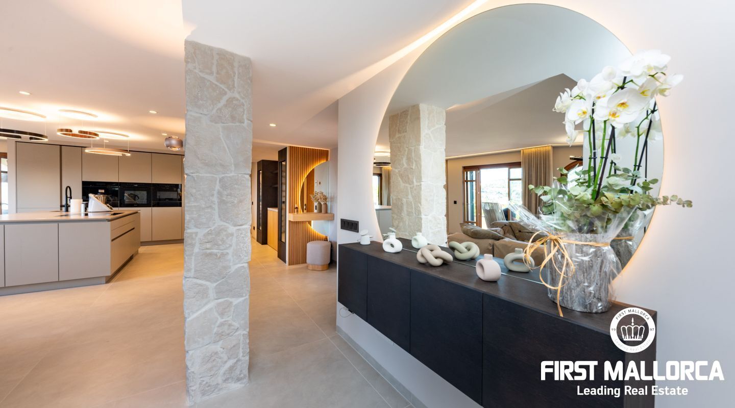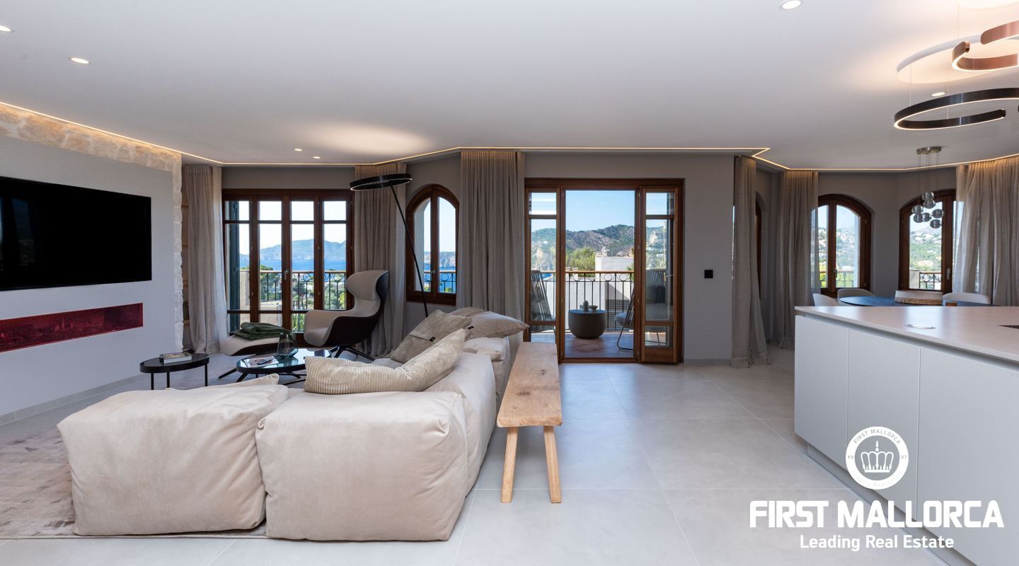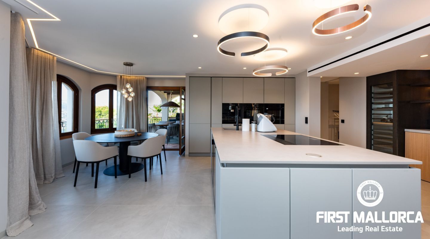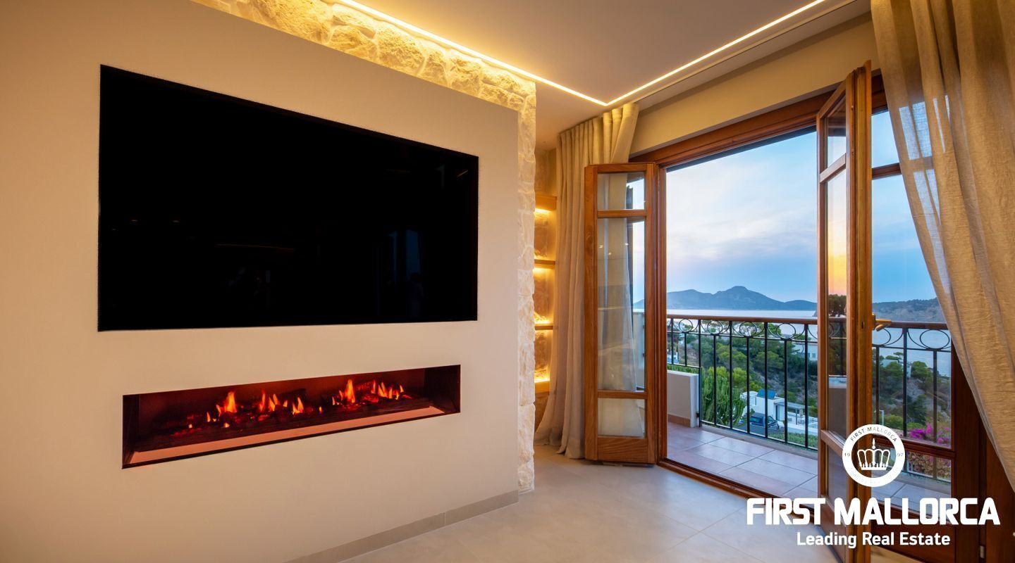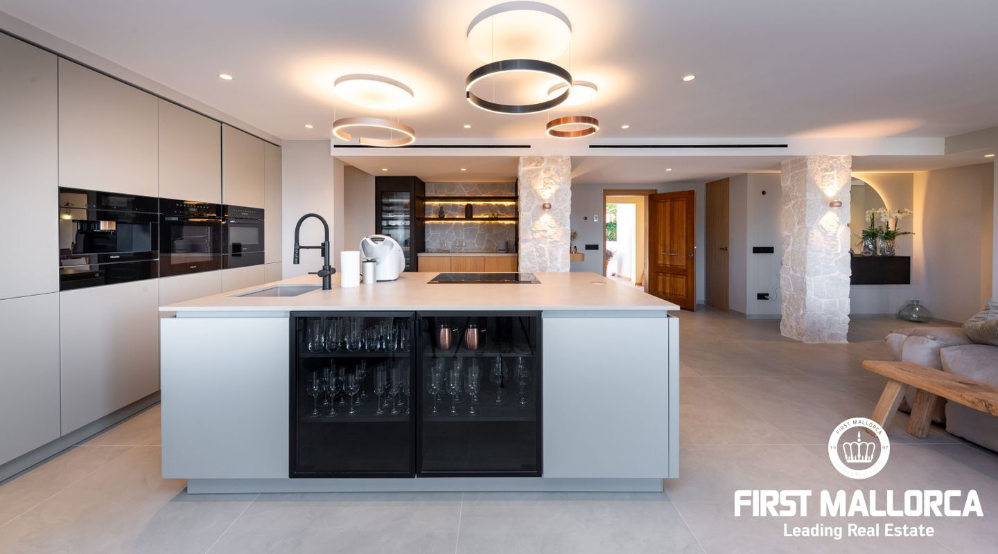 Die Küche ist offen gestaltet, mit Kücheninsel und hochwertigen Geräten ausgestattet. Das angrenzende Wohnzimmer mit elektrischem Kaminfeuer, direktem Blick auf das Meer und Dragonera ist geräumig genug für Familie und Freunde, auch hier gibt es Terrassenzugang.
