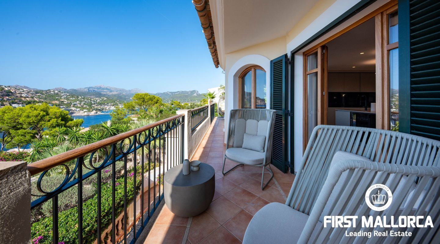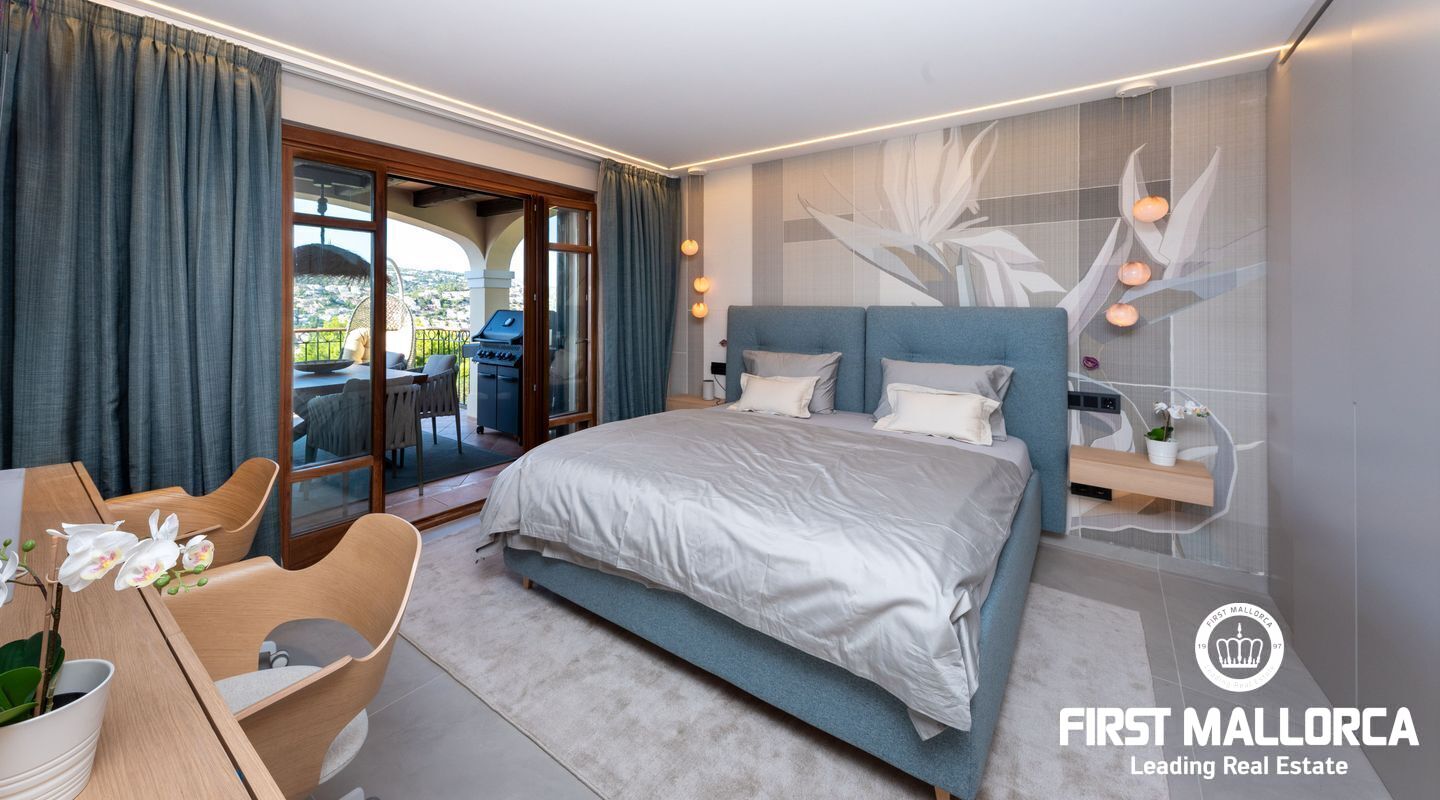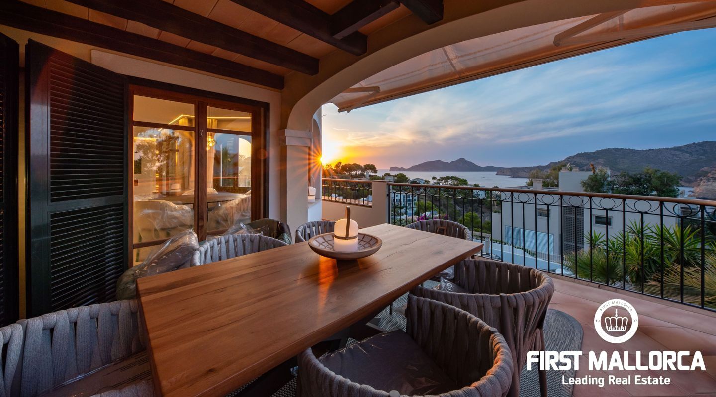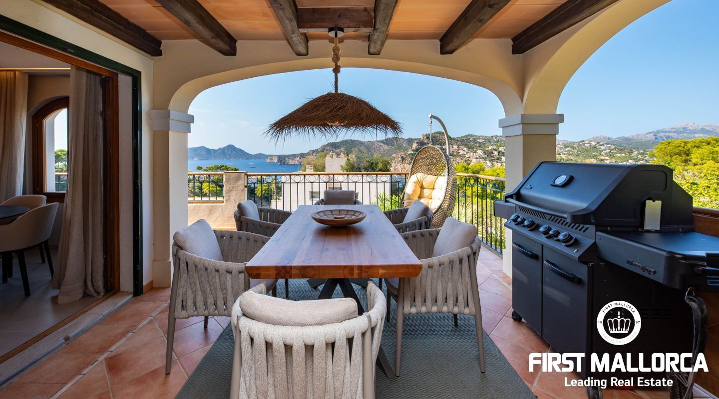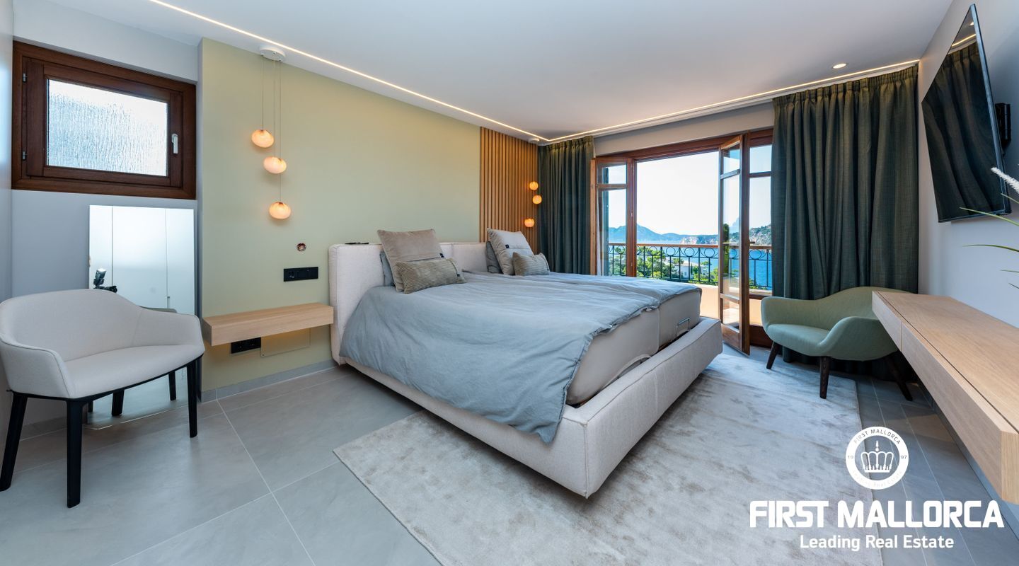 Die Küche ist offen gestaltet, mit Kücheninsel und hochwertigen Geräten ausgestattet. Das angrenzende Wohnzimmer mit elektrischem Kaminfeuer, direktem Blick auf das Meer und Dragonera ist geräumig genug für Familie und Freunde, auch hier gibt es Terrassenzugang.